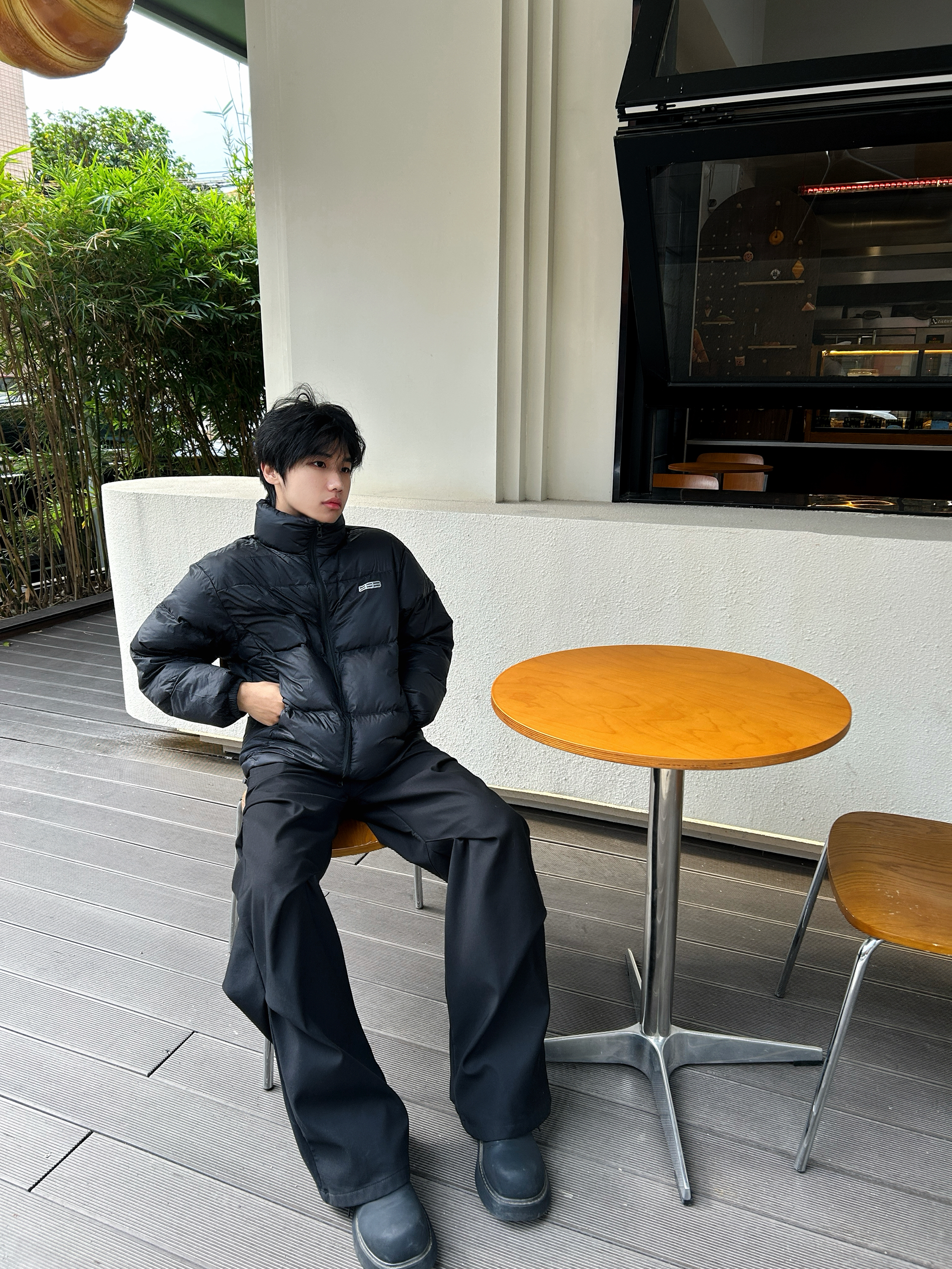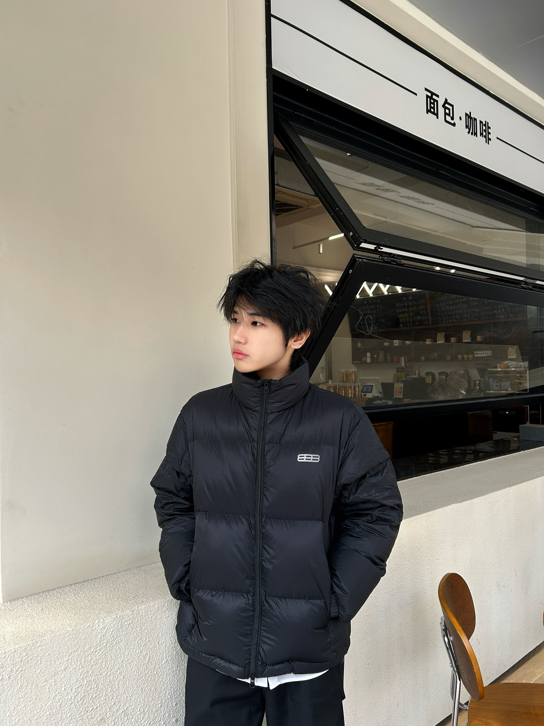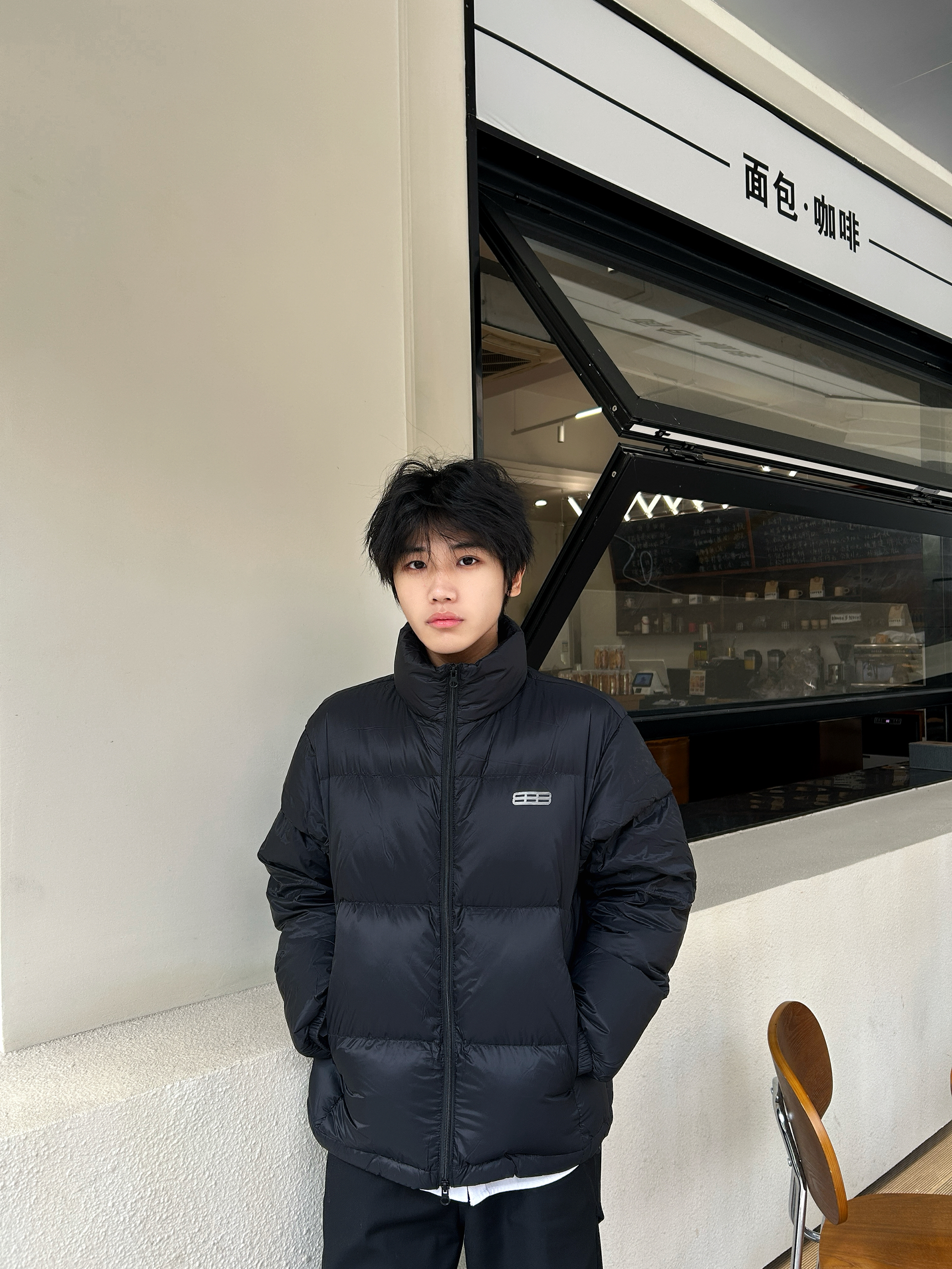 风裹着凉意往领口钻 全黑套装刚好裹住温度 哑光羽绒的蓬松感中和了黑裤的利落 后背的线条标记得劲儿又不抢戏 像把冬天的暖与帅揉成了随手一套的松弛 不用费神就能焊死冬日氛围感 暖得好看才是真本事