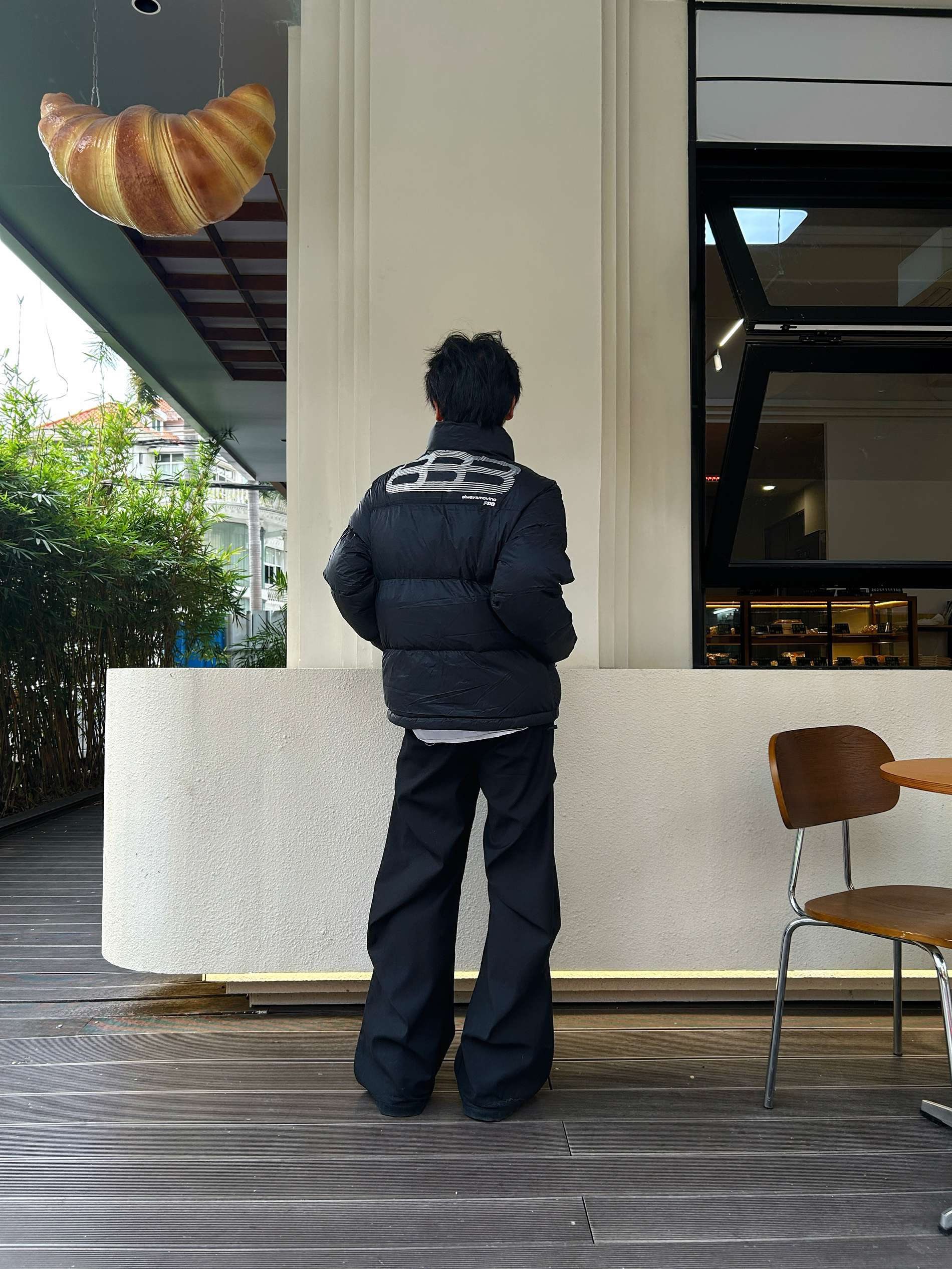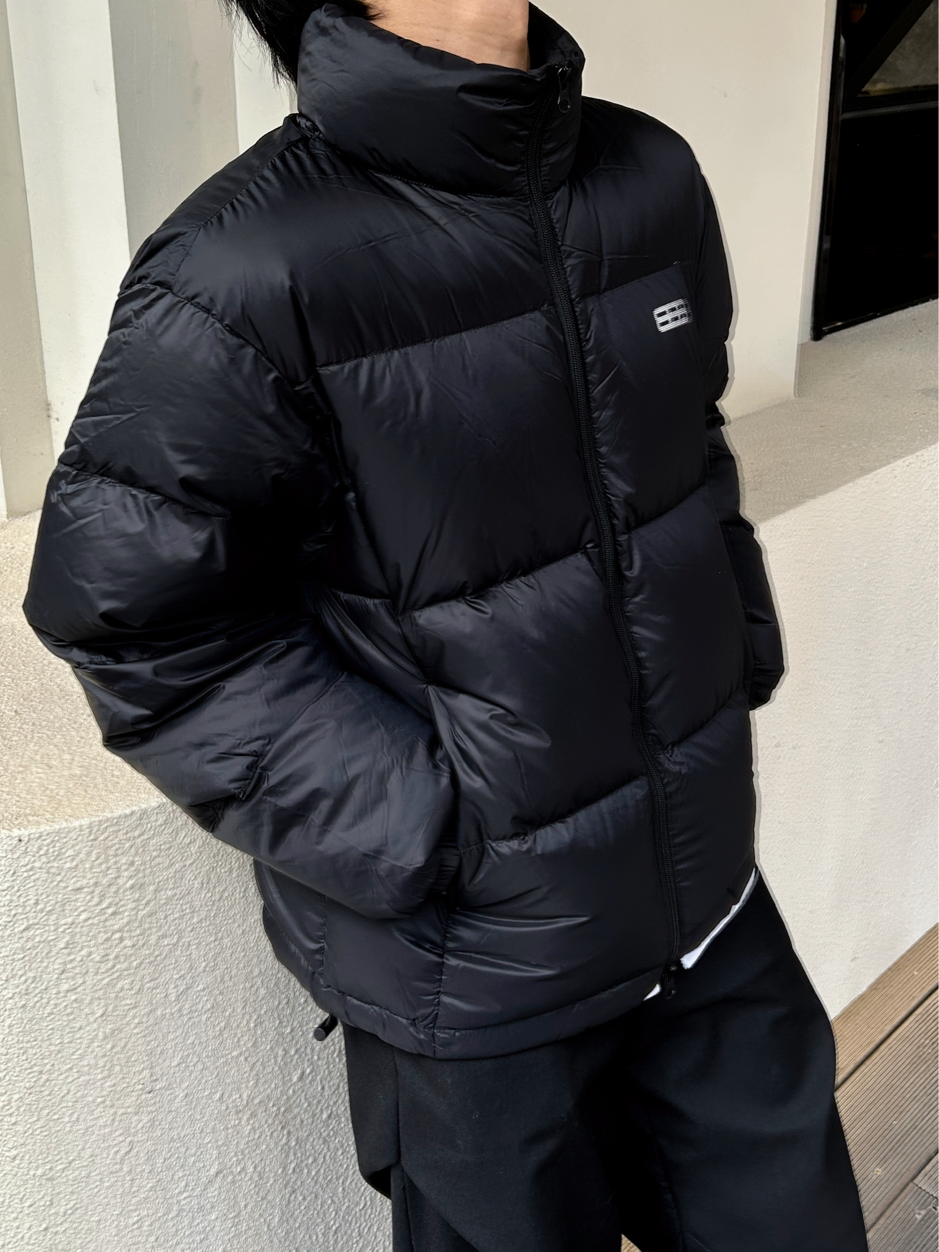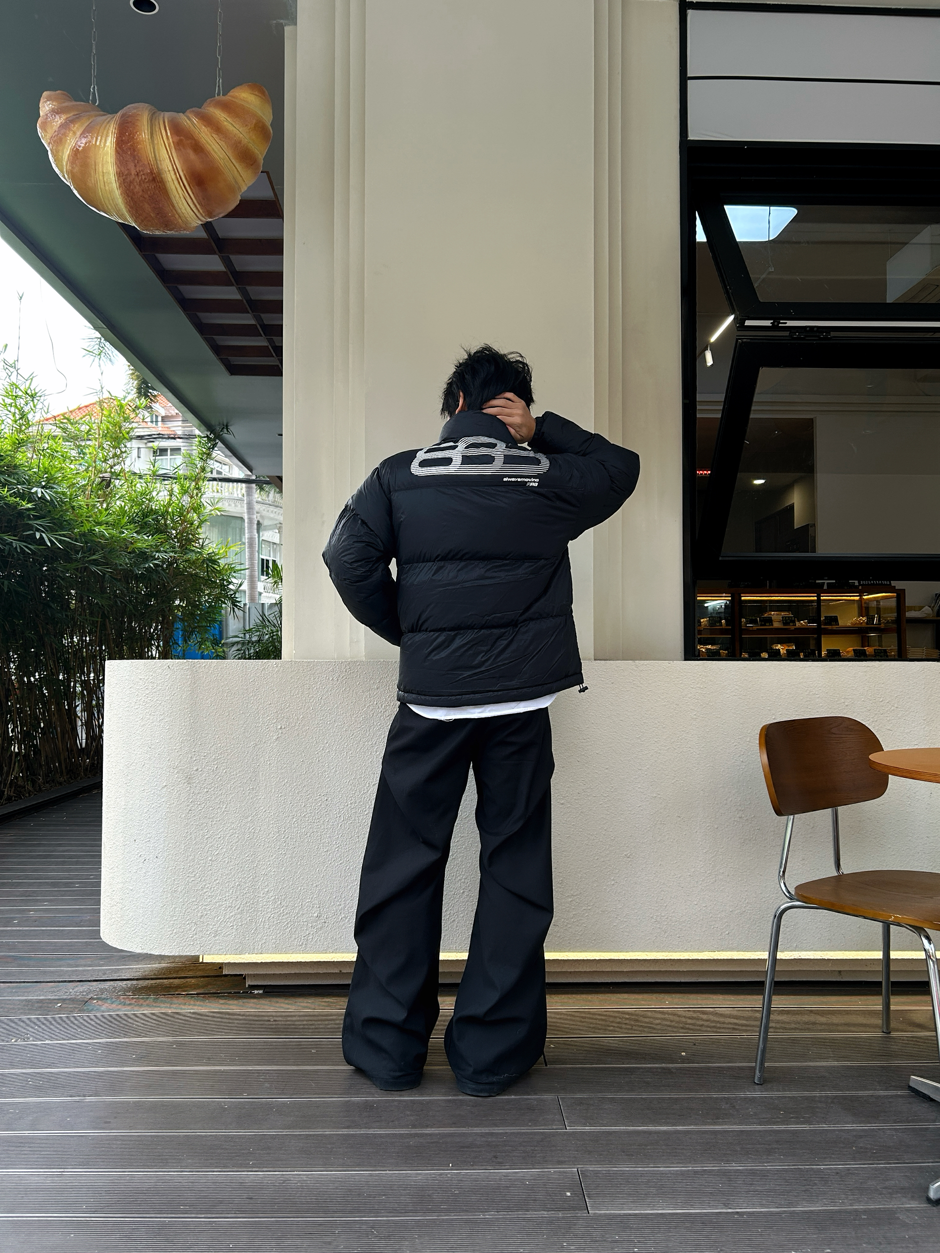 风裹着凉意往领口钻 全黑套装刚好裹住温度 哑光羽绒的蓬松感中和了黑裤的利落 后背的线条标记得劲儿又不抢戏 像把冬天的暖与帅揉成了随手一套的松弛 不用费神就能焊死冬日氛围感 暖得好看才是真本事