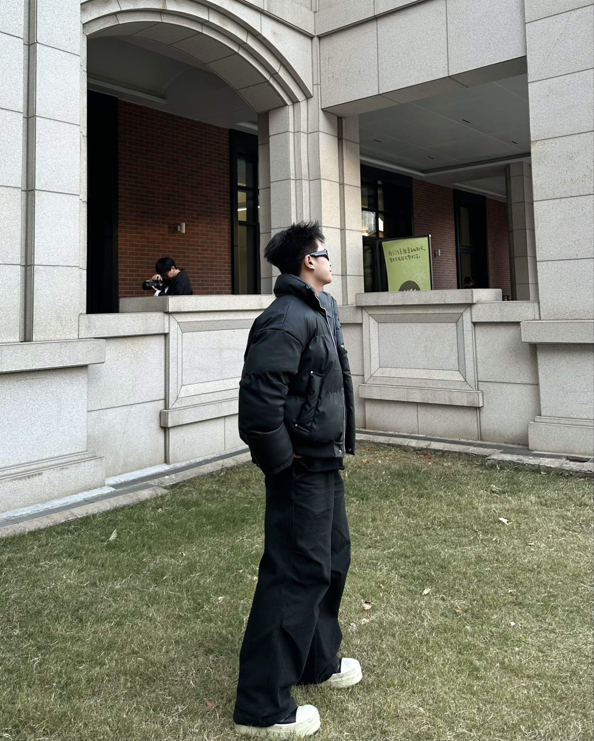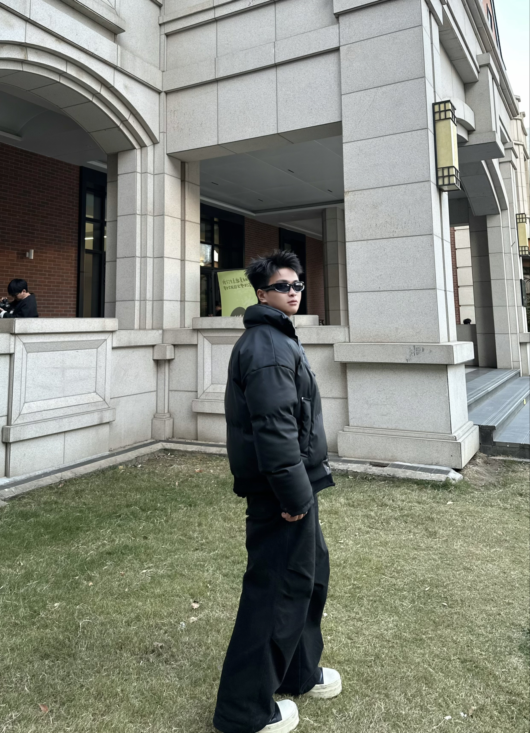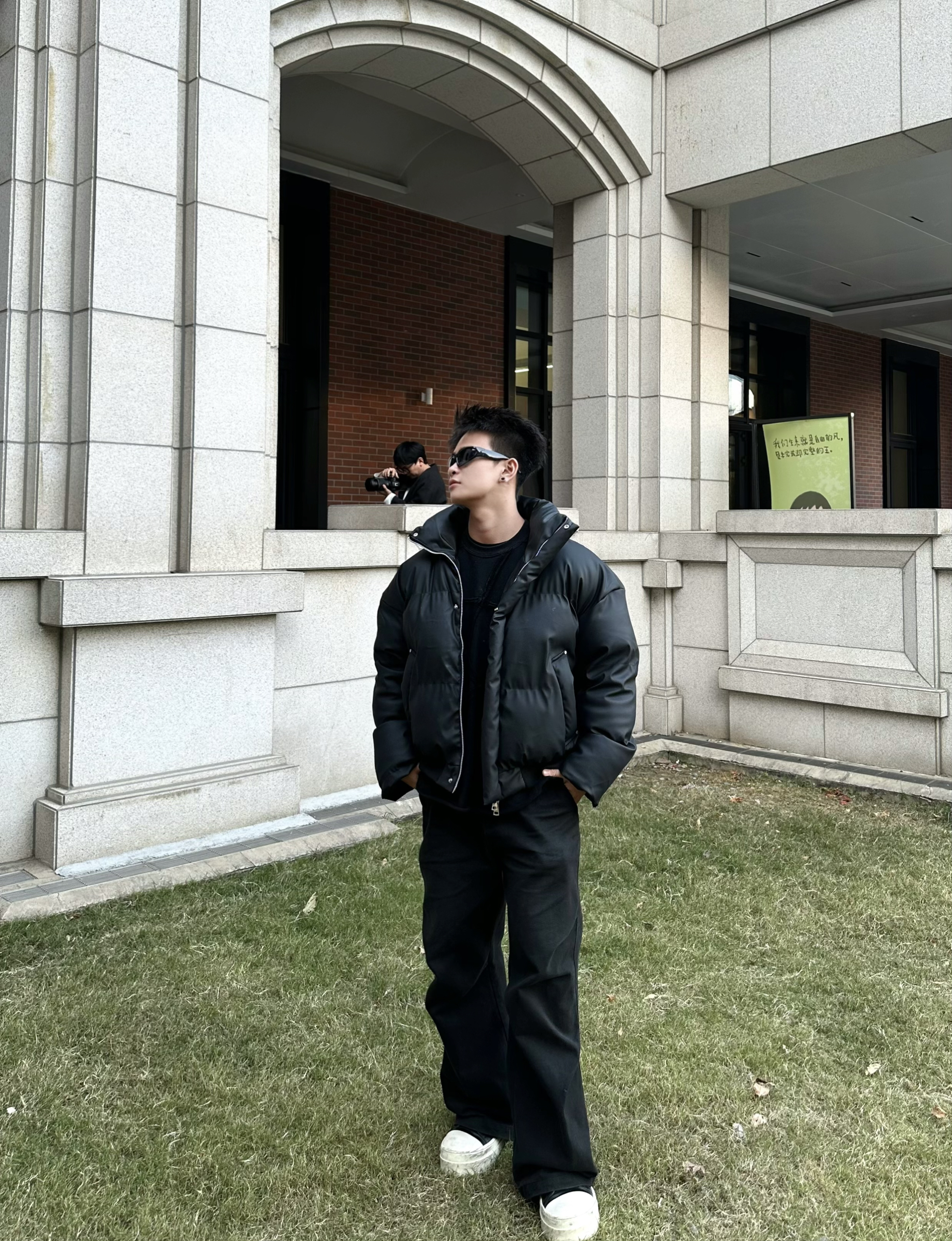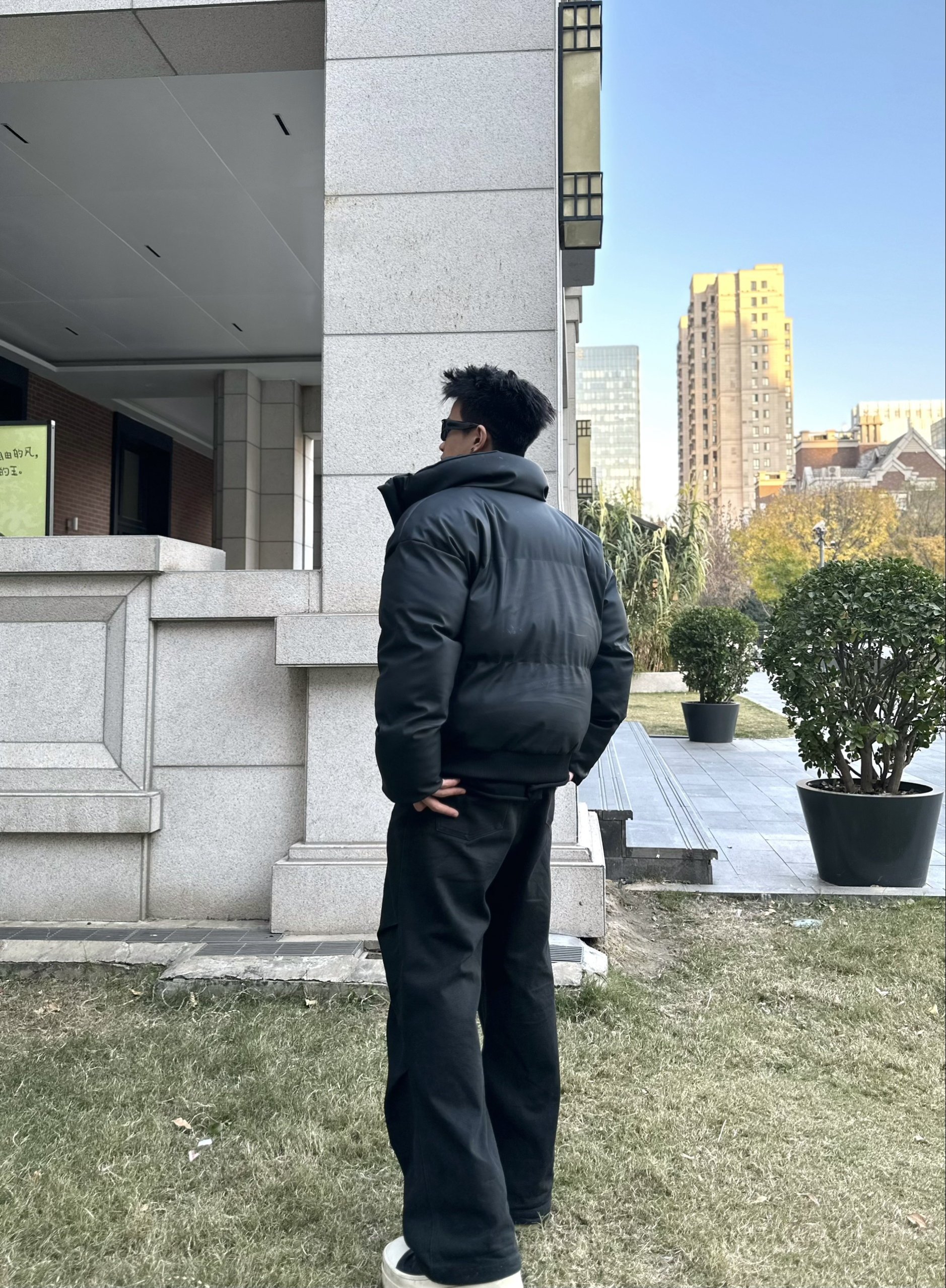 “今天是全黑松弛感穿搭🖤 “羽绒服选的是短款立领款,皮质面料自带哑光高级感蓬松度刚好不会显壮,小个子也能hold住” “阔腿裤是垂感强的厚面料,裤长盖过鞋面的‘堆积感’刚好踩中今年的松弛风,和短款外套搭着显腿长” “内搭选了基础款黑T,极简叠穿不抢戏,墨镜一戴直接把氛围感拉满~” 177 69 M/L