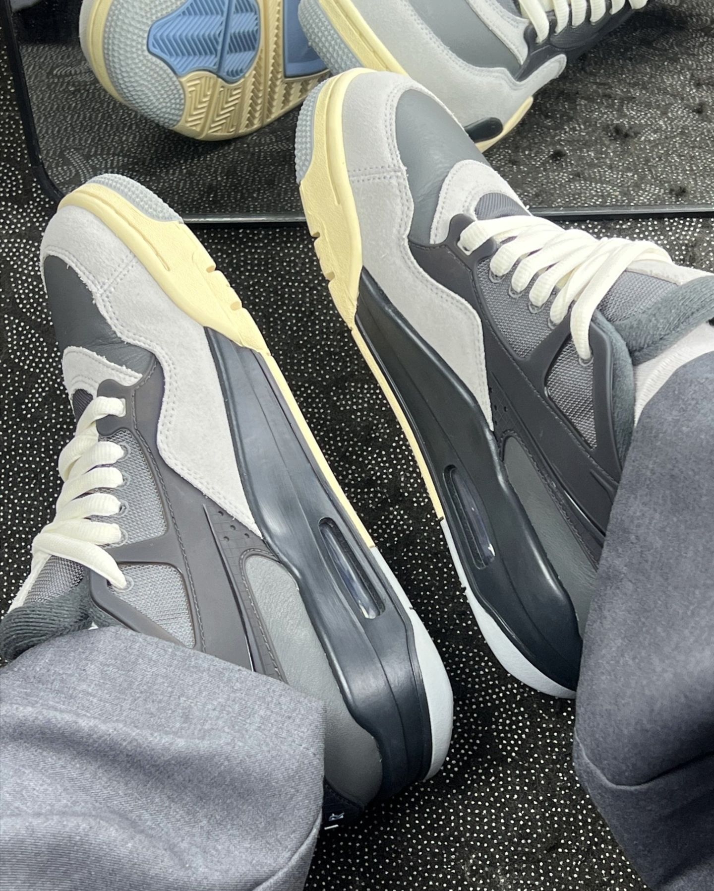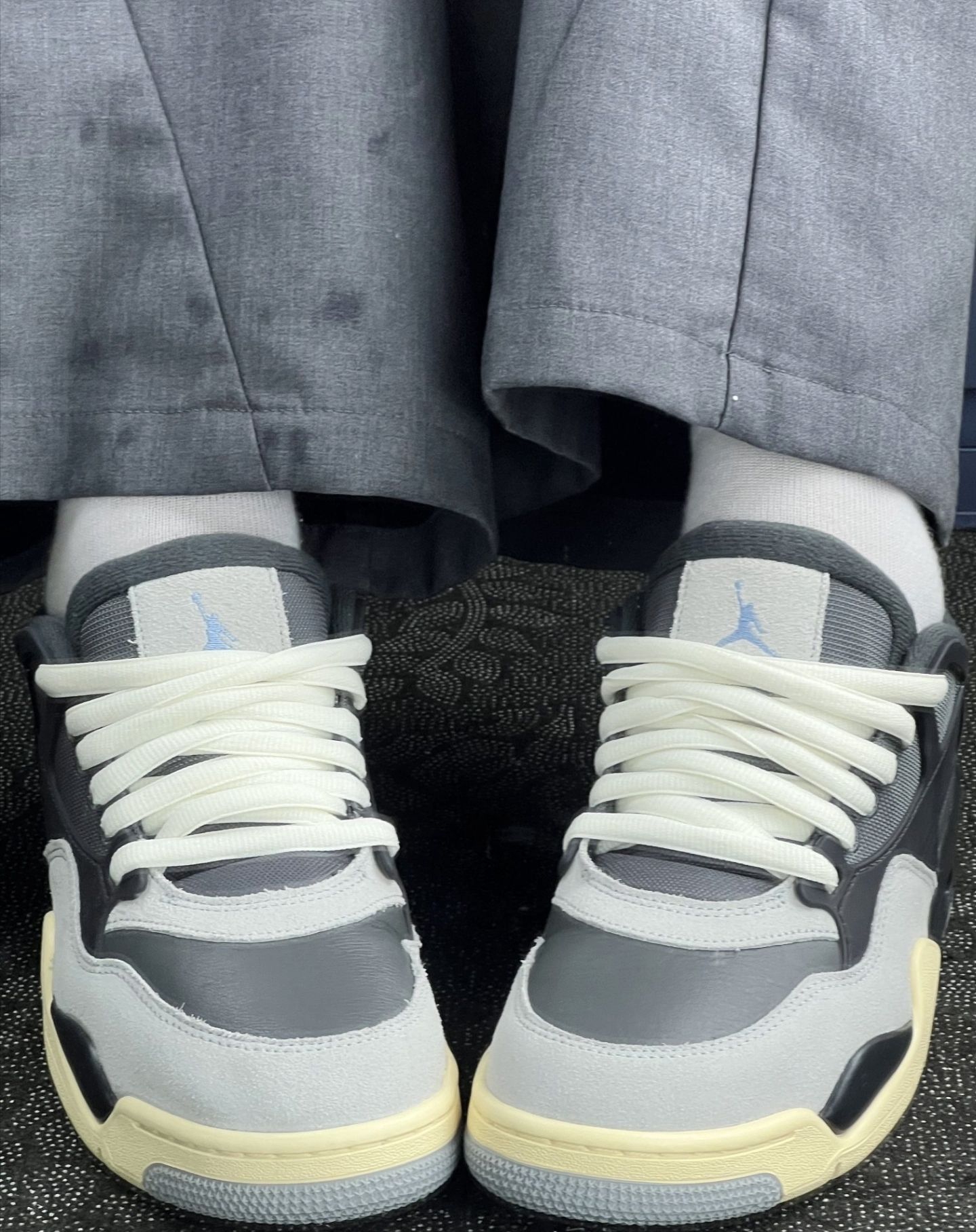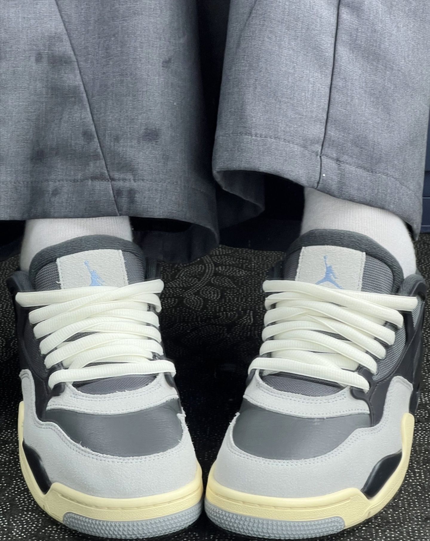 今天的灰调心情,被这双带点蓝调的“小阴天”稳稳接住了。 米黄外底踩着复古的风,鞋舌上的飞人悄悄给穿搭加了点跳脱的呼吸感,连裤脚扫过鞋面的瞬间,都像给日常加了层温柔的滤镜