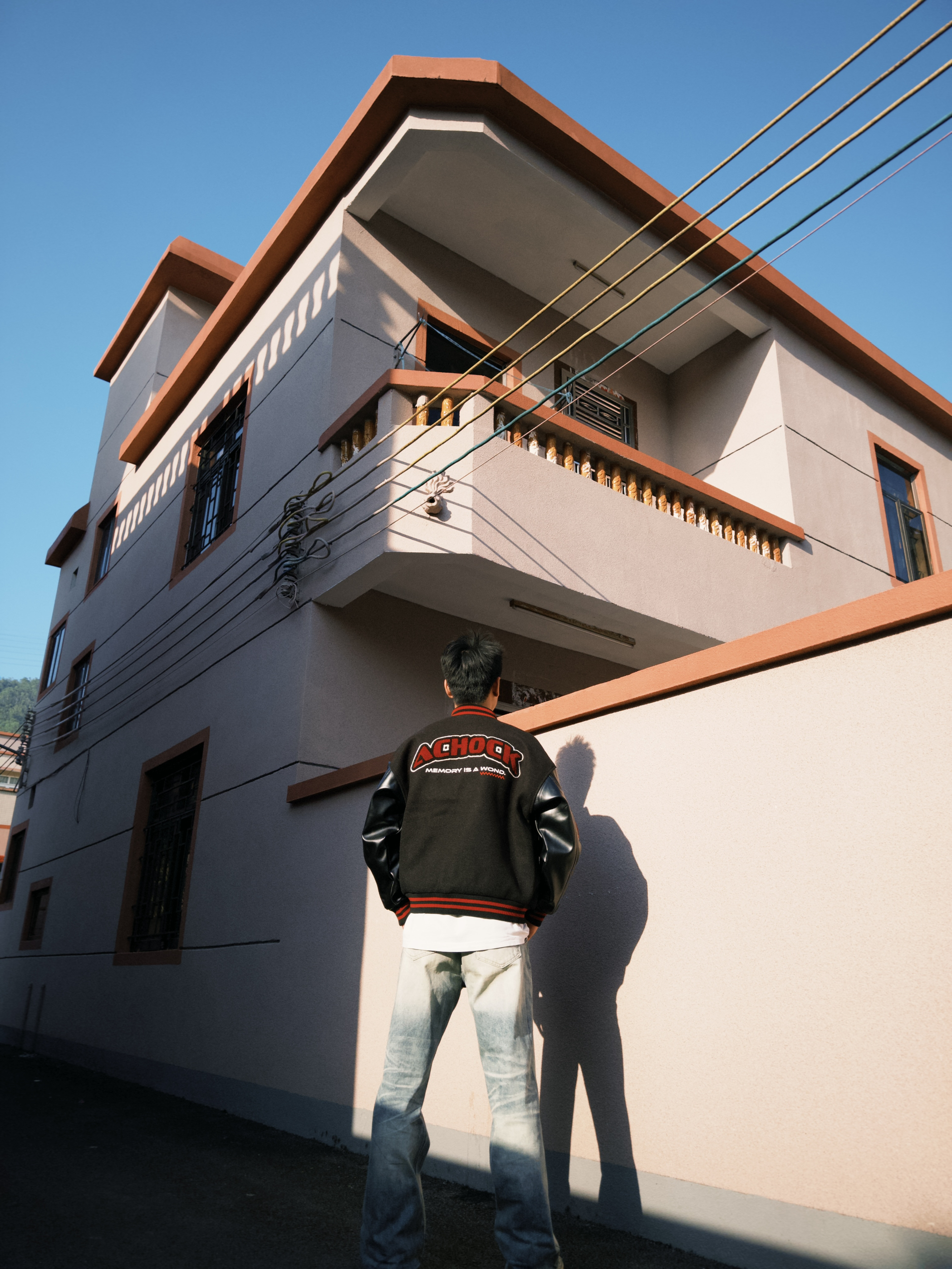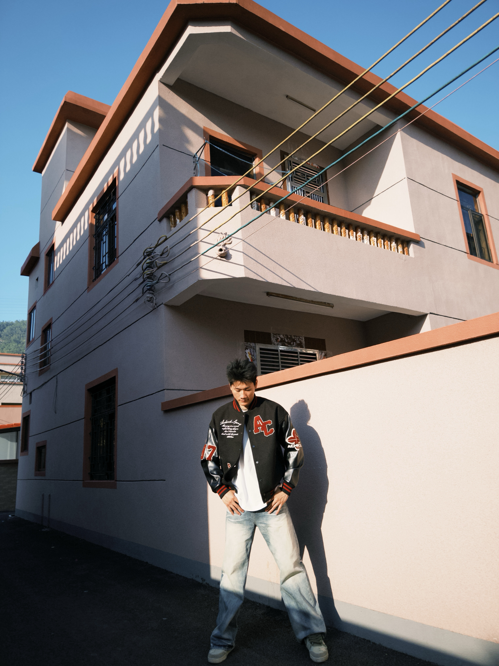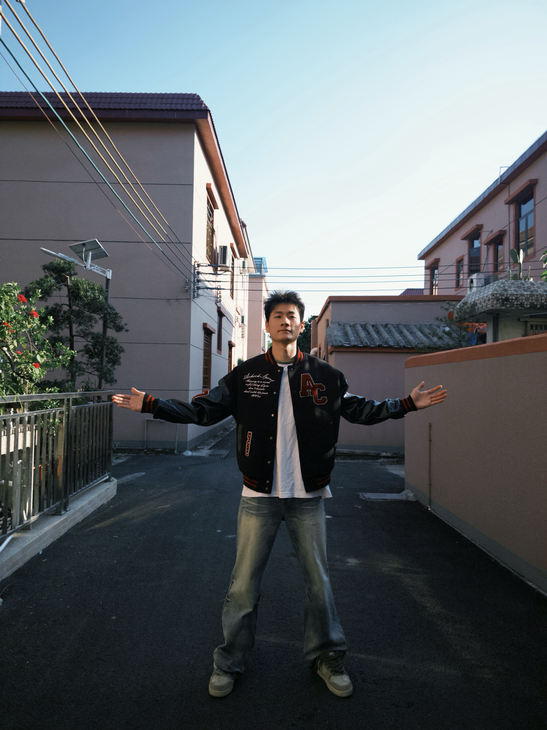 “这棒球服最近天天穿——黑红配色搭啥都不违和,白T+浅裤一配就有复古调,皮质袖子软乎乎的不硬挺,阳台扒栏杆靠半天也不勒肩。现在这温度穿刚好,风大点裹着也不凉,动起来还没束缚感,属于‘舒服到忘了穿外套’的款。