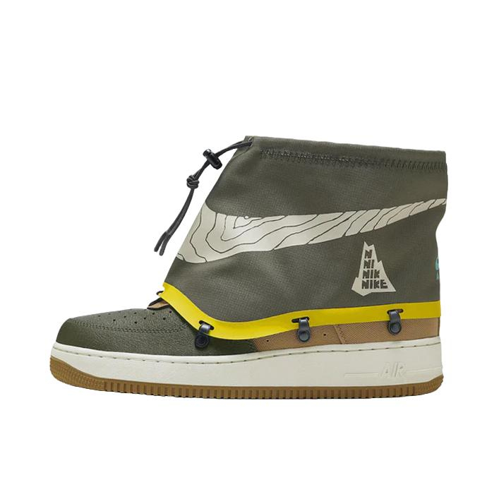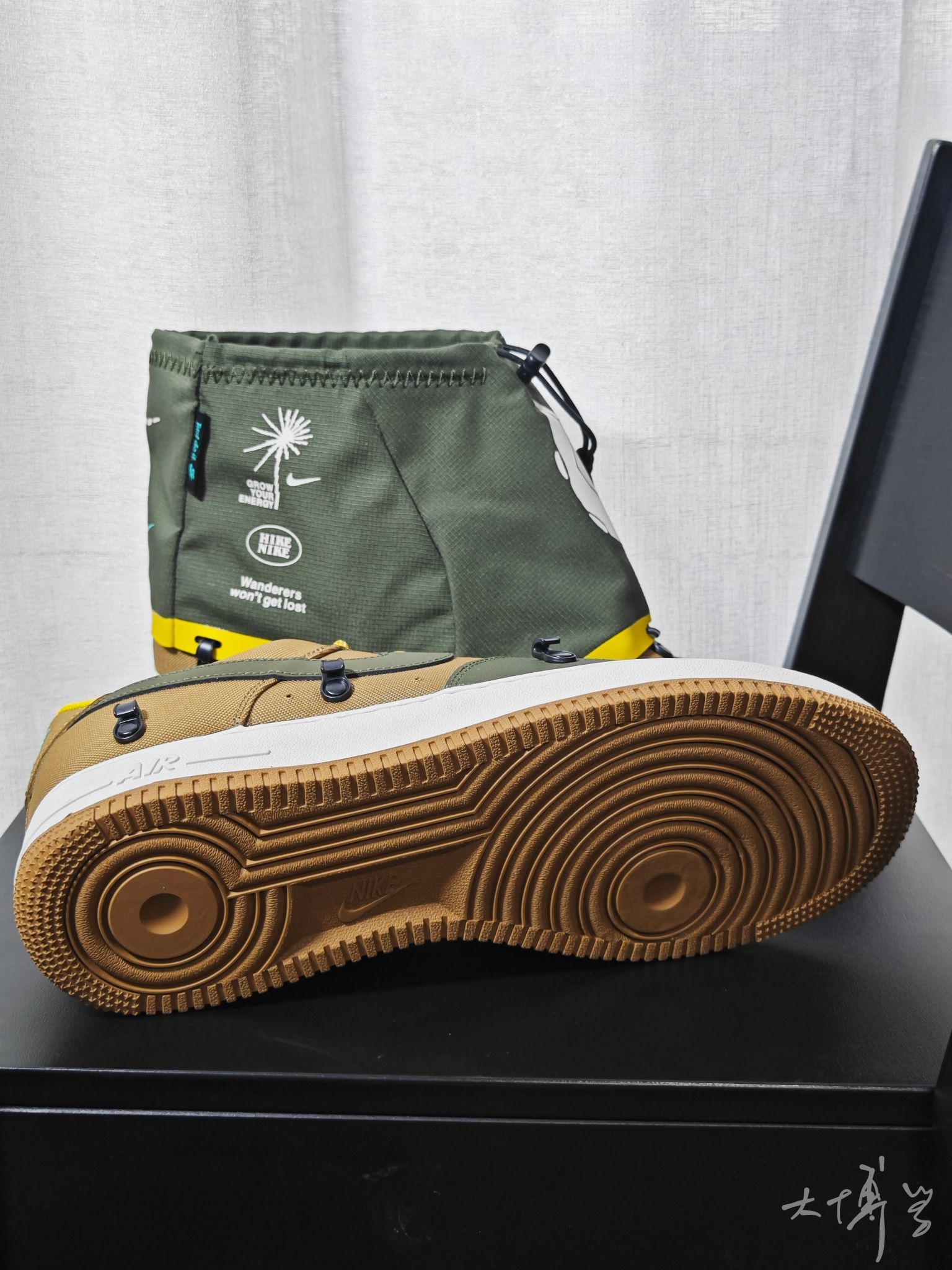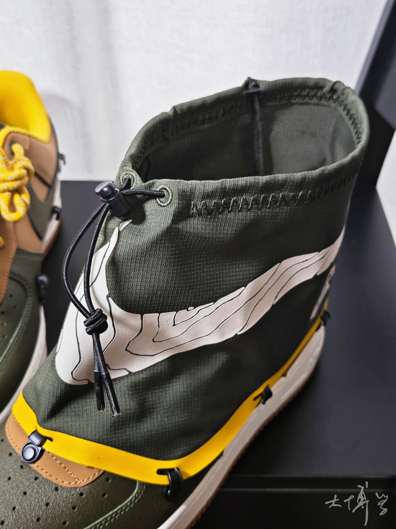 这不是一双普通的AF1 而是经过了机能化改造款 双形态玩法:自带可拆卸的防水鞋套,秒变“高帮靴” 鞋套印有线条化Swoosh 鞋身用橄榄绿/卡其色拼接 点缀亮黄色绳鞋带、青绿色刺绣Logo 复古军事风+撞色细节 鞋侧有金属扣环(固定鞋套) 鞋底是生胶色纹路底,整体做工扎实 很有趣的一双AF1