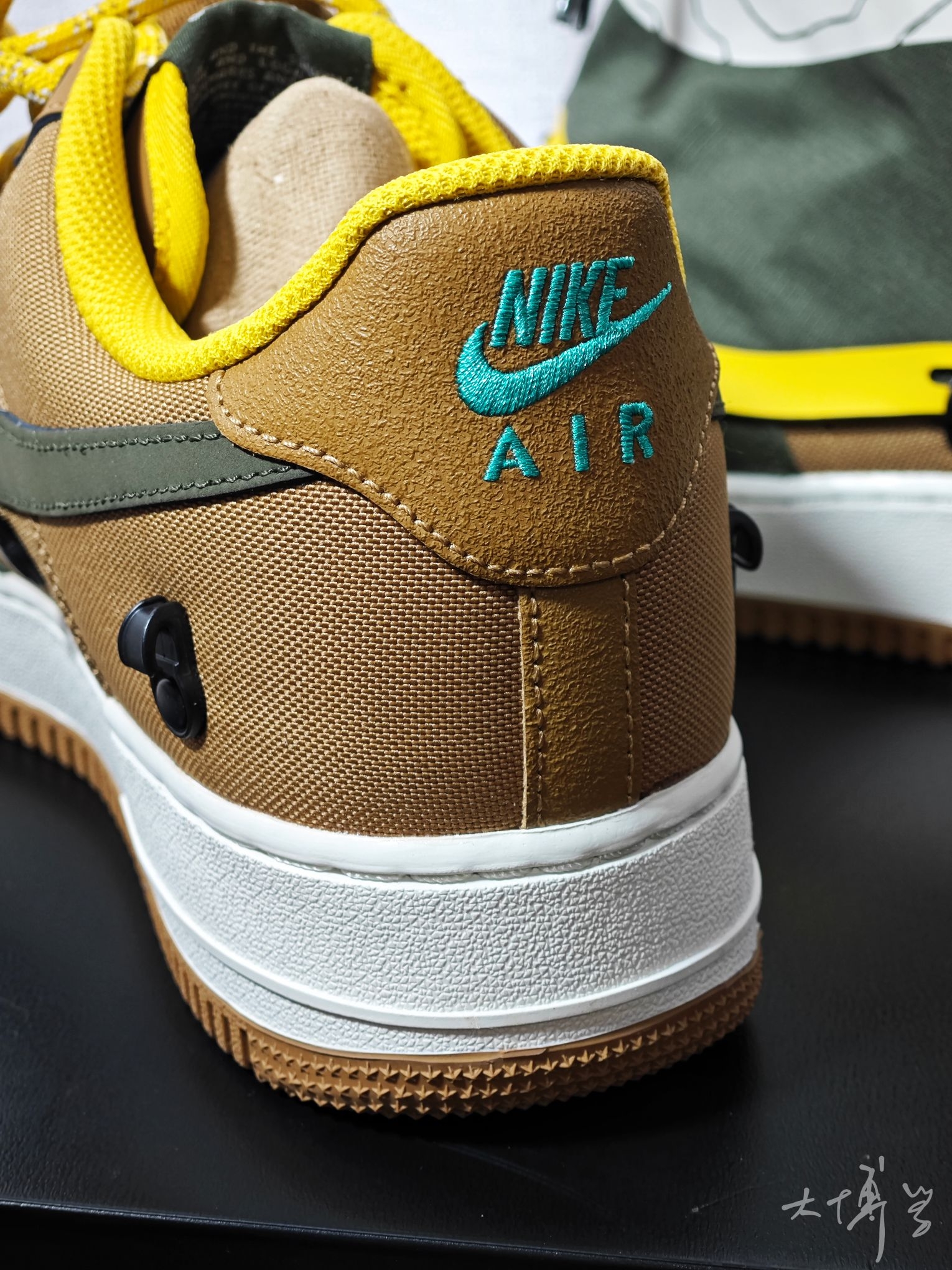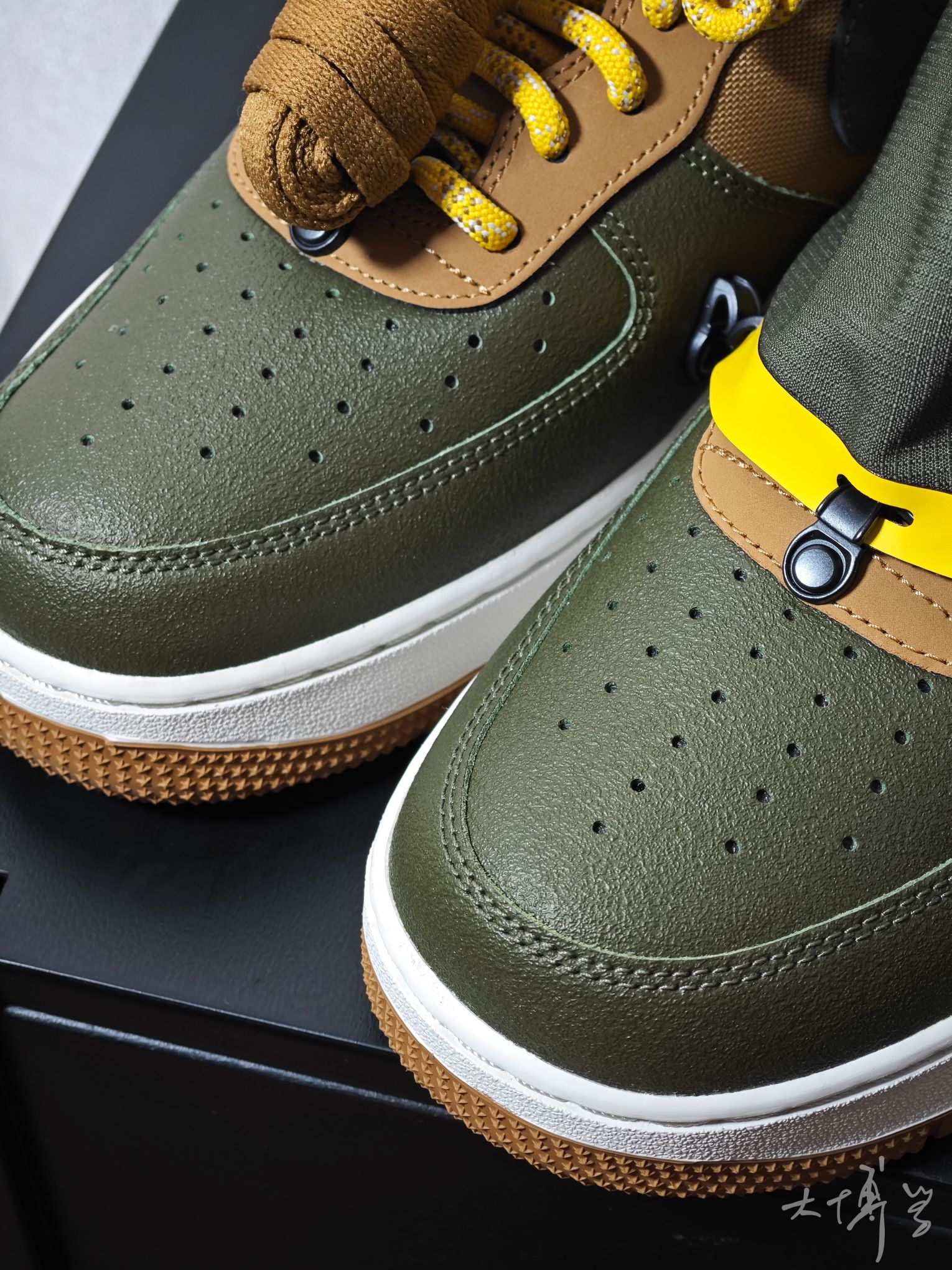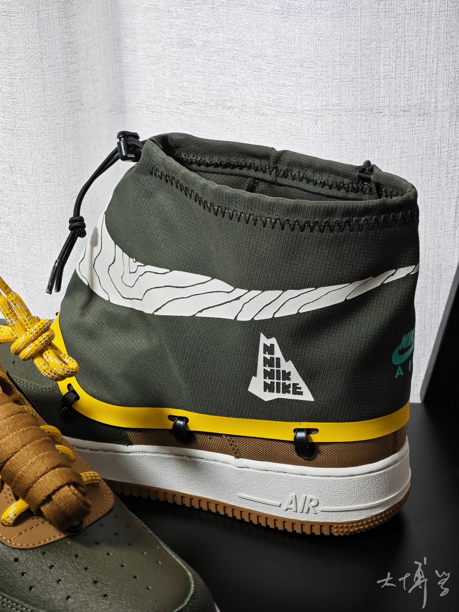 这不是一双普通的AF1 而是经过了机能化改造款 双形态玩法:自带可拆卸的防水鞋套,秒变“高帮靴” 鞋套印有线条化Swoosh 鞋身用橄榄绿/卡其色拼接 点缀亮黄色绳鞋带、青绿色刺绣Logo 复古军事风+撞色细节 鞋侧有金属扣环(固定鞋套) 鞋底是生胶色纹路底,整体做工扎实 很有趣的一双AF1