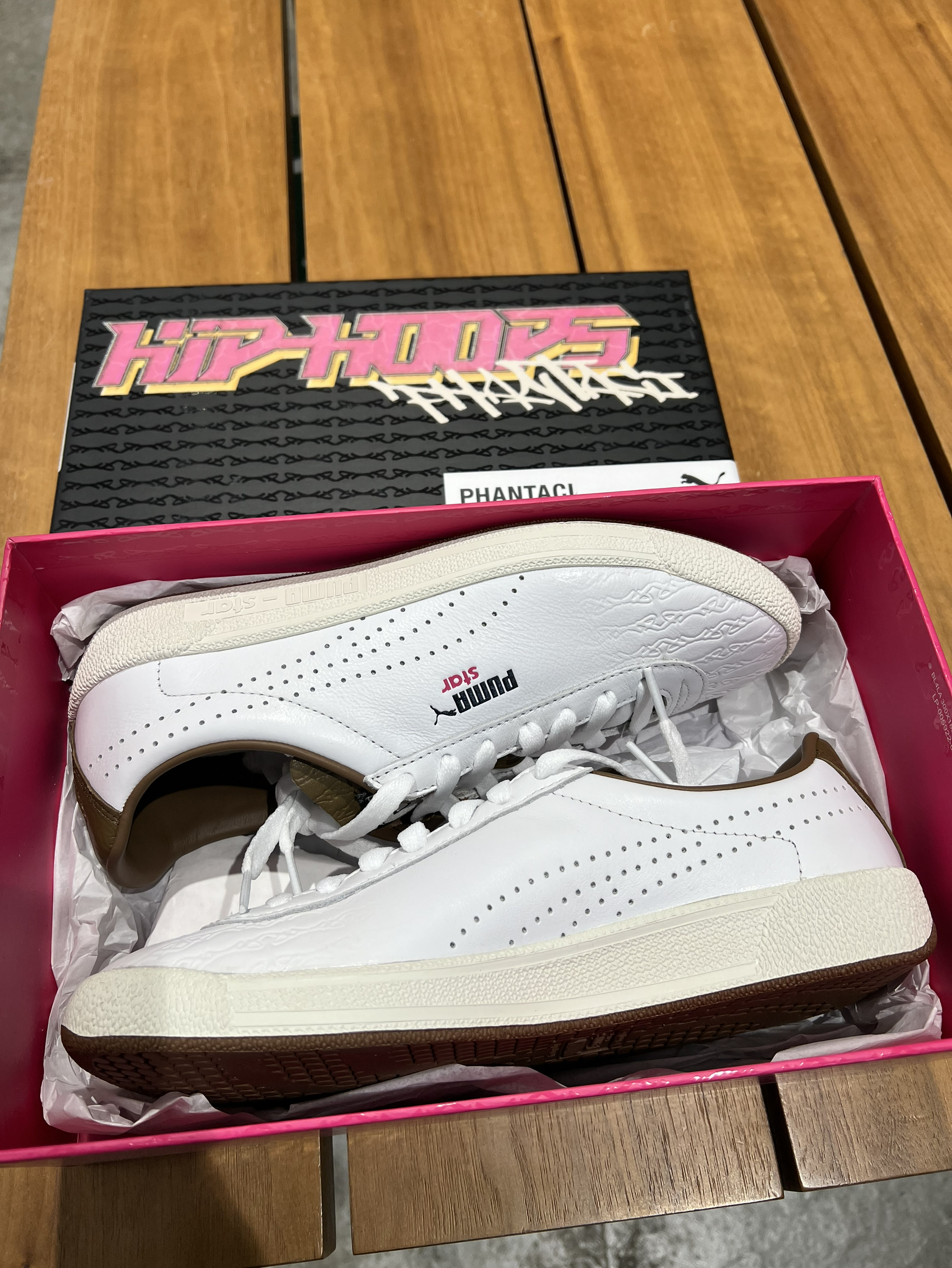 谁能拒绝周董主理的PHANTACI和PUMA的联名鞋?刚拿到手就被这波「嘻哈王子」主题的包装戳中——黑盒配粉紫撞色字体,直接把90年代街头感拉满💥 鞋子本身是经典的PUMA Star鞋型,奶白皮革+做旧生胶底,复古味够正;鞋身藏着PHANTACI标志性的链条暗纹,细节控狂喜!鞋舌和鞋垫的联名标识、棕调内衬的鳄鱼纹压花,每处都透着联名的精致感。 脚感是板鞋里偏软的类型,日常通勤、搭牛仔裤/运动裤...