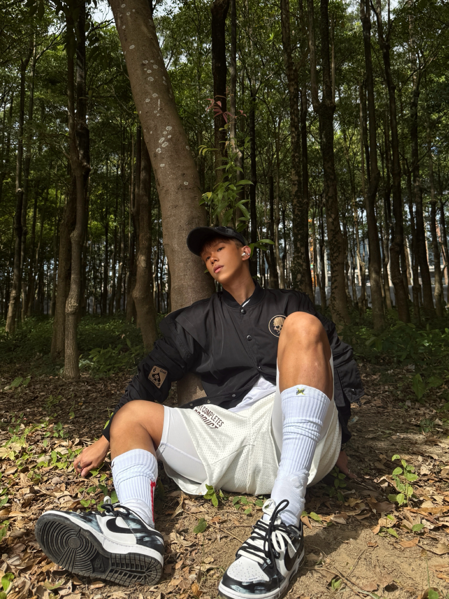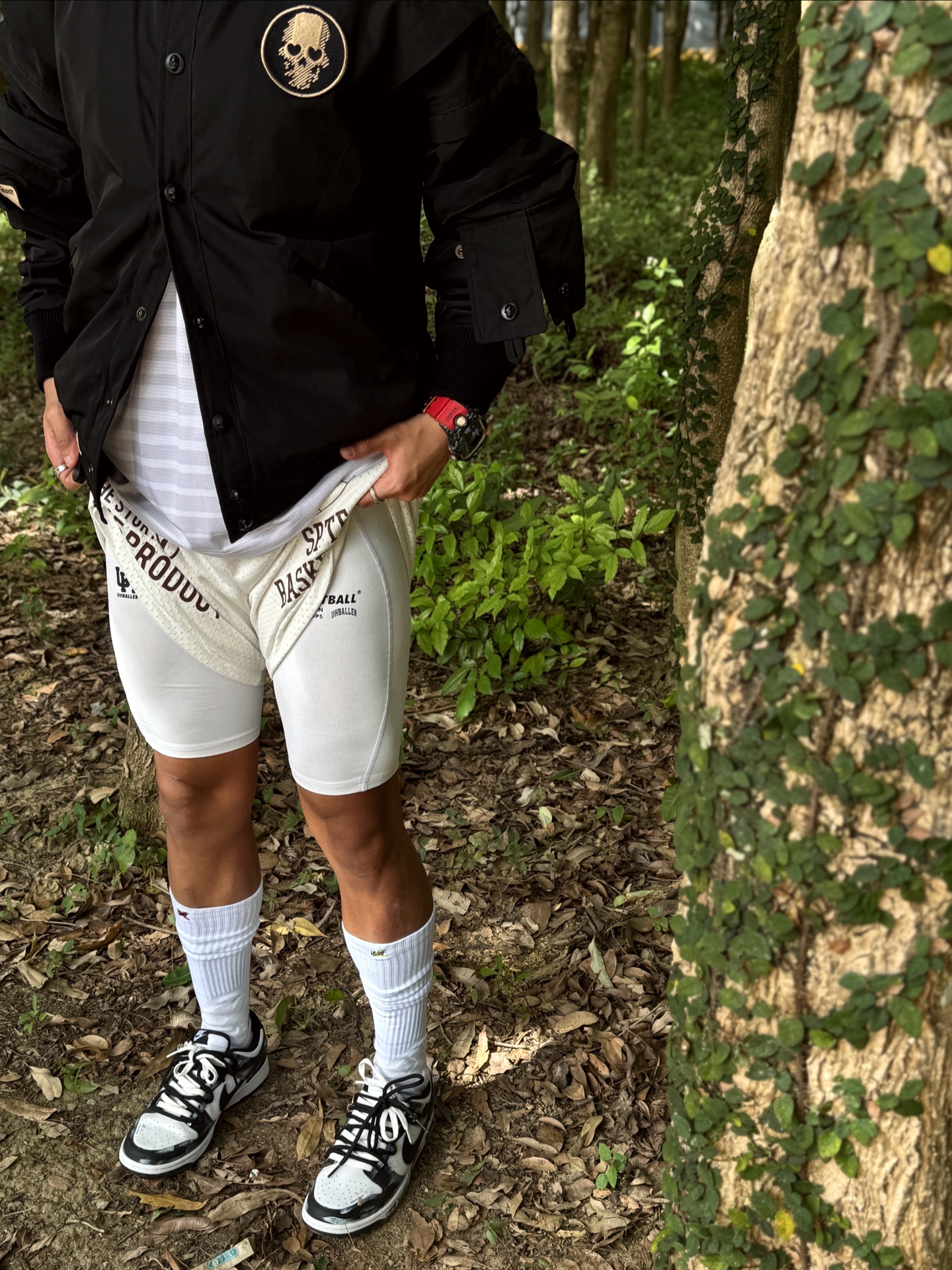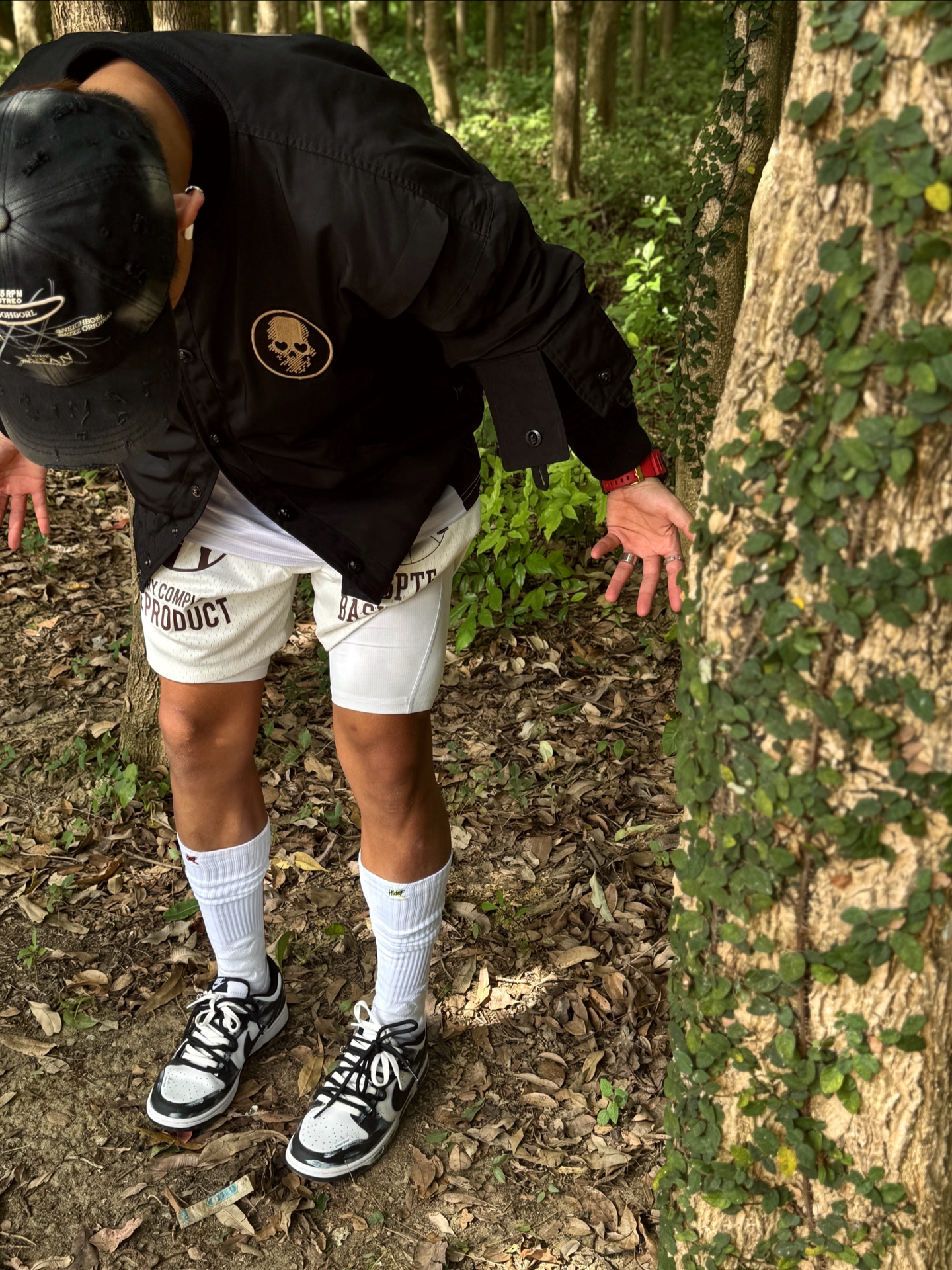 Hey bro‼️这里是小熊的穿搭日记 其实在南方的初冬真不用裹成粽子 今天浅浅试一下上厚下薄小心机 直接被朋友夸超会穿 上脚定制dunk死神曼巴 拿到手就被涂鸦和蛇纹Swoosh戳中 做旧刮擦的纹理在光线下真的超有质感 走在路上低头都感觉自己帅炸了 黑白双拼鞋带和今日黑夹克白短裤也很match 舒适经典的脚感 让我在树林里走一下午都不脚累 这波颜值实用双拿捏了🤌🏻 黑色机能风棒球服+条纹t...