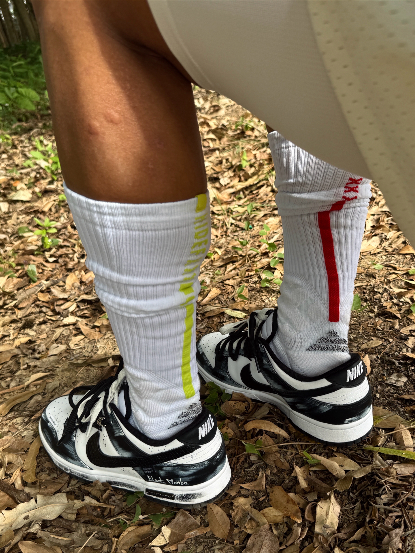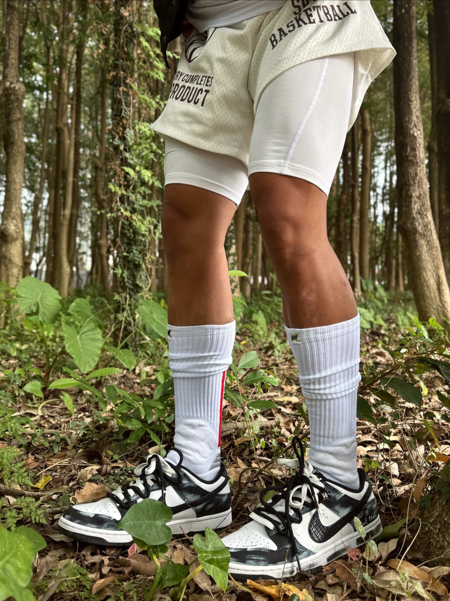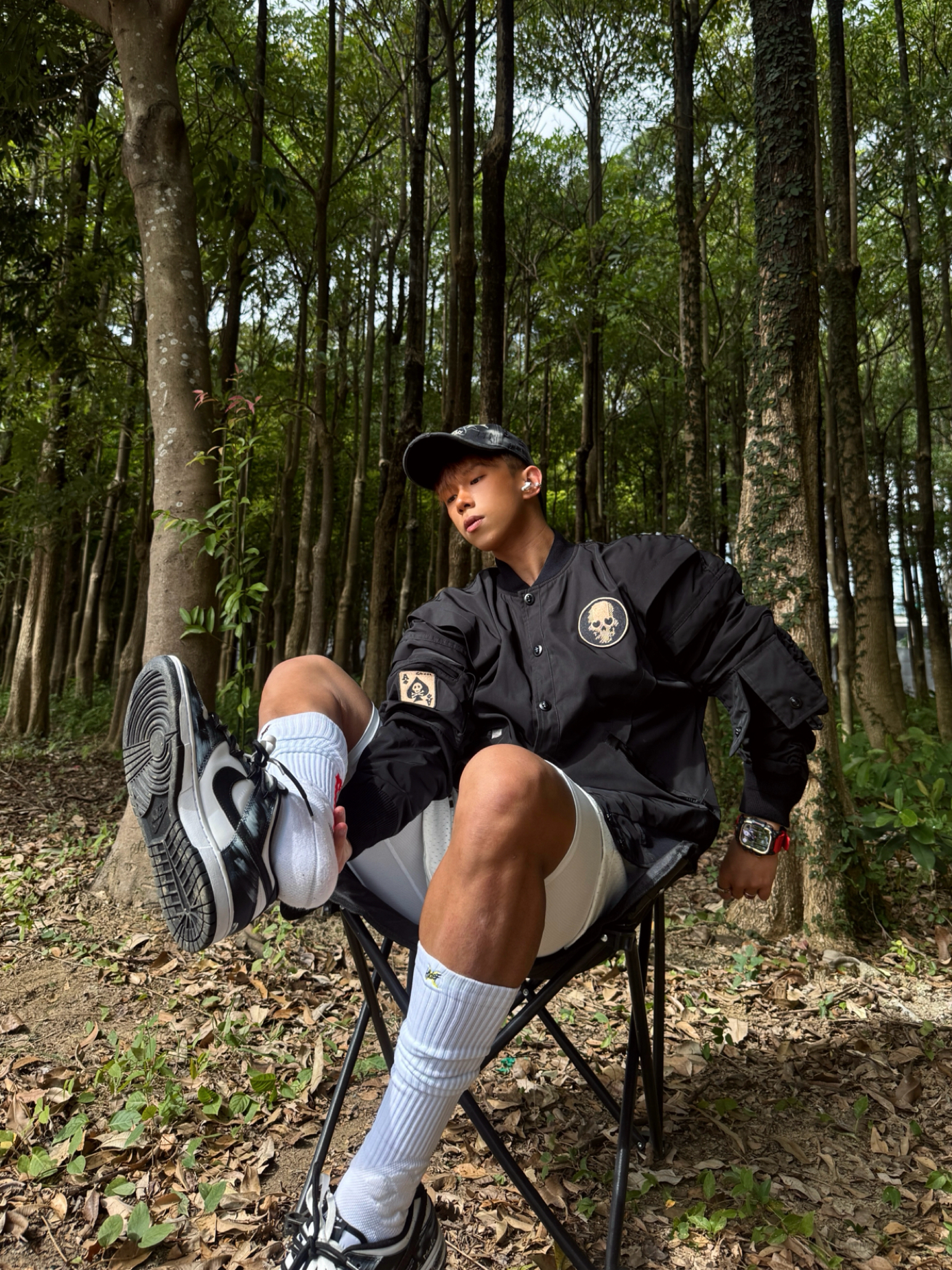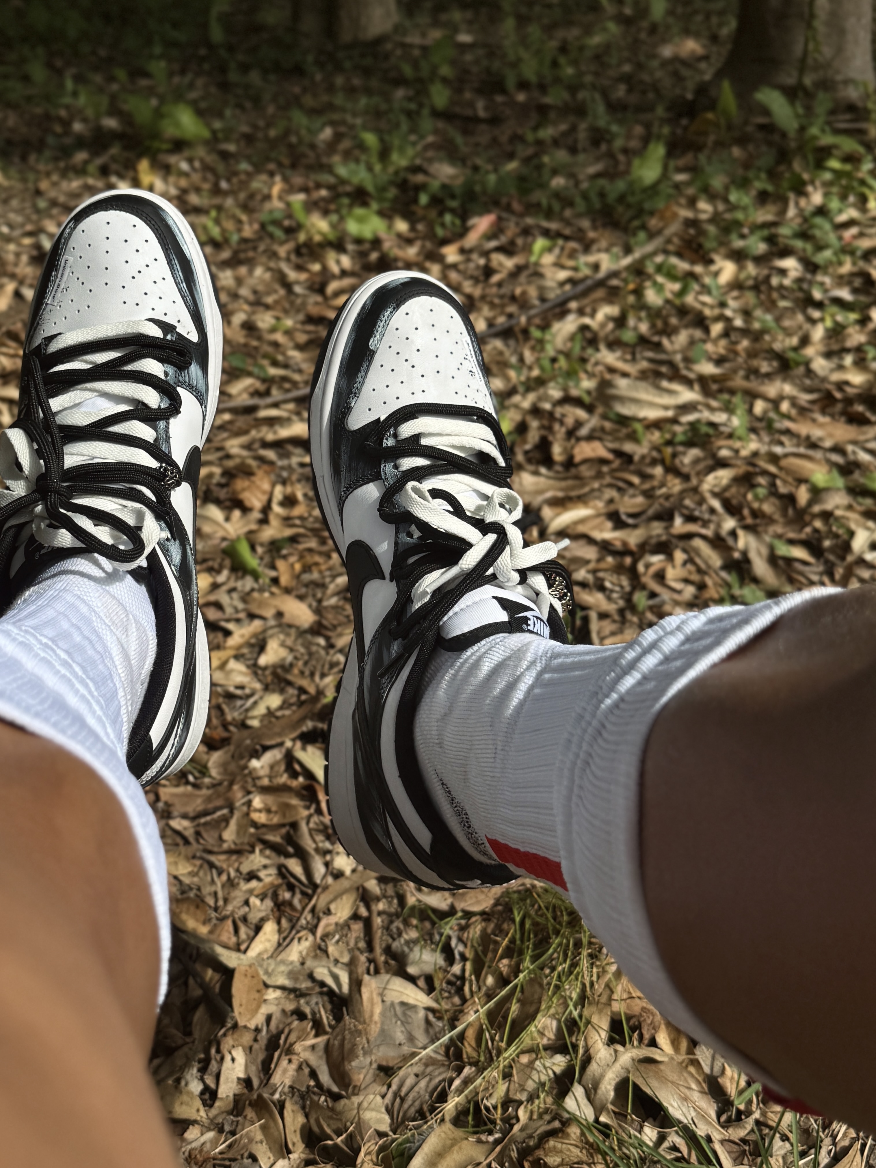 Hey bro‼️这里是小熊的穿搭日记 其实在南方的初冬真不用裹成粽子 今天浅浅试一下上厚下薄小心机 直接被朋友夸超会穿 上脚定制dunk死神曼巴 拿到手就被涂鸦和蛇纹Swoosh戳中 做旧刮擦的纹理在光线下真的超有质感 走在路上低头都感觉自己帅炸了 黑白双拼鞋带和今日黑夹克白短裤也很match 舒适经典的脚感 让我在树林里走一下午都不脚累 这波颜值实用双拿捏了🤌🏻 黑色机能风棒球服+条纹t...