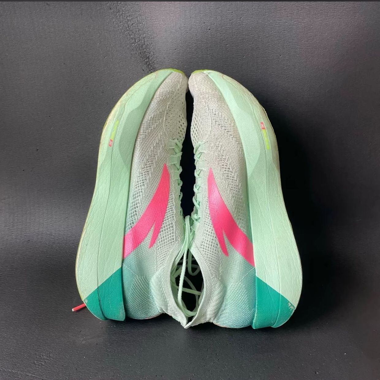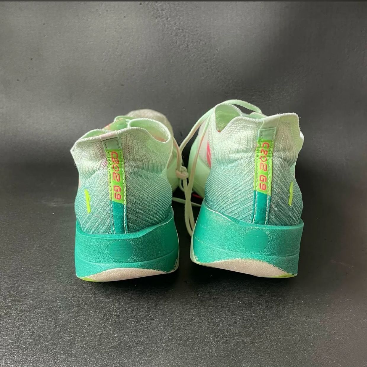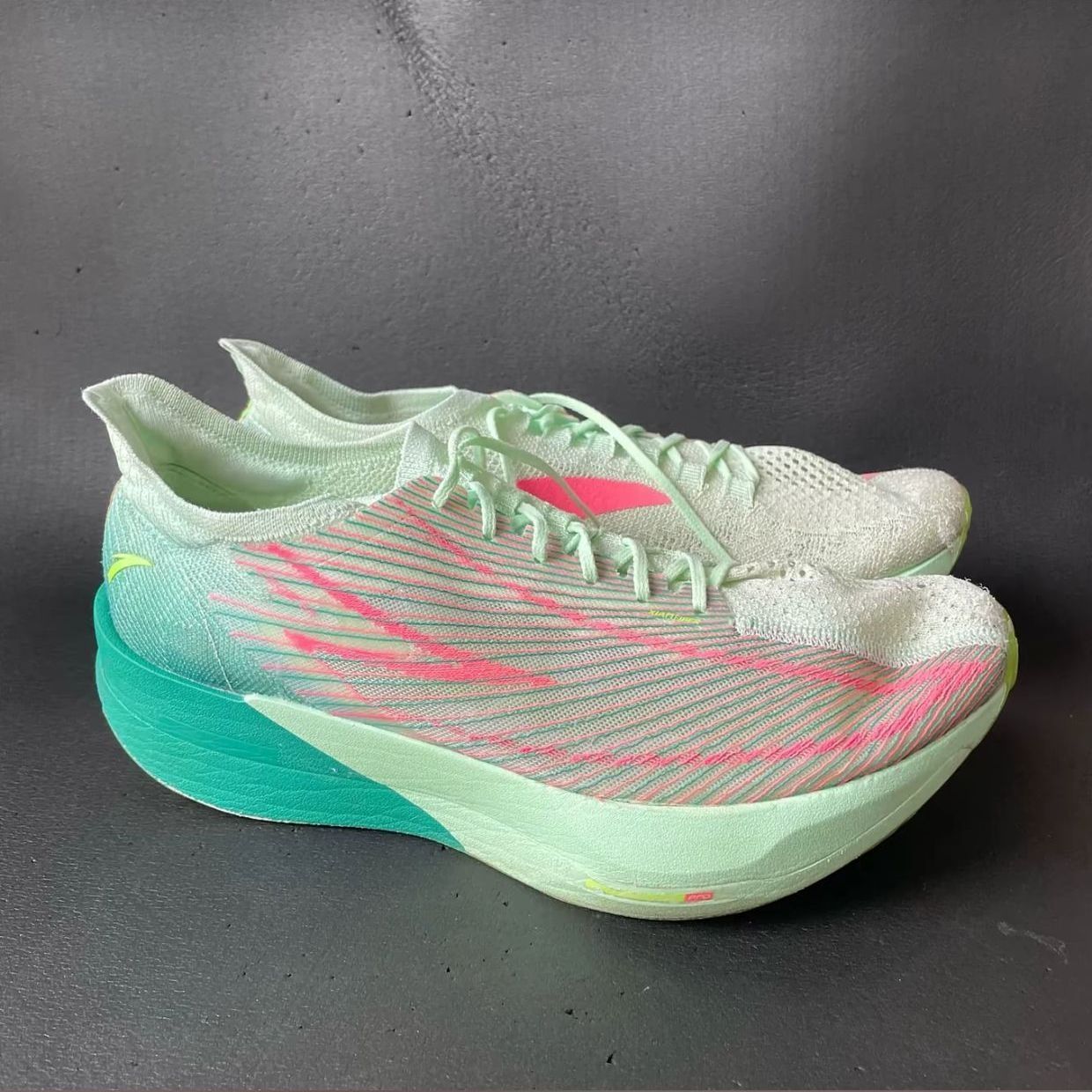这是安踏C202 G9“青蛇”配色跑鞋:鞋面是蝉翼纱线编织,轻透但支撑弱;中底氮科技+全掌碳板,滚动感强、推进力足;鞋底纹路抓地稳但耐磨一般。 优点:超轻(42码约200g)、推进迅猛、配色清新。 缺点:支撑不足、缓震极限低、鞋面易破损。