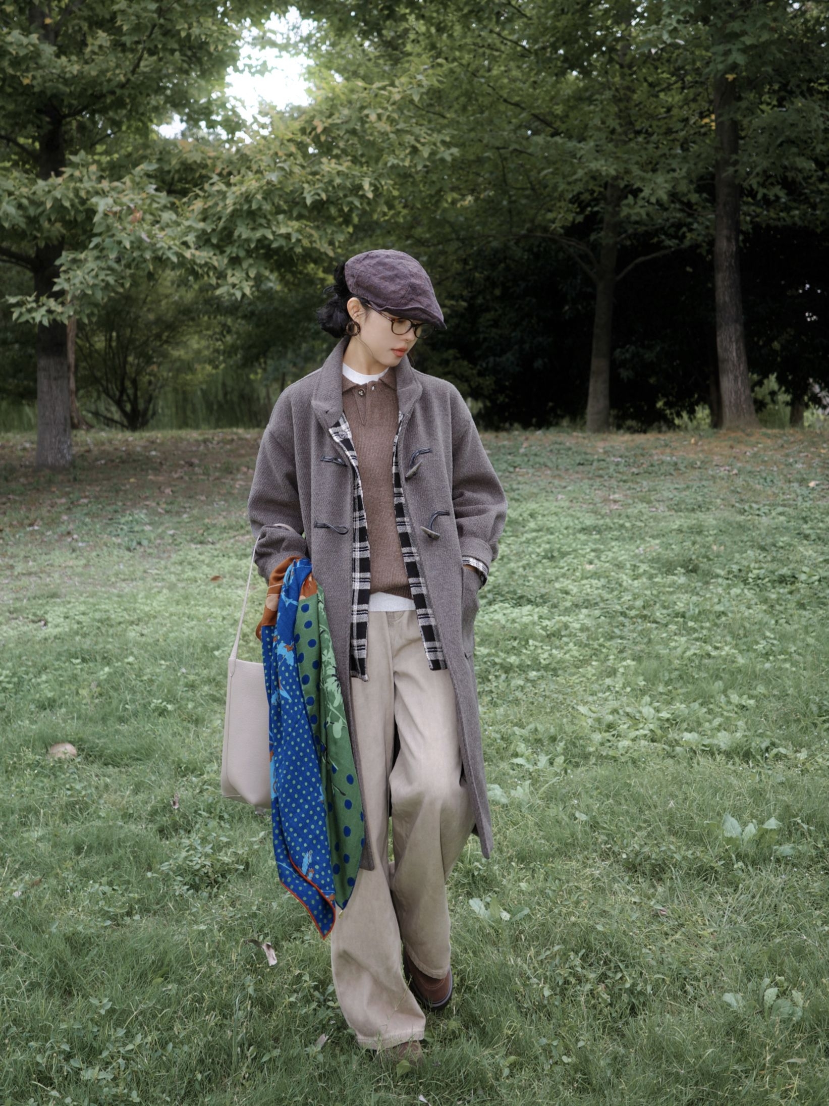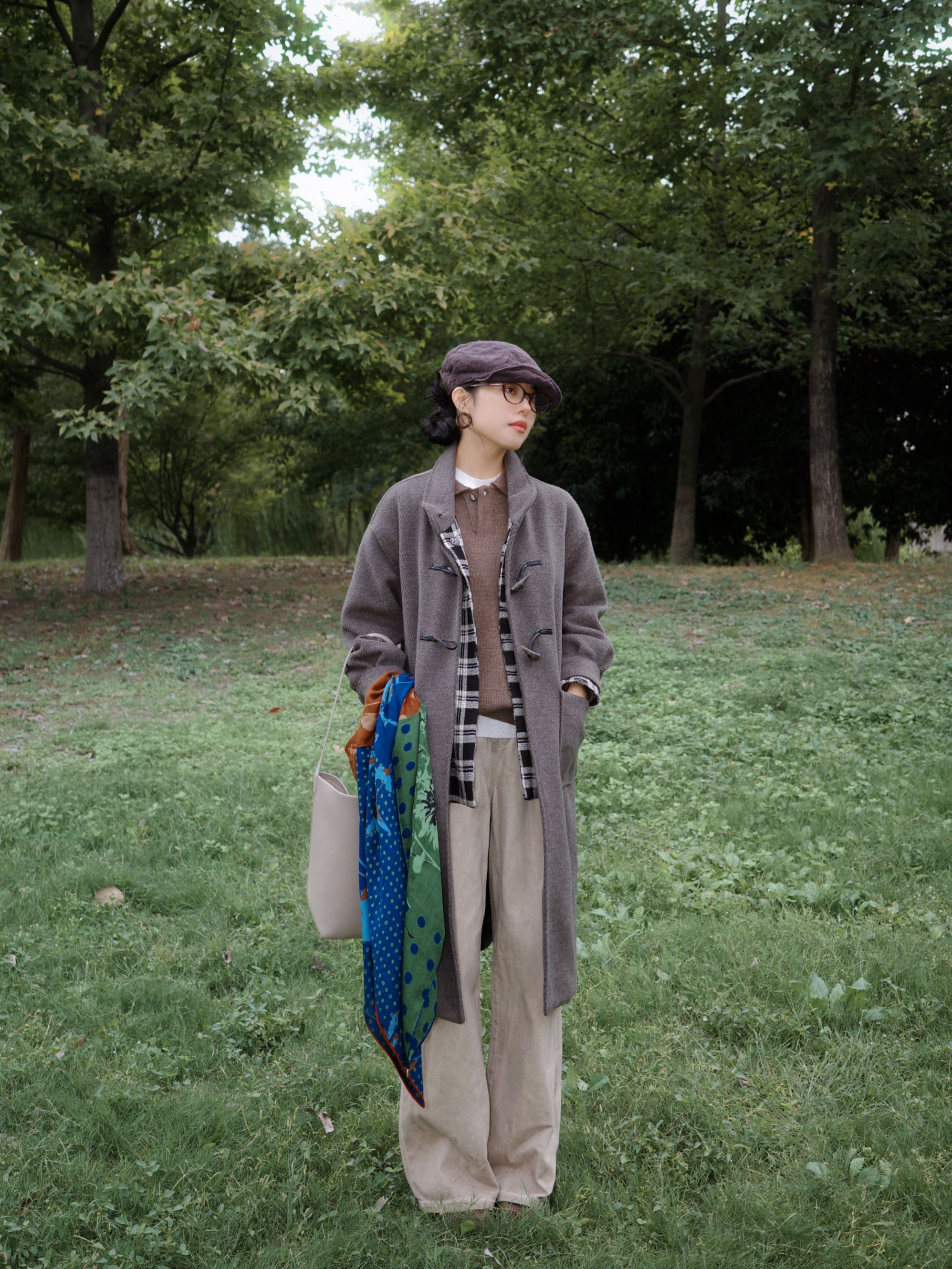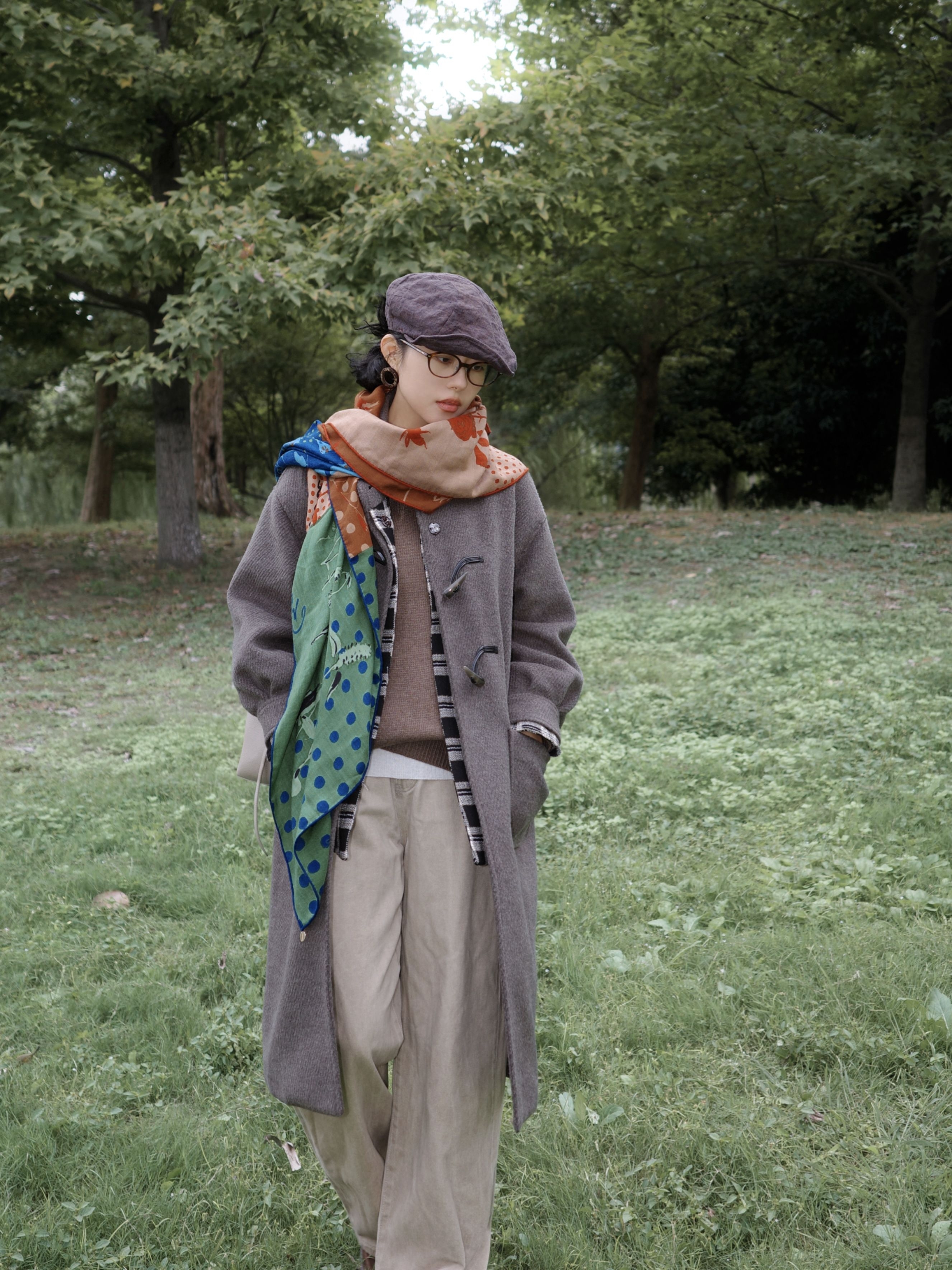 灰色大衣里面叠了件棕色毛衣,中间叠穿了格纹衬衫丰富层次,里边是白色打底过渡,下身浅搭配卡其的直筒和棕色靴子。 最重要的当然是这条充满艺术感的围巾啦~为整体低饱和度的大地色系穿搭提色不少😁