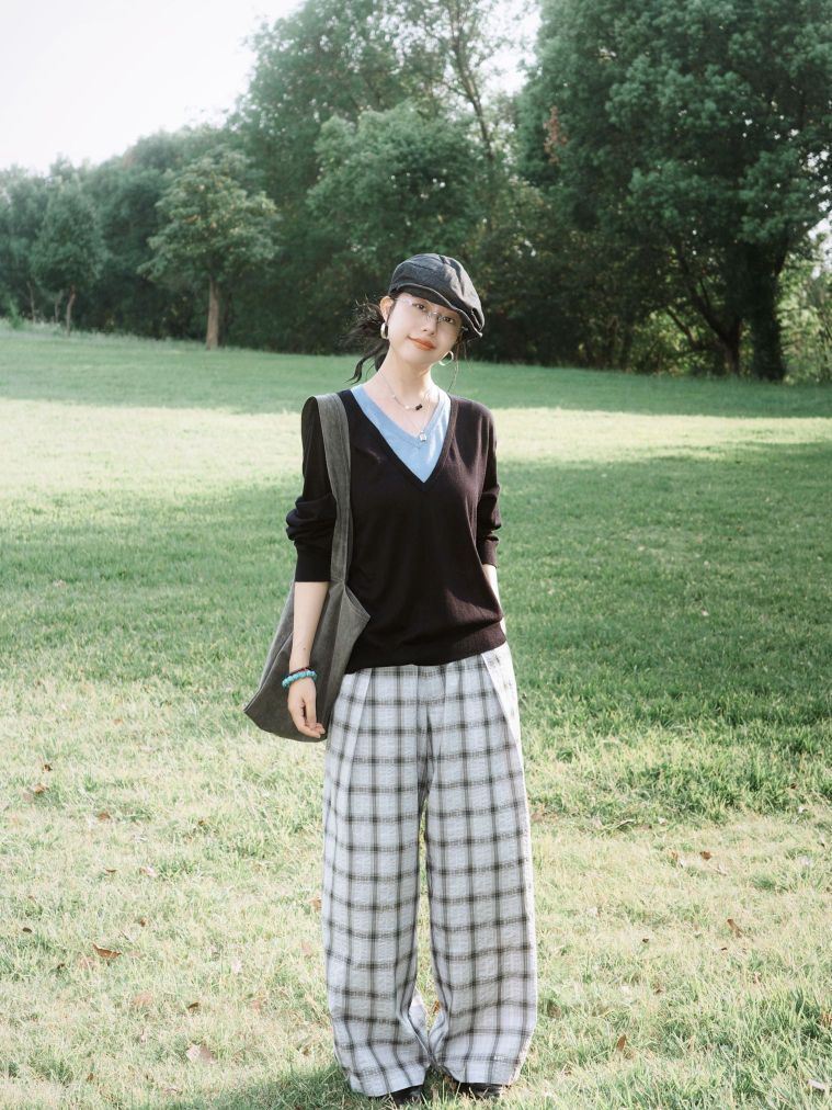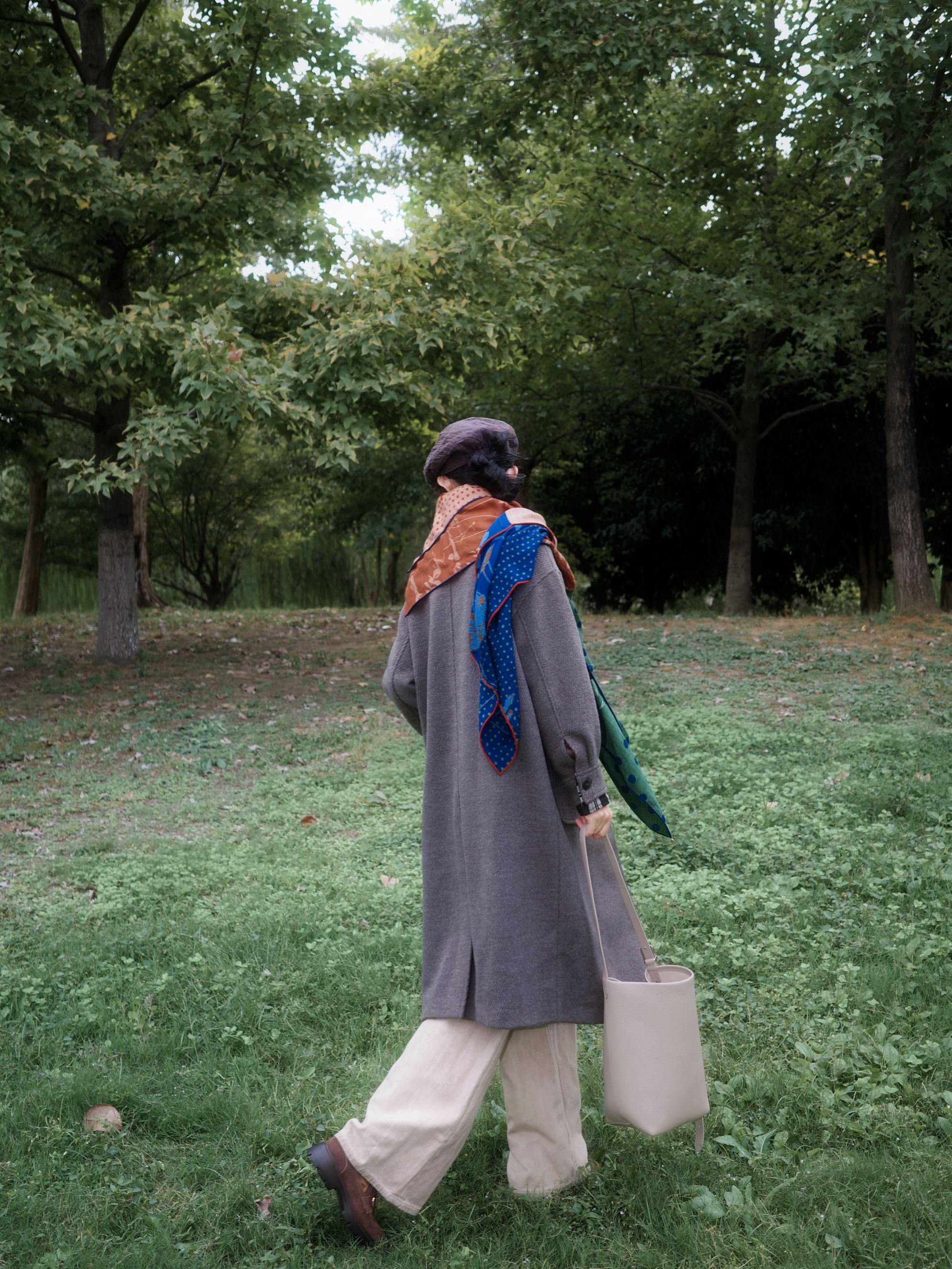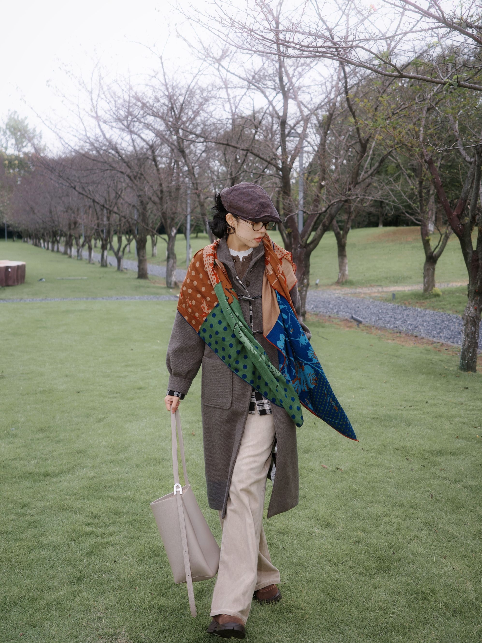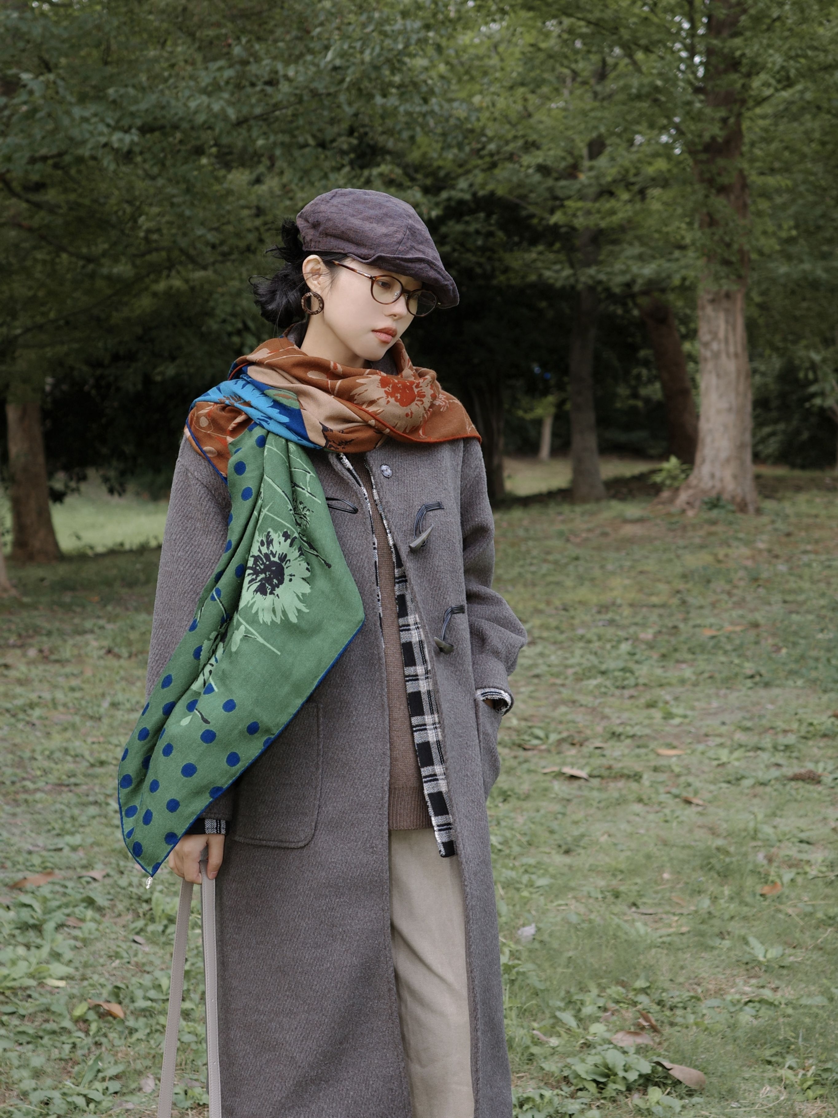 灰色大衣里面叠了件棕色毛衣,中间叠穿了格纹衬衫丰富层次,里边是白色打底过渡,下身浅搭配卡其的直筒和棕色靴子。 最重要的当然是这条充满艺术感的围巾啦~为整体低饱和度的大地色系穿搭提色不少😁