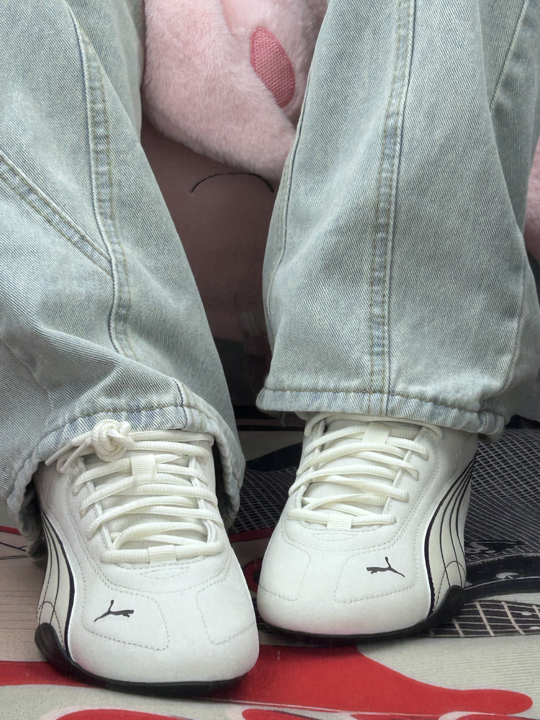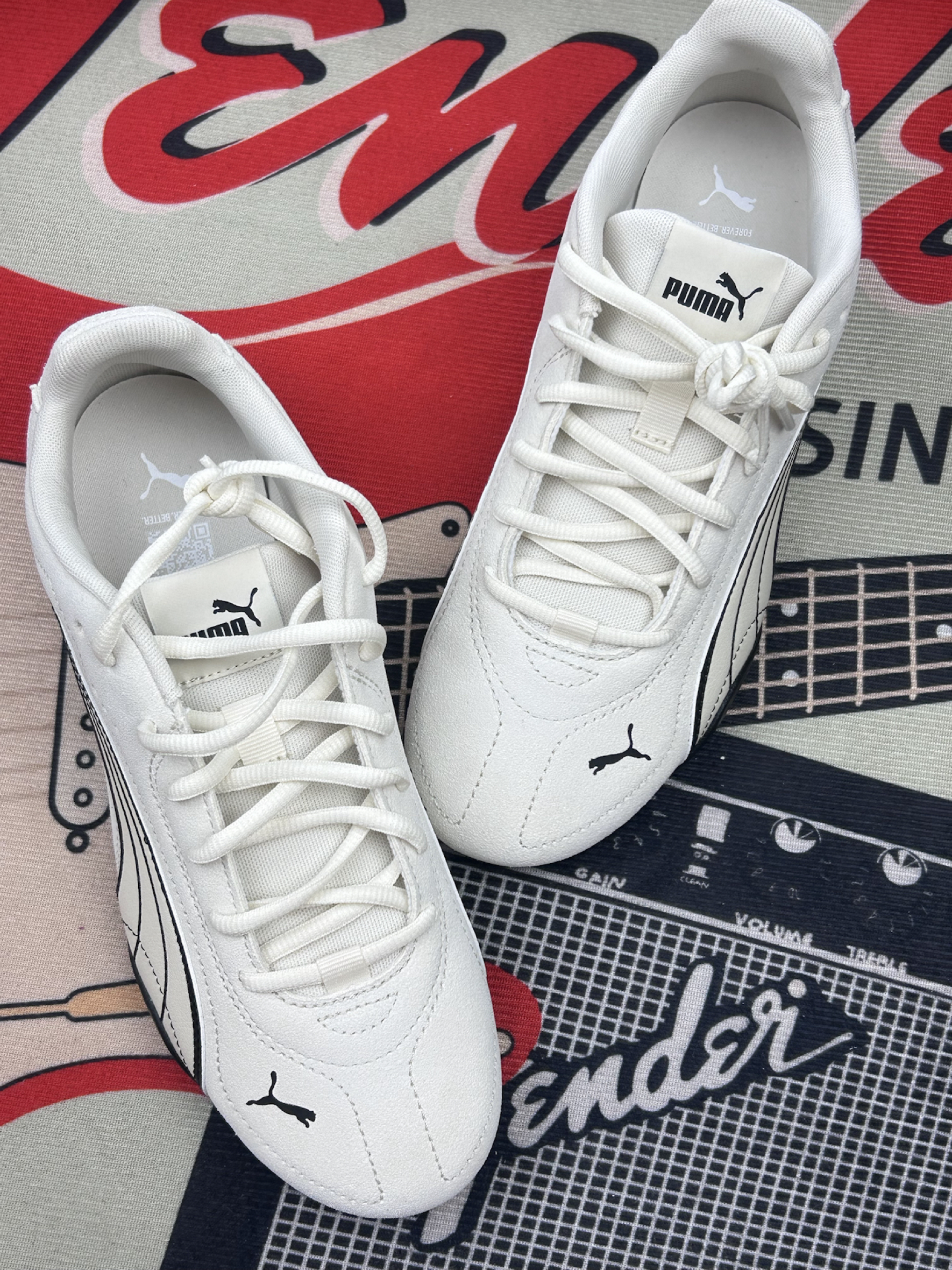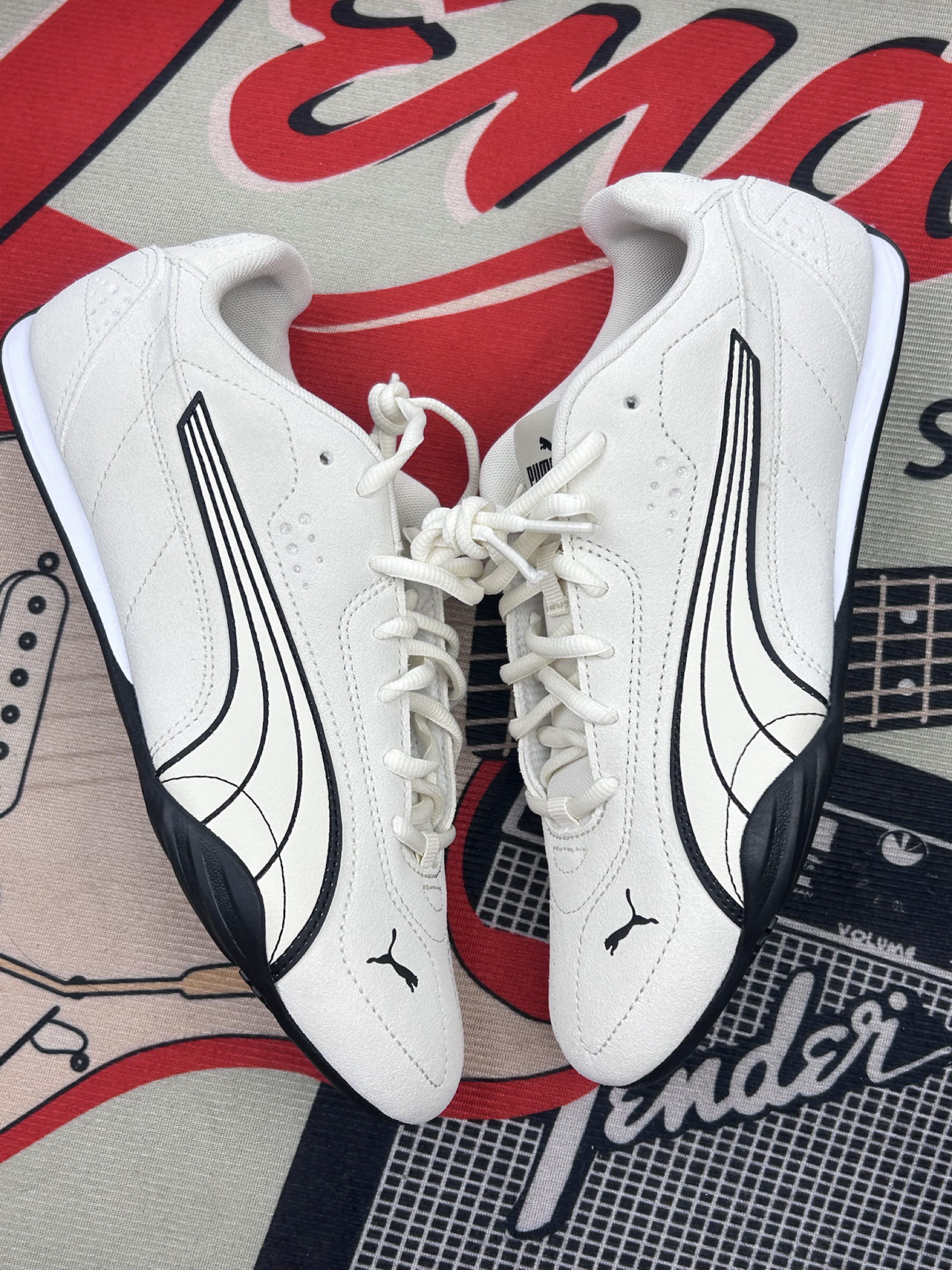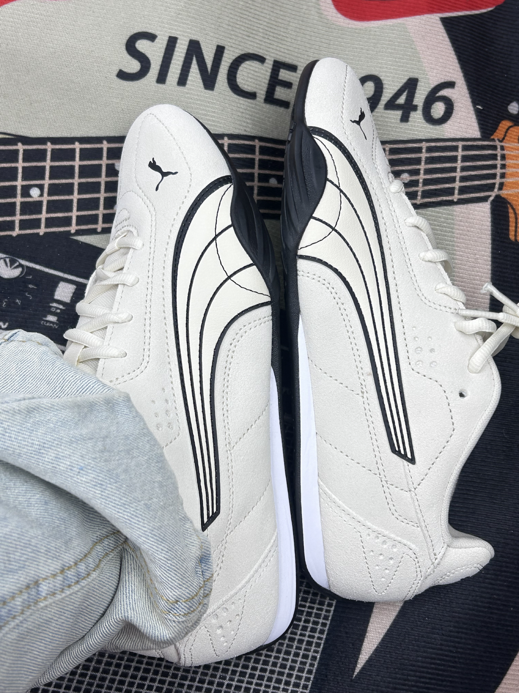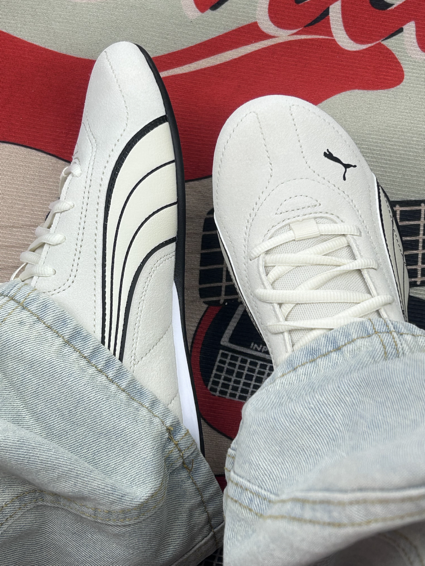 这双PUMA鞋穿了快两周啦! 鞋面是那种有点绒感的材质 摸着手感还行[赞_blue]但沾灰是真的 穿一天鞋头就有点显脏 得勤擦👀 脚感属于中等 平时上班走个万步不硌脚 但鞋底偏薄 踩硬井盖的时候能明显感觉到硌 长时间站着会有点累[裂开_blue] 鞋型是偏窄的 我正常脚型穿刚好 但脚宽的朋友可能得试大半码 鞋侧面的线条是好看 但黑边部分容易蹭出印子 擦不太干净[敬礼_blue] 优点就是搭衣服不挑...