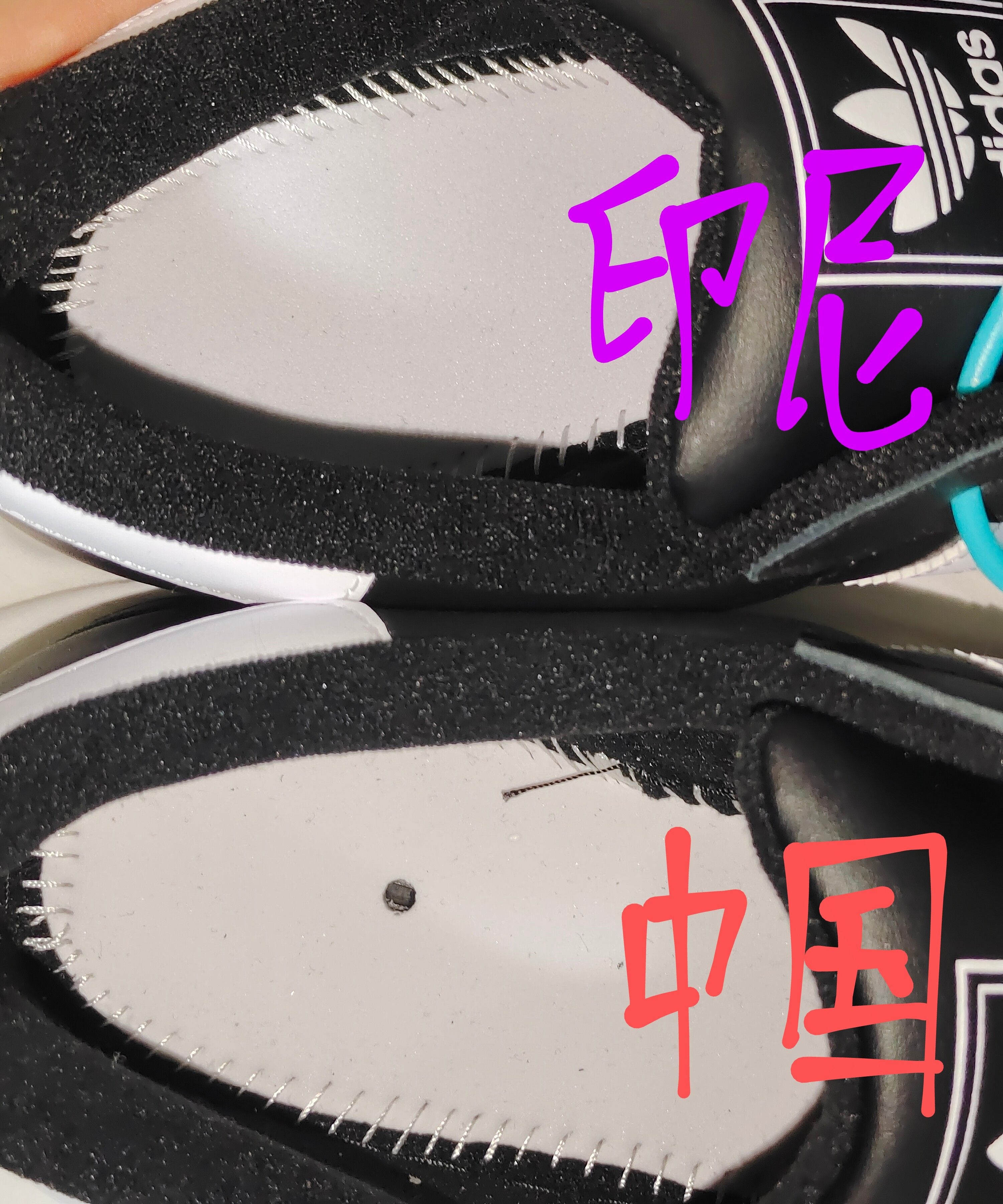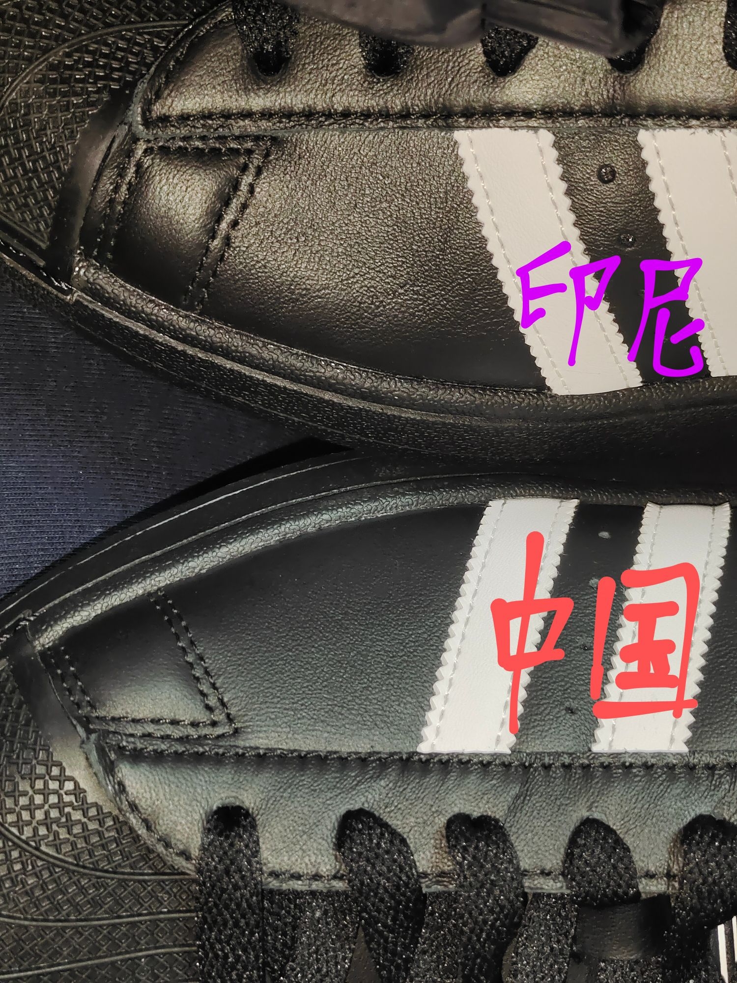 两双鞋都是adidas supertar2 一双是中国制造一双印尼制造 中国制造的鞋面比较光滑 中国制造的鞋垫底走线有个孔,印尼制造的没有 哪一双是正品,谢谢