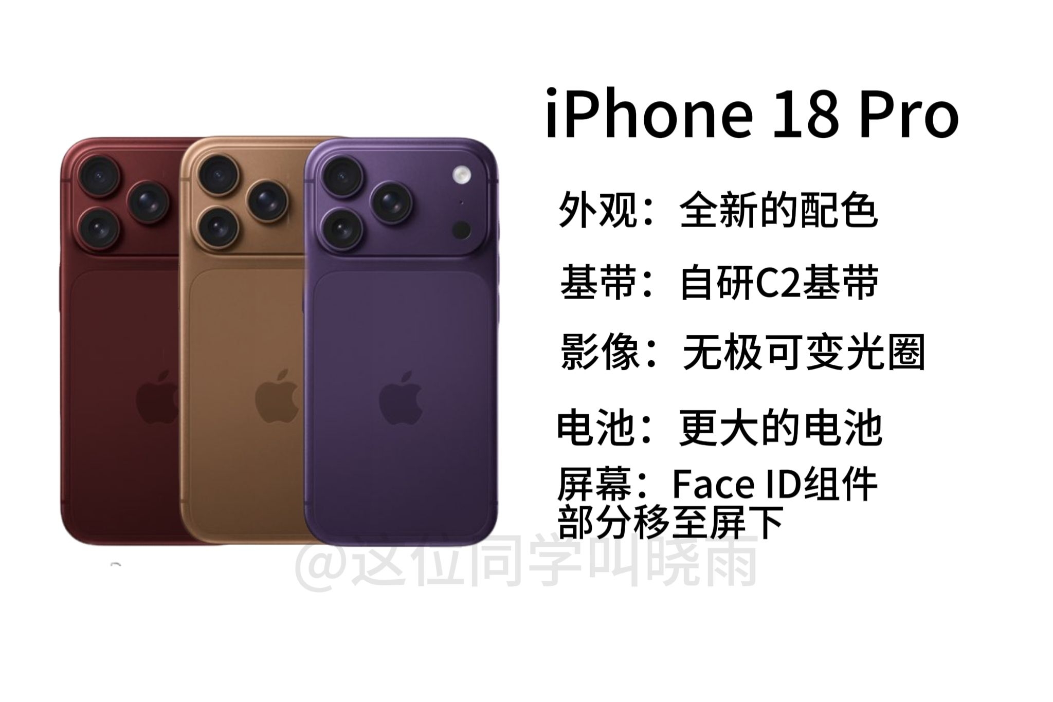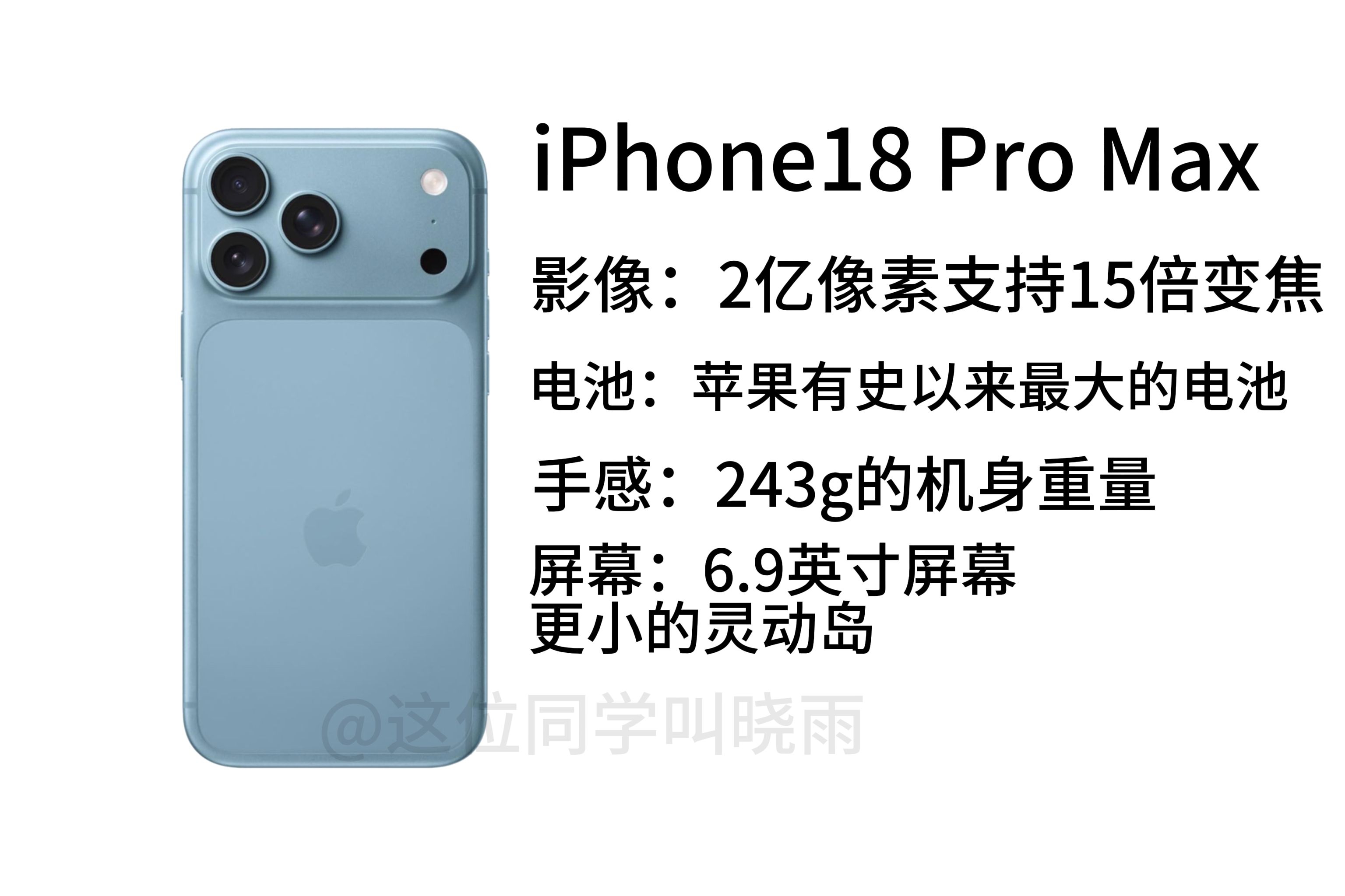 iPhone 18系列全系的消息爆料来了:iPhone 18标准版最大的变化是将使用全新的镜头设计,外观将会和iPhone 17 Pro系列两款新机一样,发布会时间将会在2027年。iPhone 18 Pro最大的变化是新增三种配色,前置灵动岛会有变化。iPhone 18 Pro Max最大的升级是镜头,后置将升级为2亿像素,支持15倍变焦,电池也将会是有史以来最大的,重量将会到达243g的机身重...