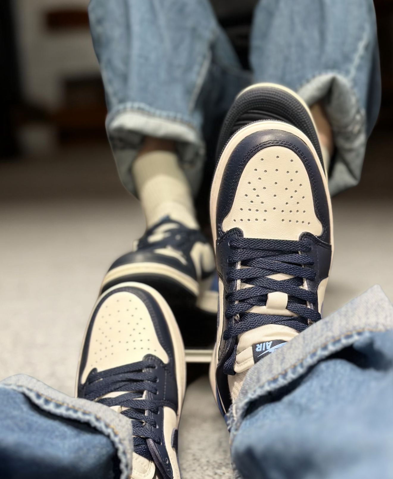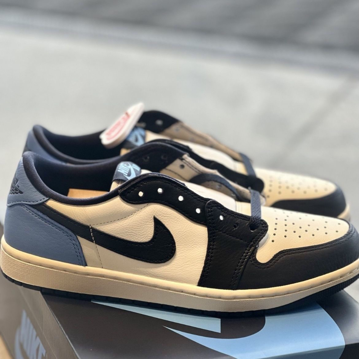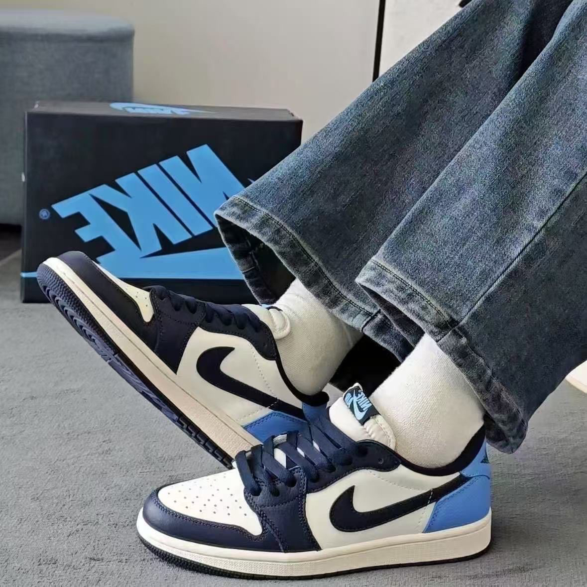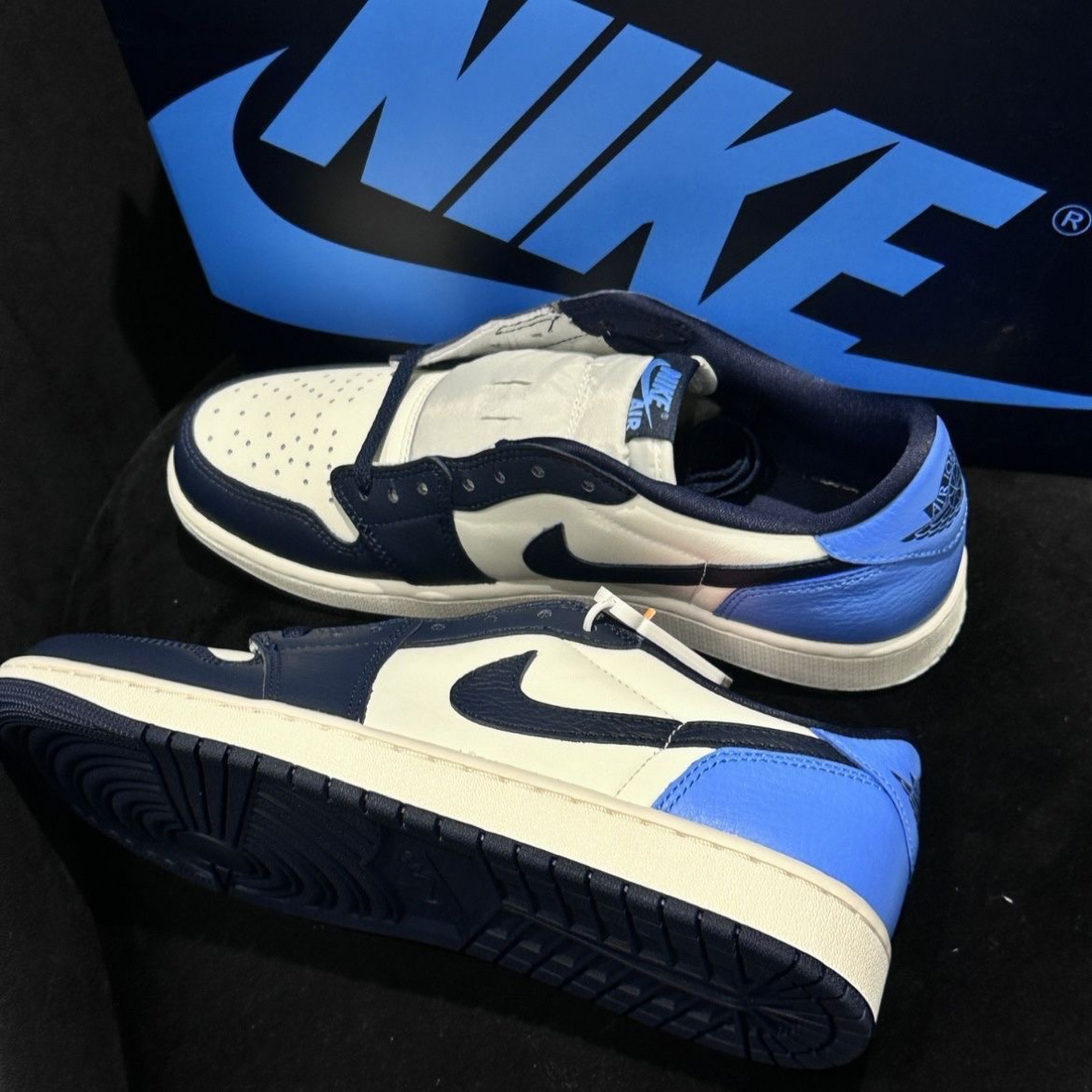 终于等到这双Travis Scott x Fragment x AJ1低帮倒钩上脚,蓝白黑的配色太适合日常,做旧感+闪电标细节直接戳中我,脚感也比想象中软,今天的快乐是新鞋给的。
