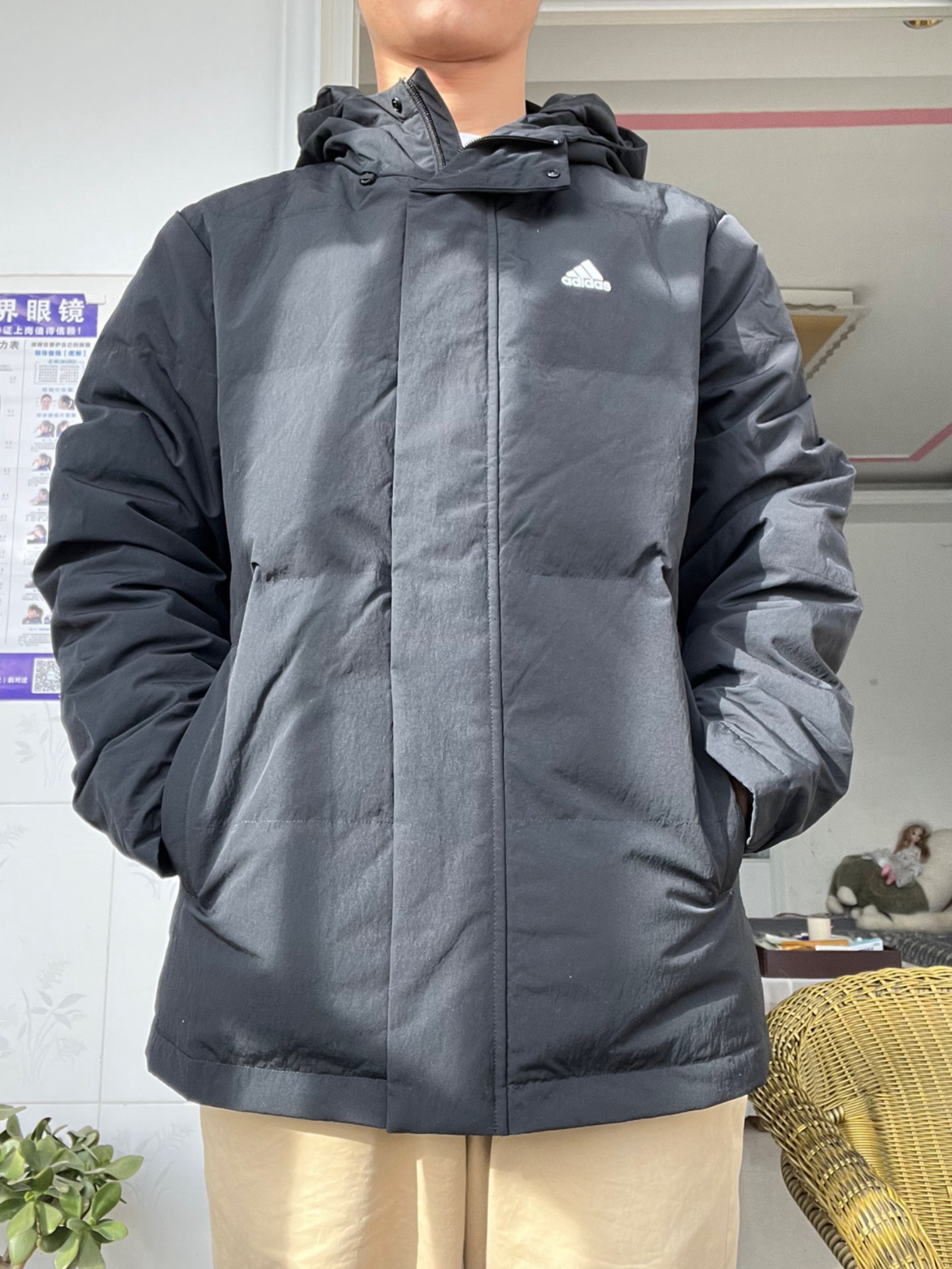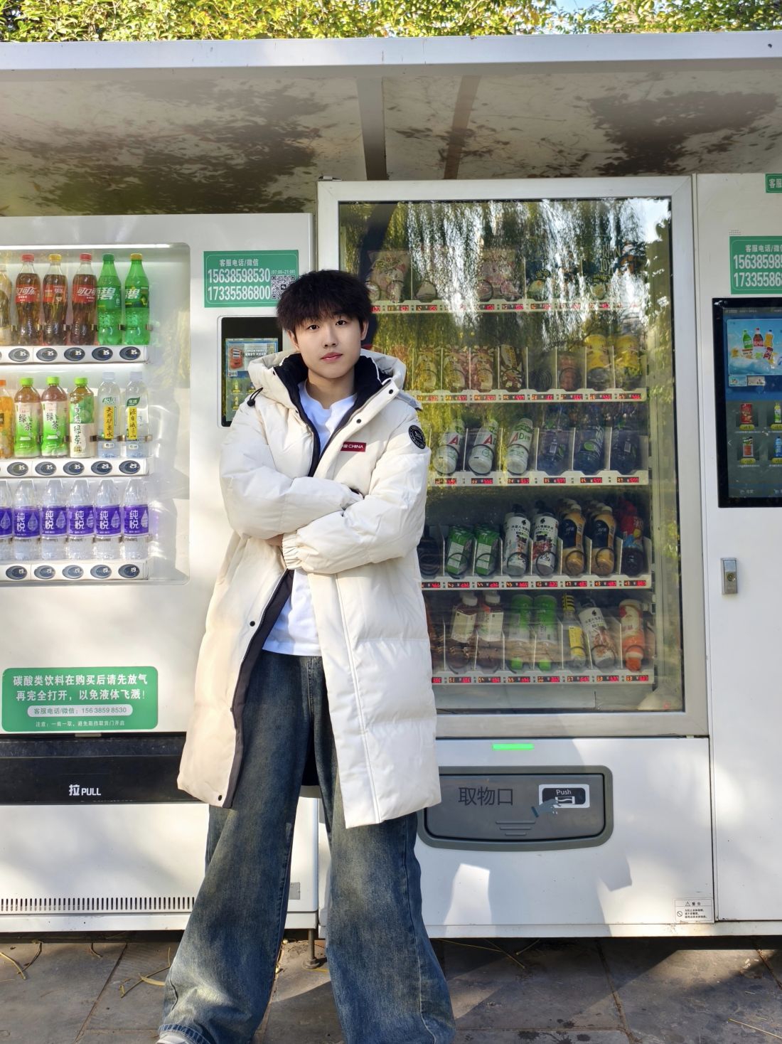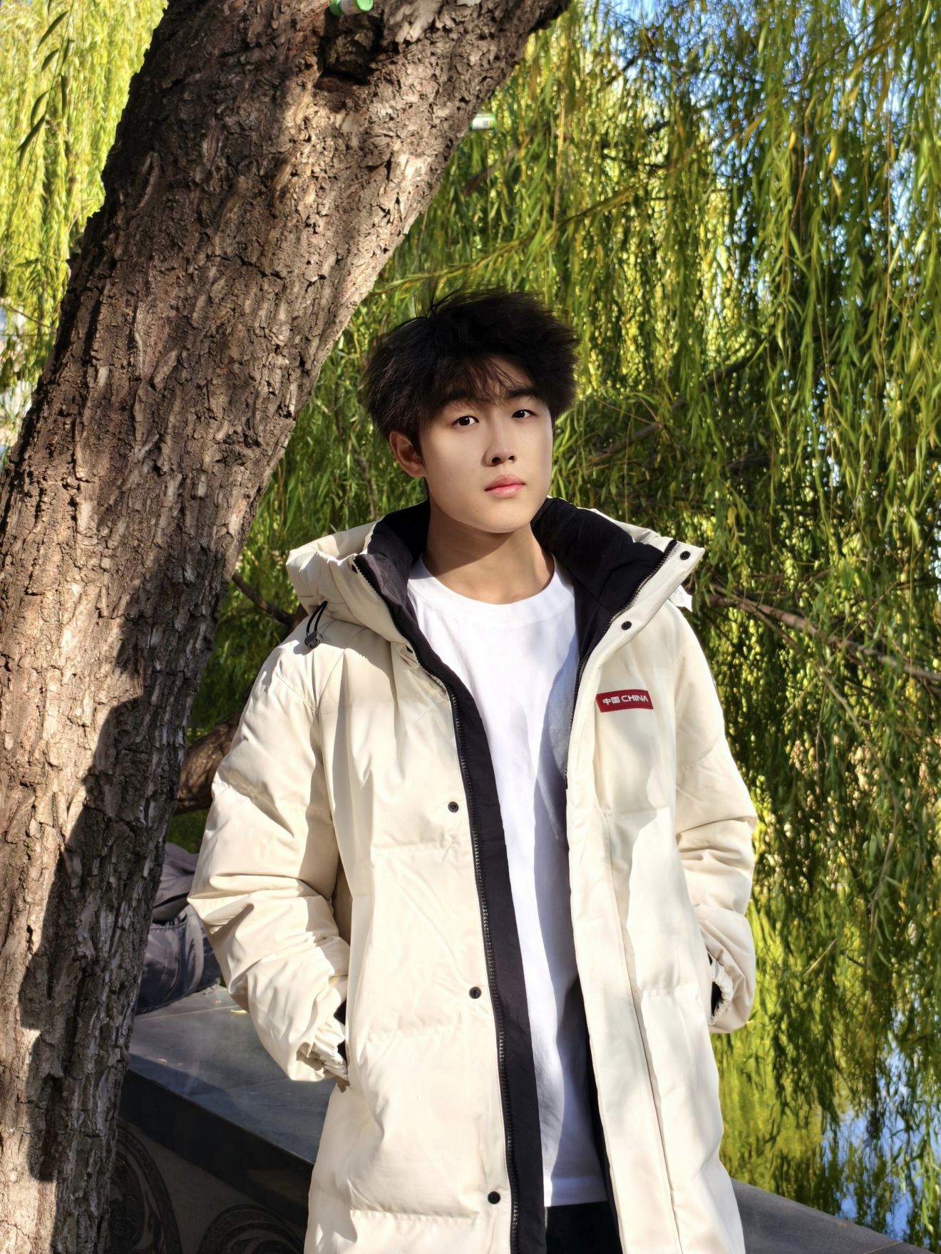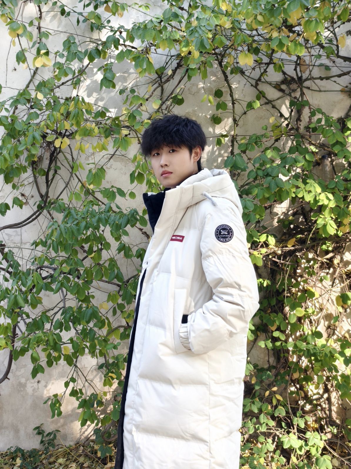 米白长款羽绒服自带温柔滤镜,黑边内衬+小标细节让简约不单调,裹上连帽直接把暖乎乎的松弛感拉满;内搭基础白T提亮,配条做旧阔腿牛仔裤,随性又不拖沓,往户外一靠就是自带氛围的清爽少年感~