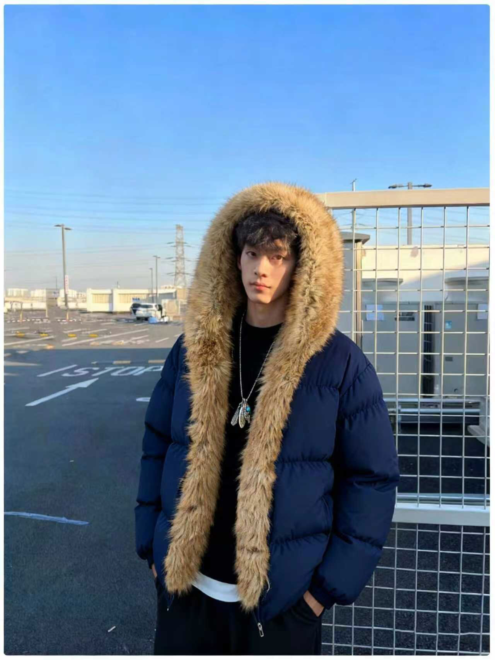 这件棉服我能穿到天荒地老 经典深蓝色超百搭,宽松的版型对各种身材都友好,两侧的毛很暖和,冷的时候还能保暖