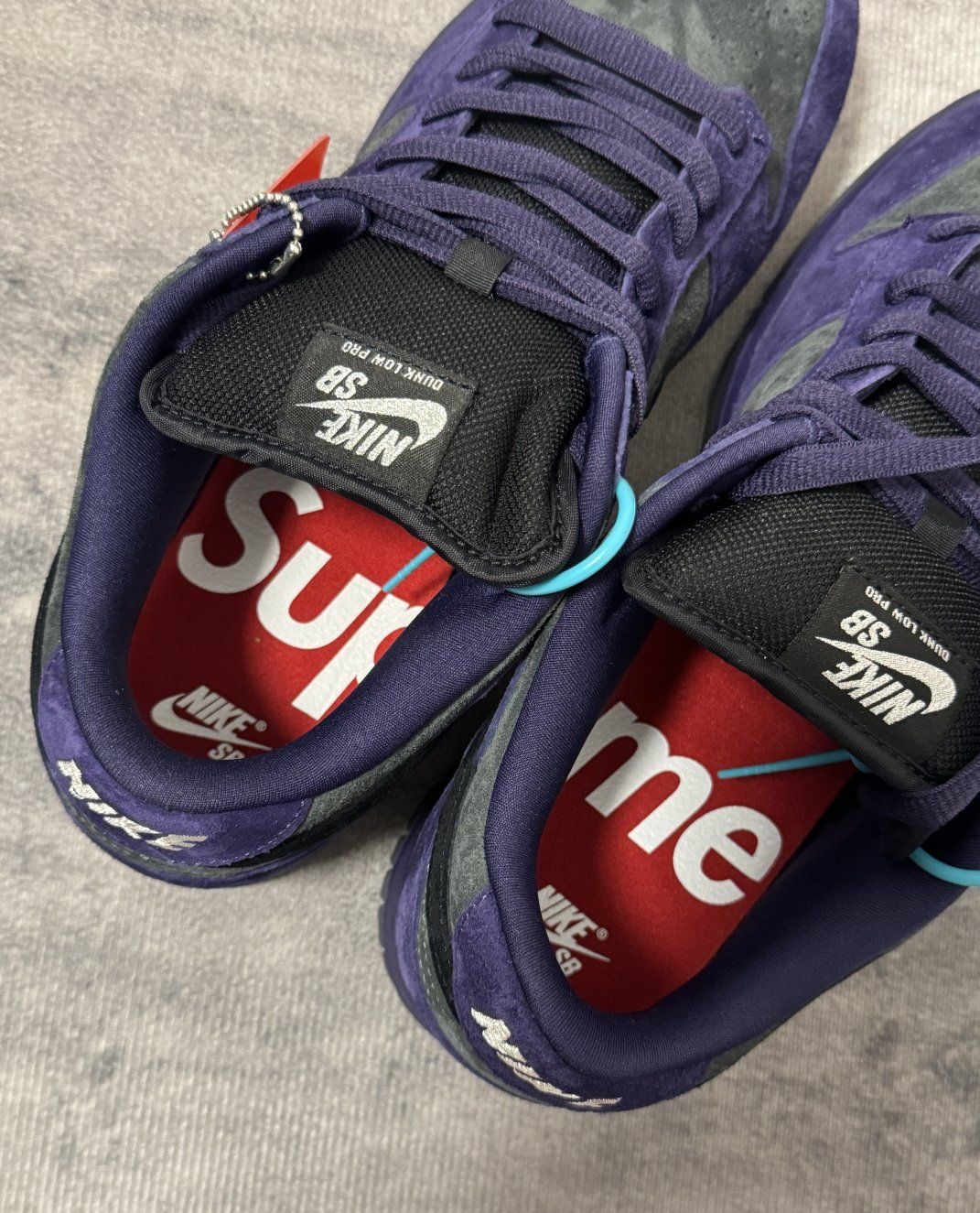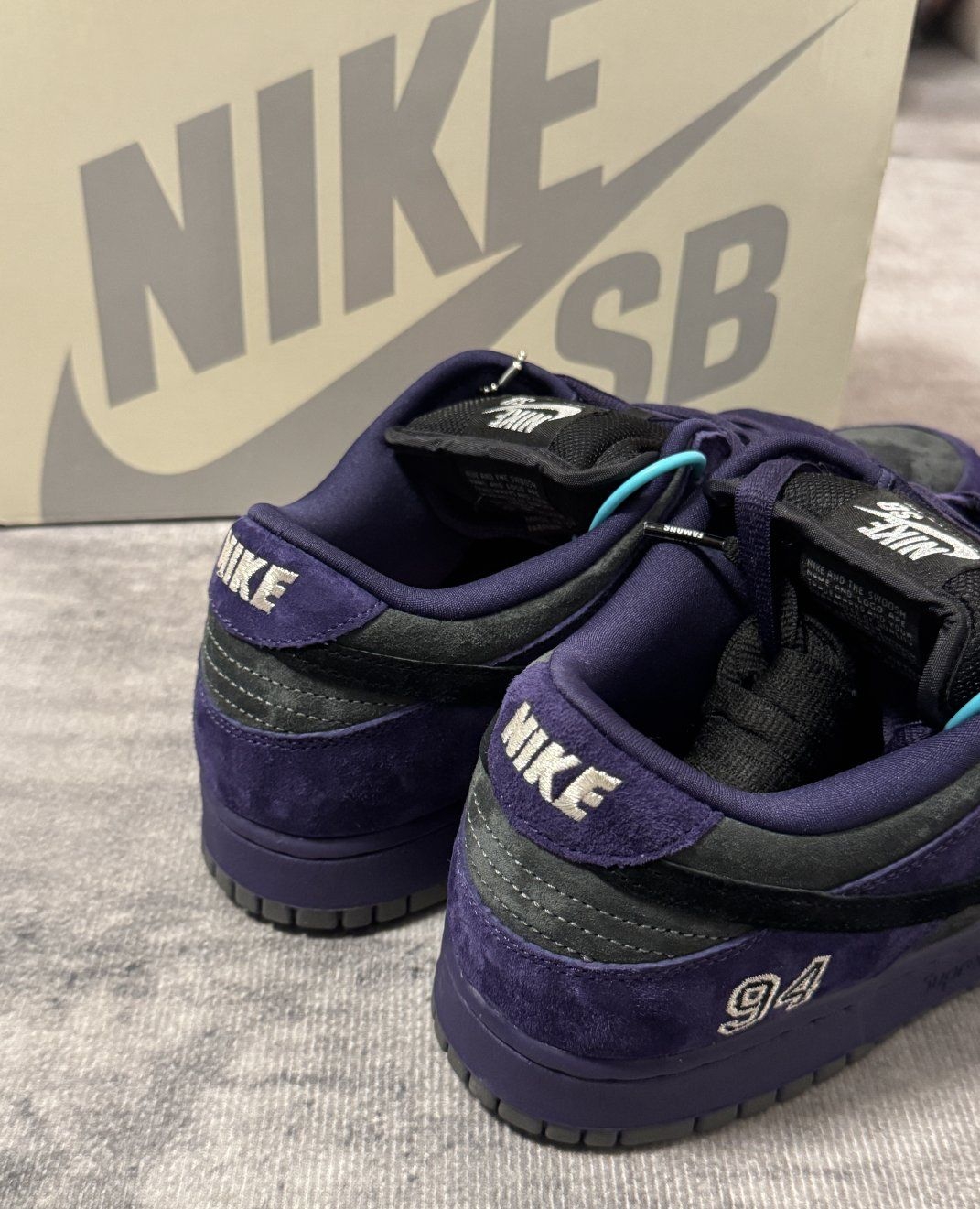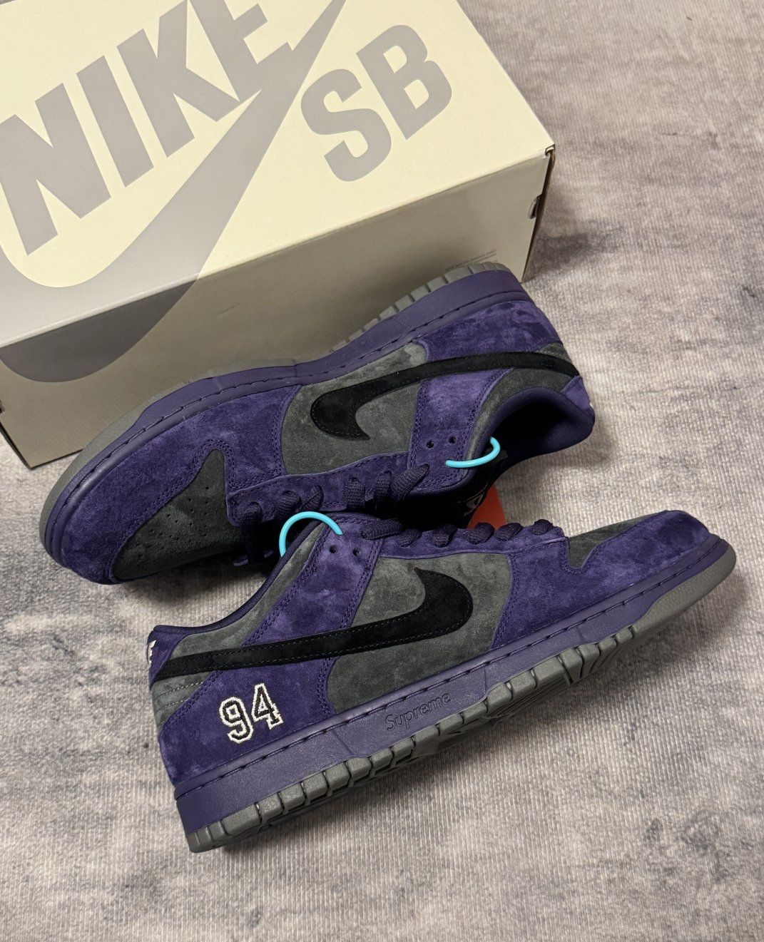 是暗夜里的葡萄紫,也是滑板场的老灵魂。 94 年的编号缝在鞋跟,Supreme 的红标藏在鞋垫里,蓝绿提环像撕开夜幕的一道光。 全麂皮裹着的不只是脚,是街头和运动撞出的那团火。