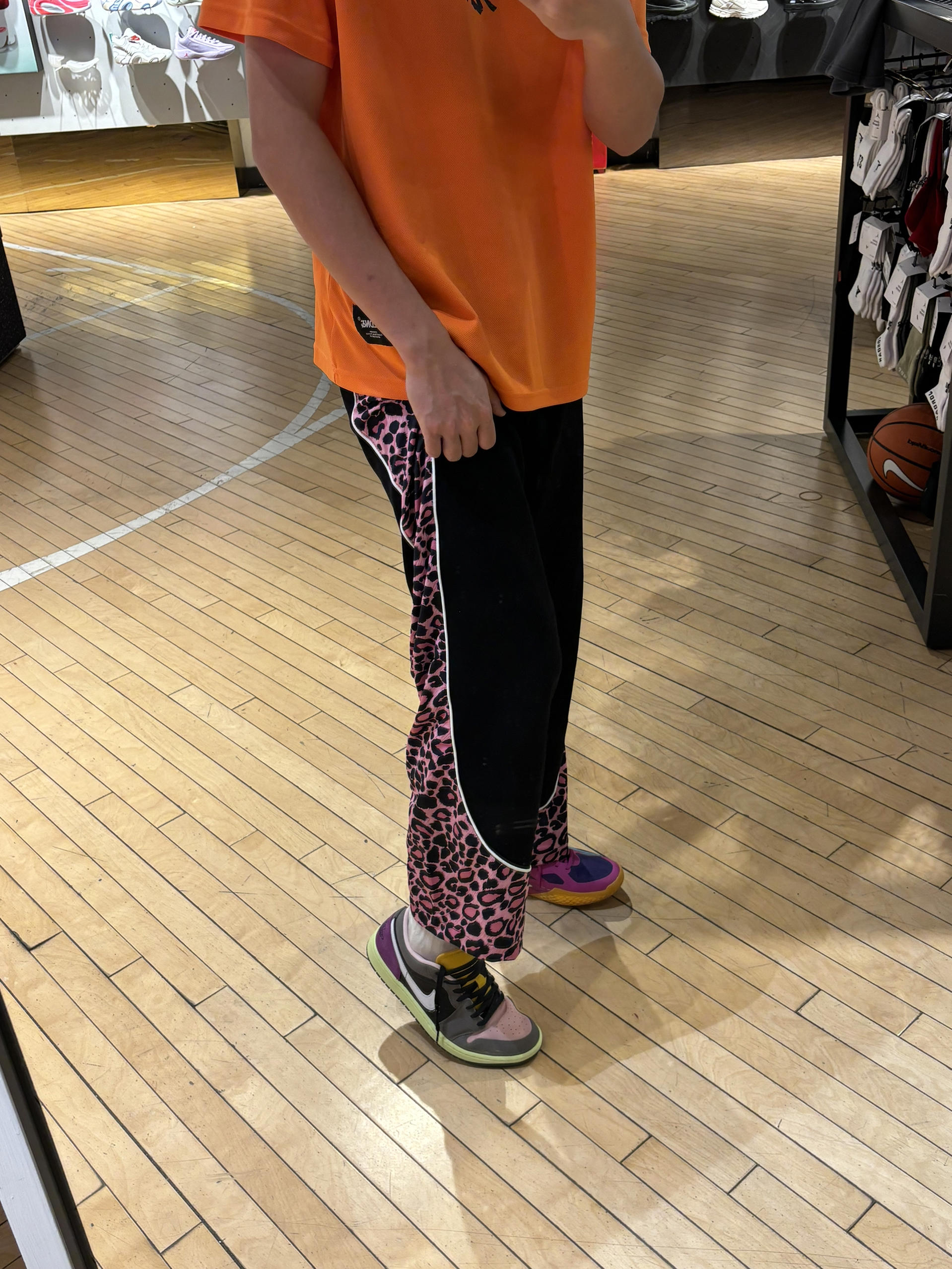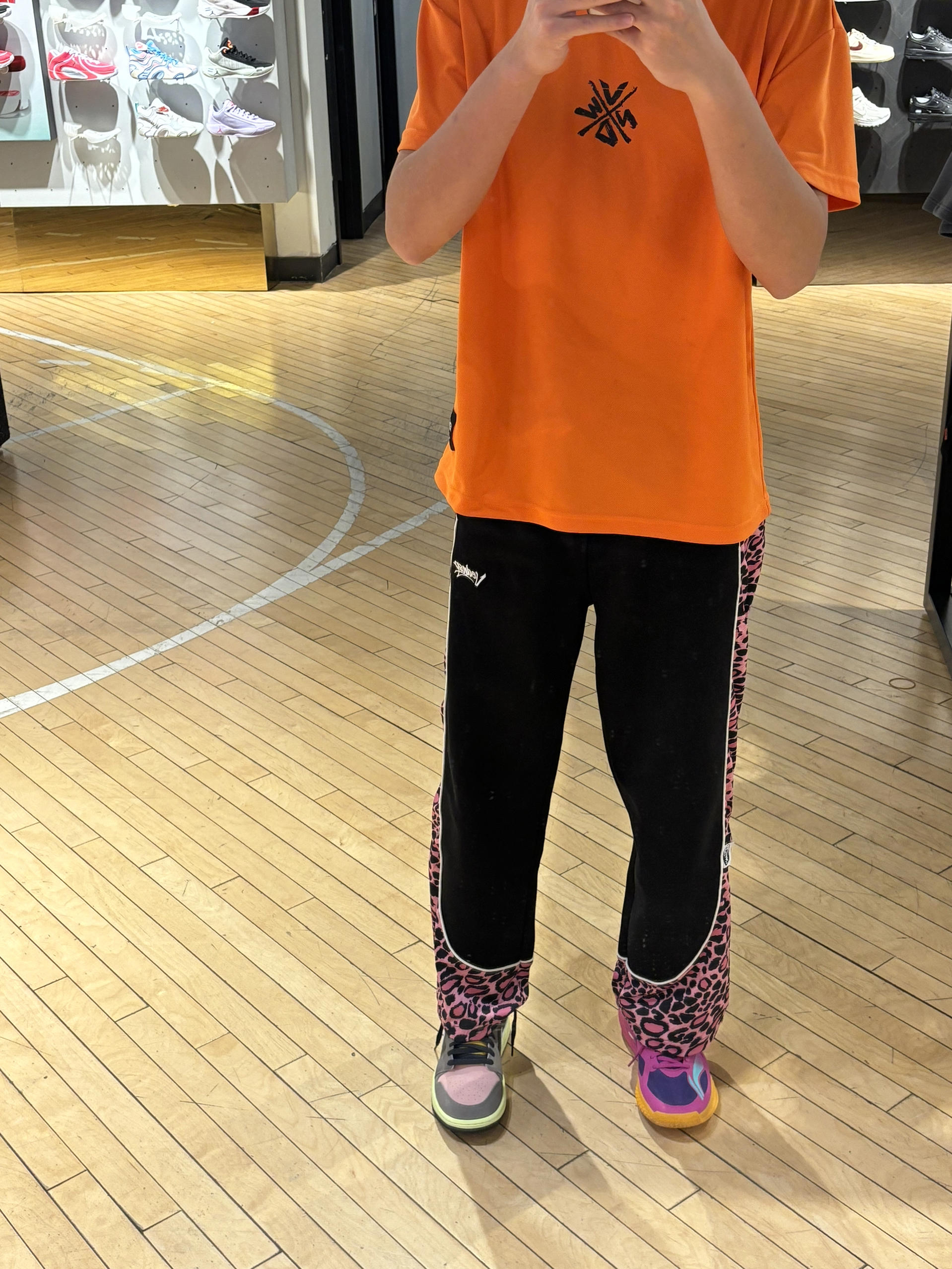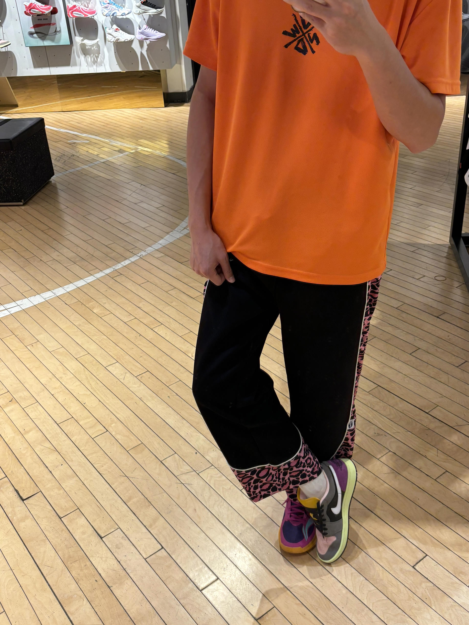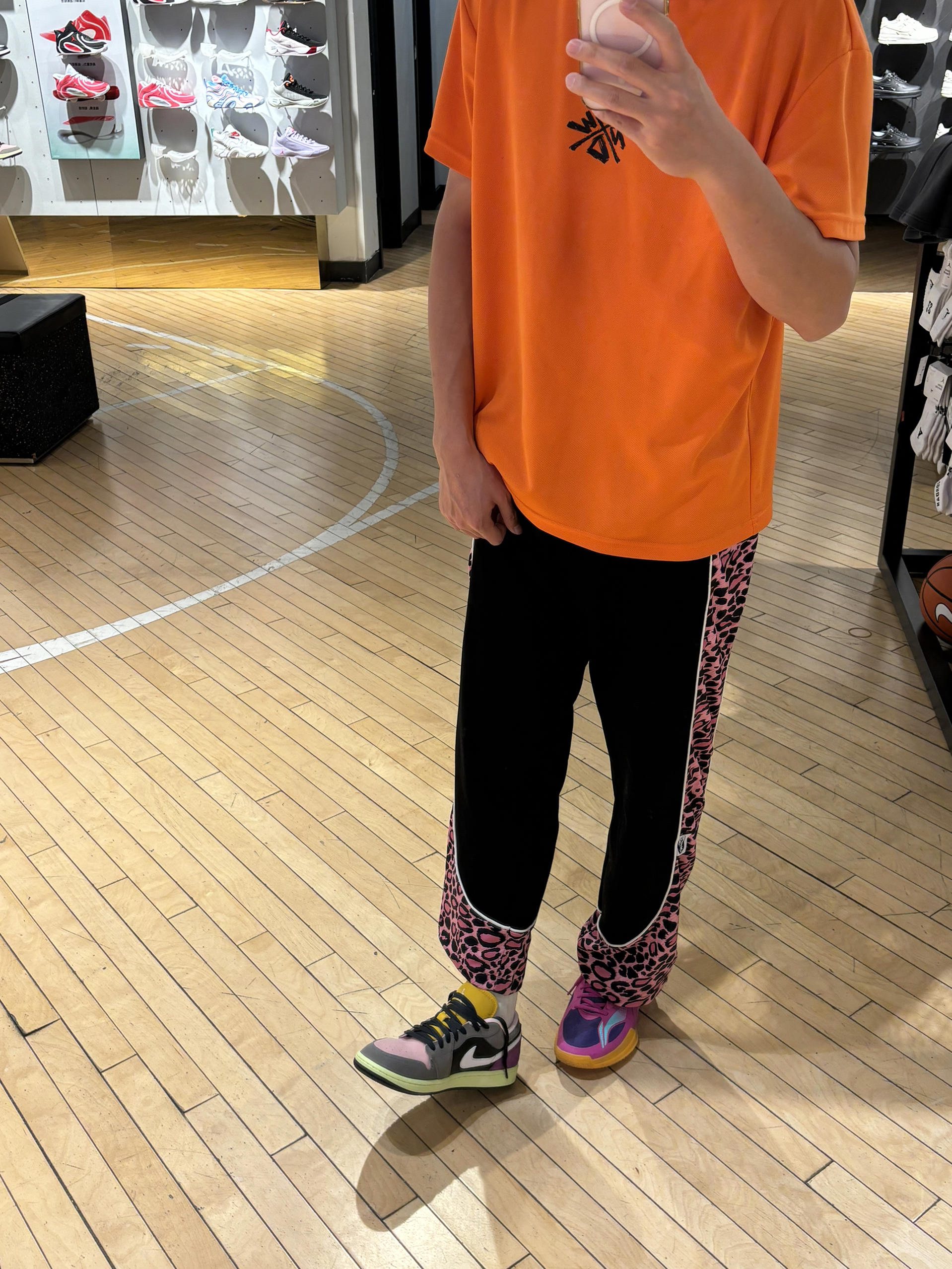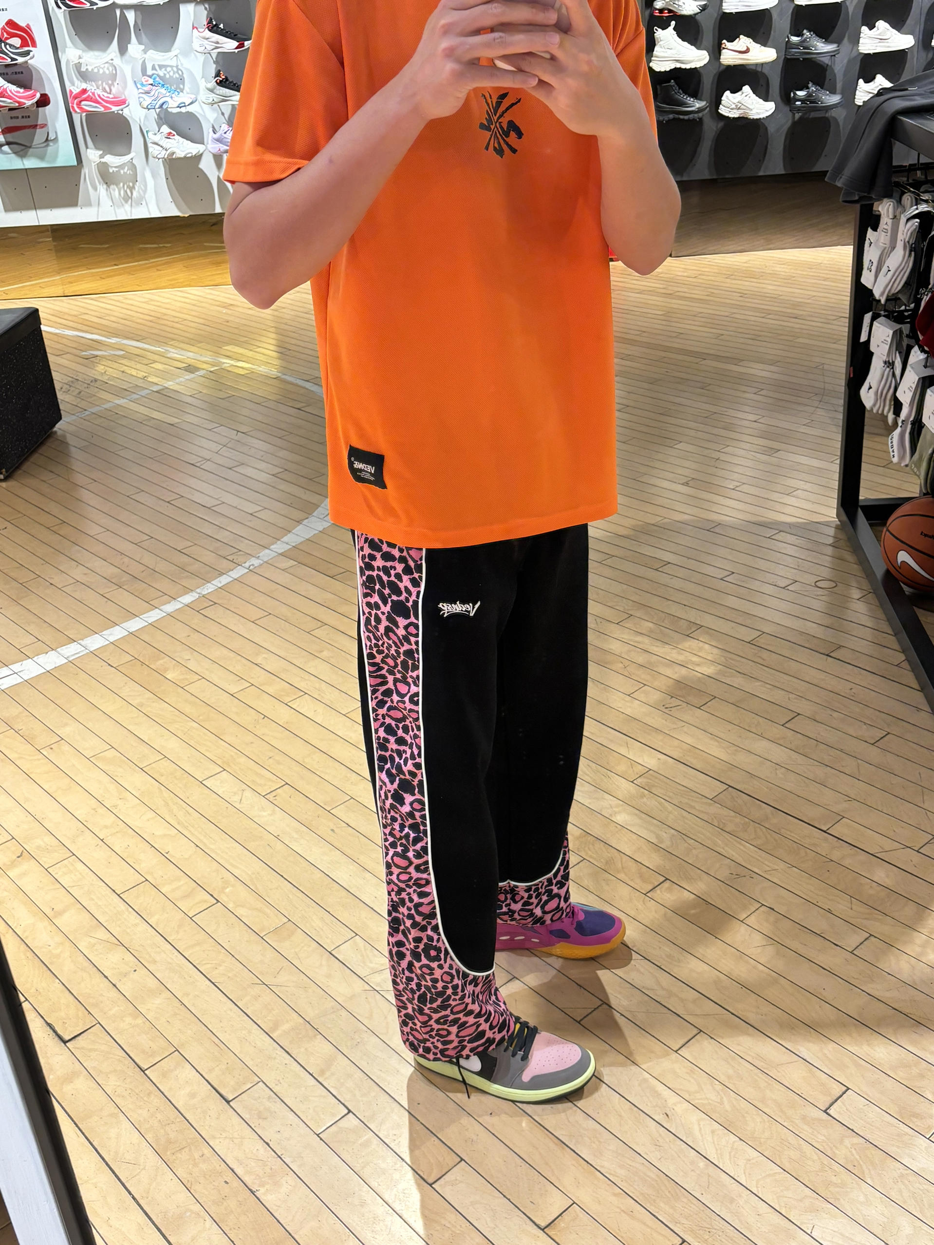 我的年度穿搭关键词是:高饱和度 今天出门穿什么 现在就是要把高级感和色系拉满 不然冬天就没得穿了 饱和度满满一天 美式豹纹直筒裤版型会偏大些 搭配橙色短袖 还有一双麂皮aj1很显高级质感