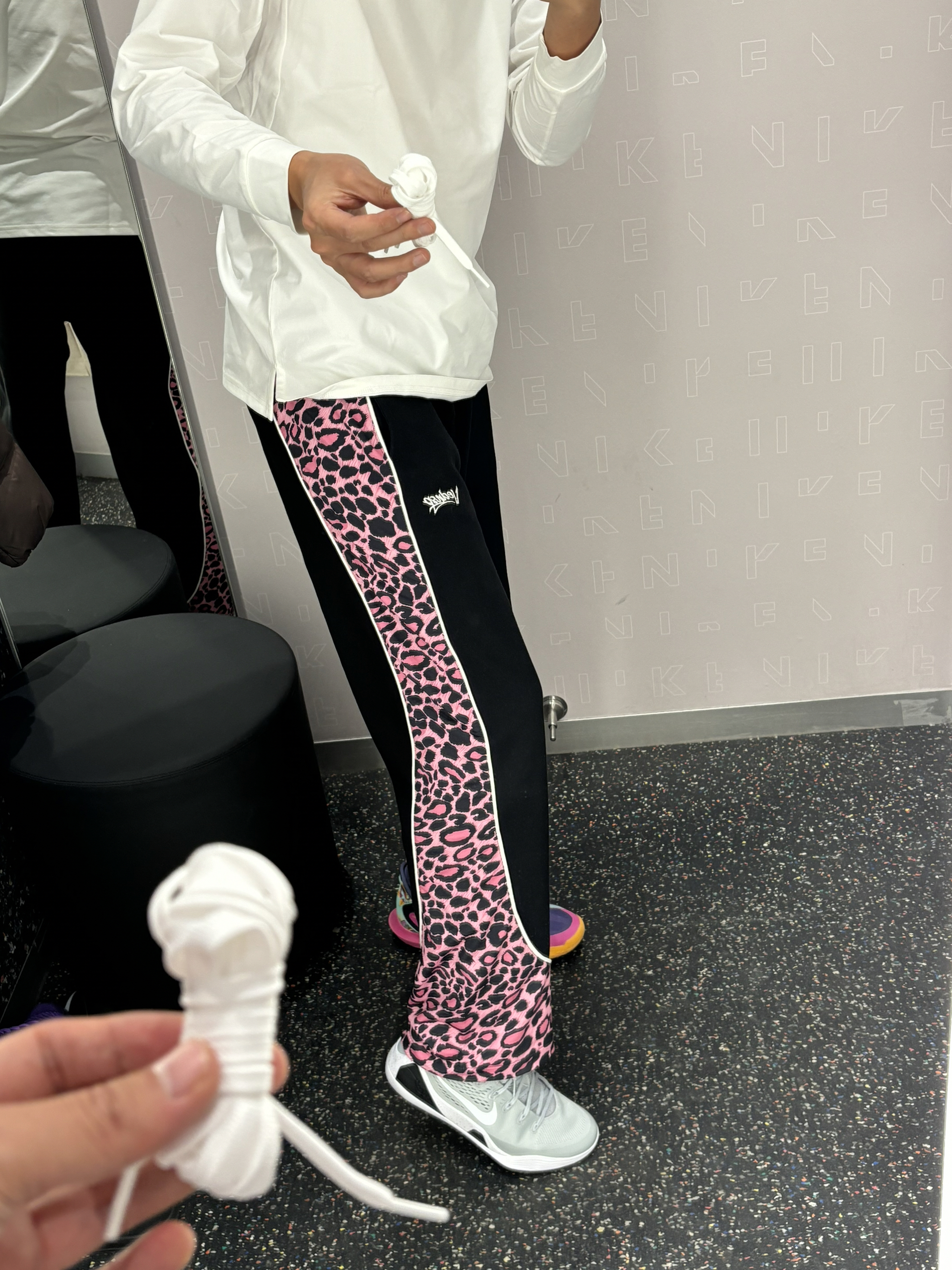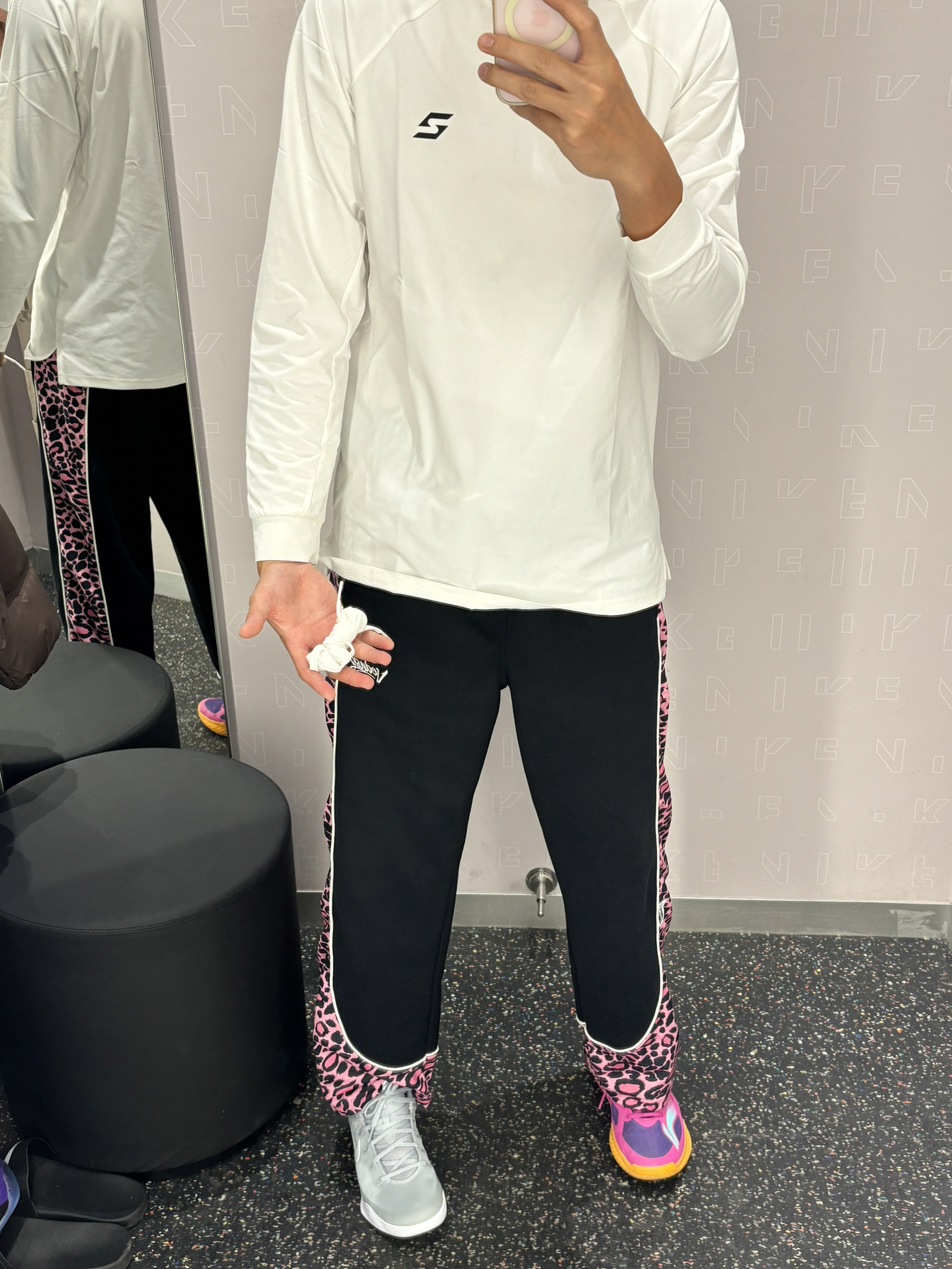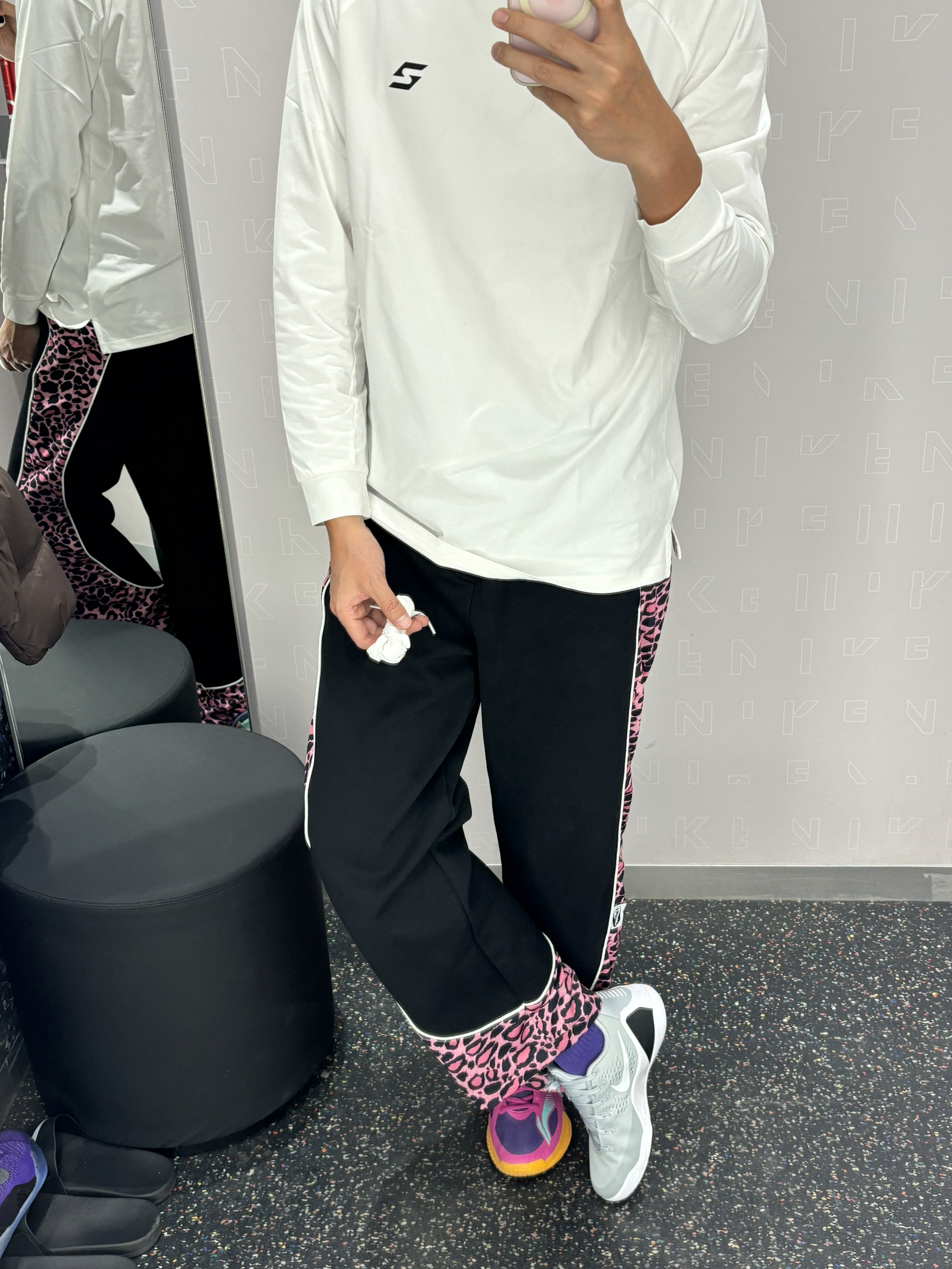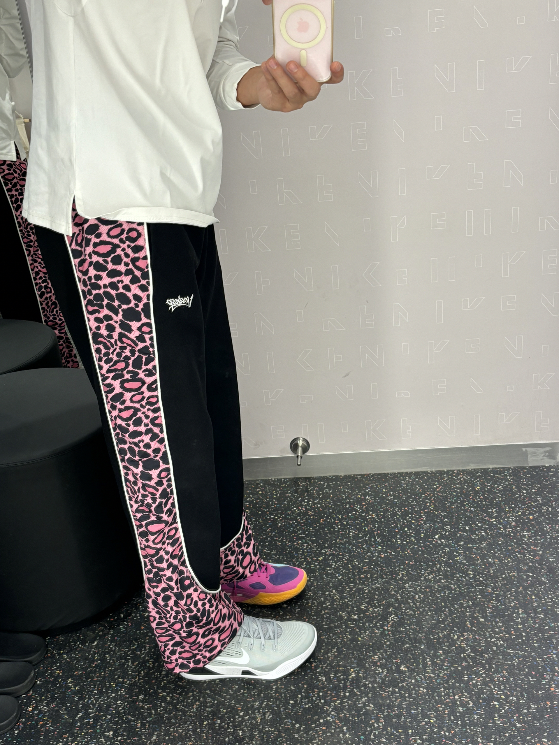 我的年度穿搭关键词是-美式 见前任还是要穿帅一点证明自己过得好 视觉上搭配有点色彩的美式风格 上紧身下宽松的感觉 上衣普通下装就不普通 球鞋简单配饰就不简单兄弟们 白色上下呼应,中间豹纹更显腿长还很有个性 👔白色uzis针织T 👖维动美式拼接豹纹裤 👟科比9白色