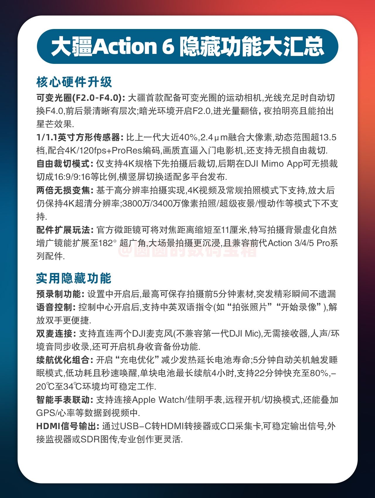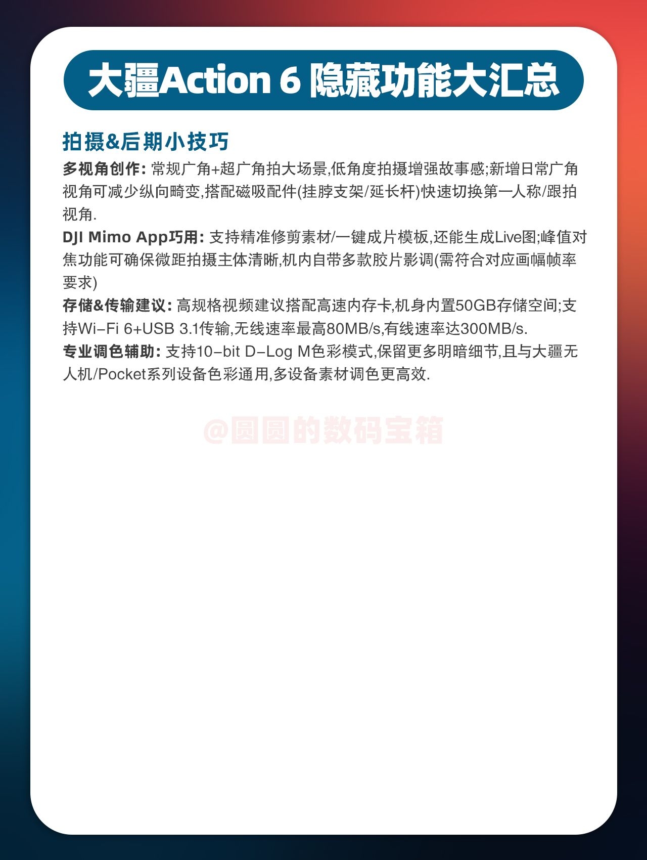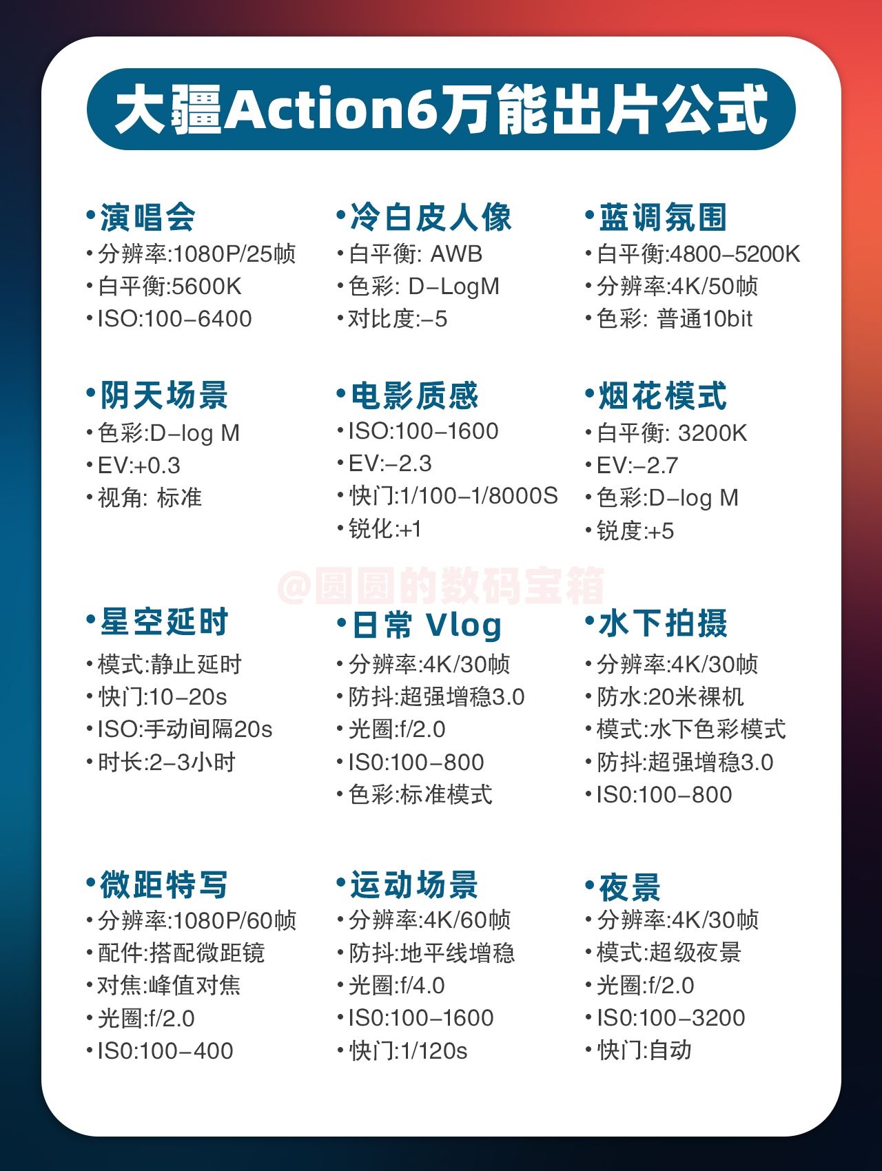 宝子们👋🏻大疆 Action 6拿到手却不会用?别急🤔圆圆连夜整理出了高频场景的保姆级出片参数,直接跟着抄作业~期待宝子们分享好看的照片🥳