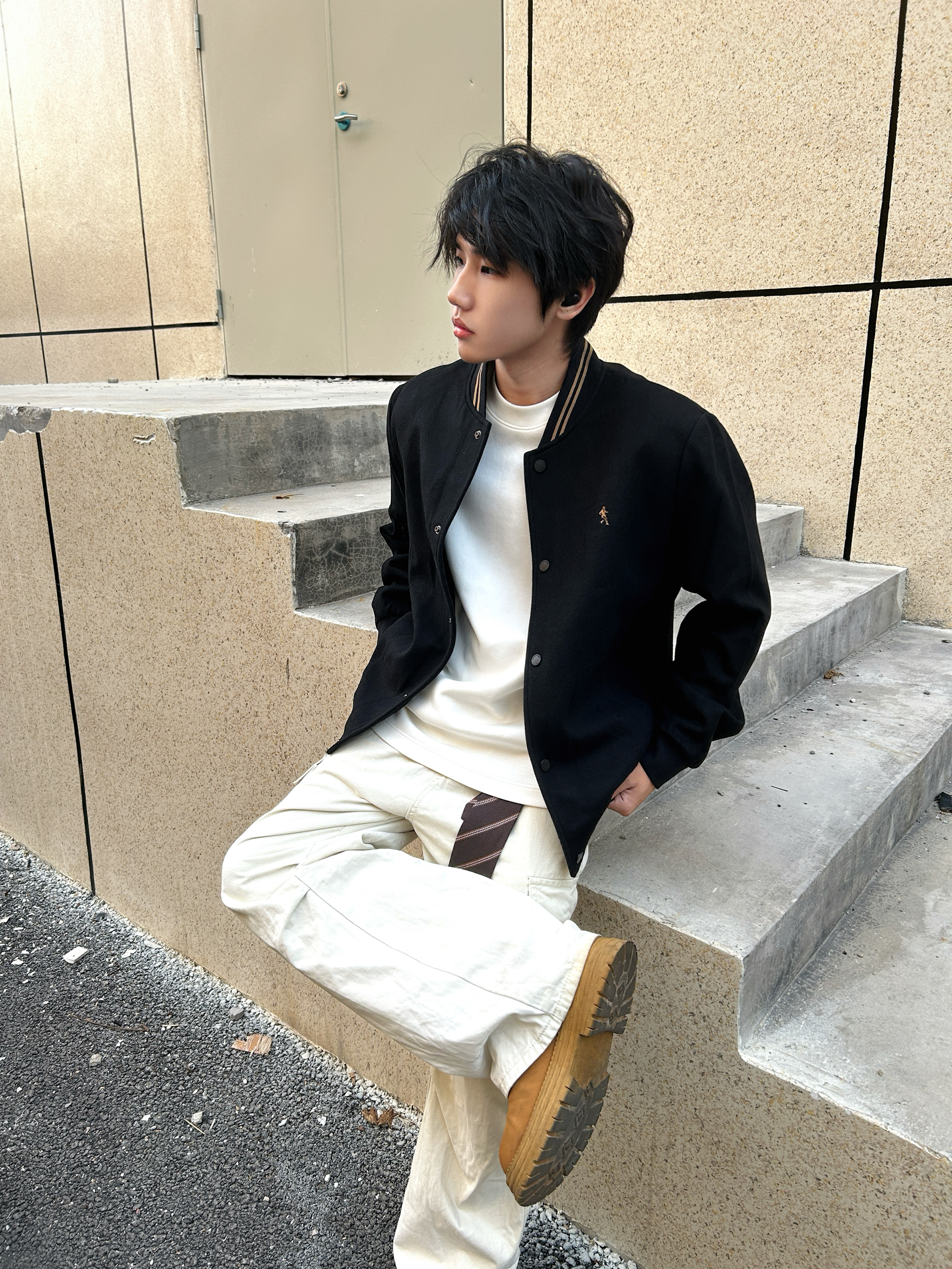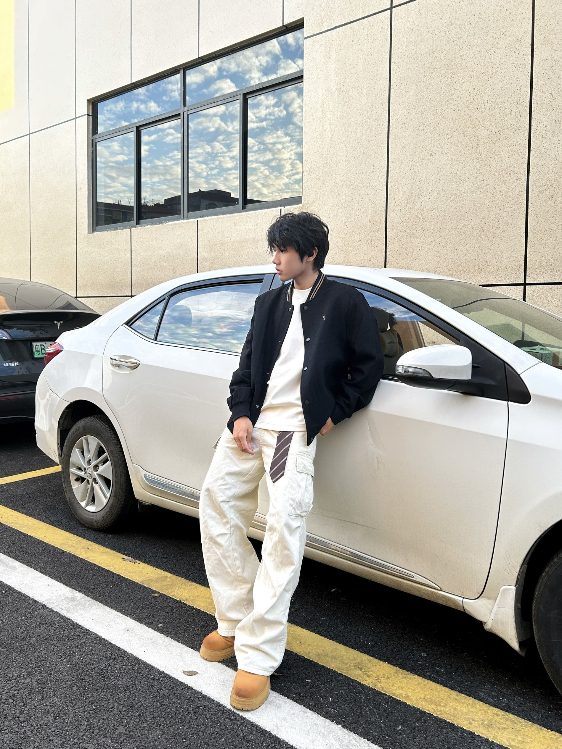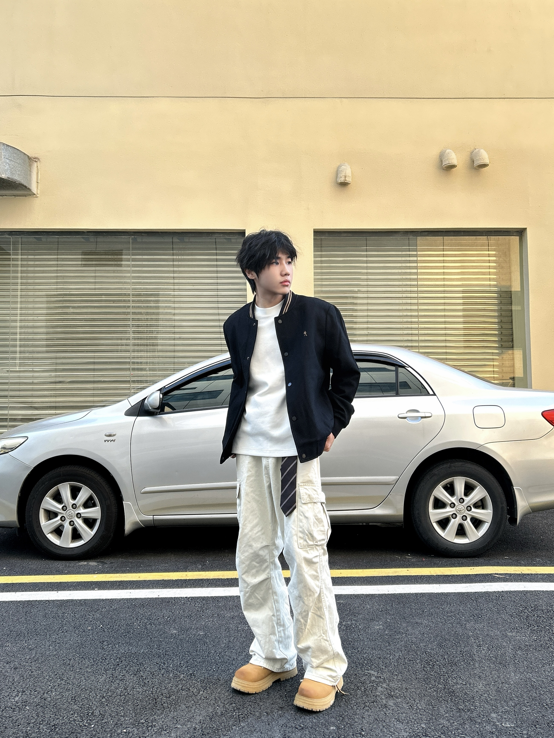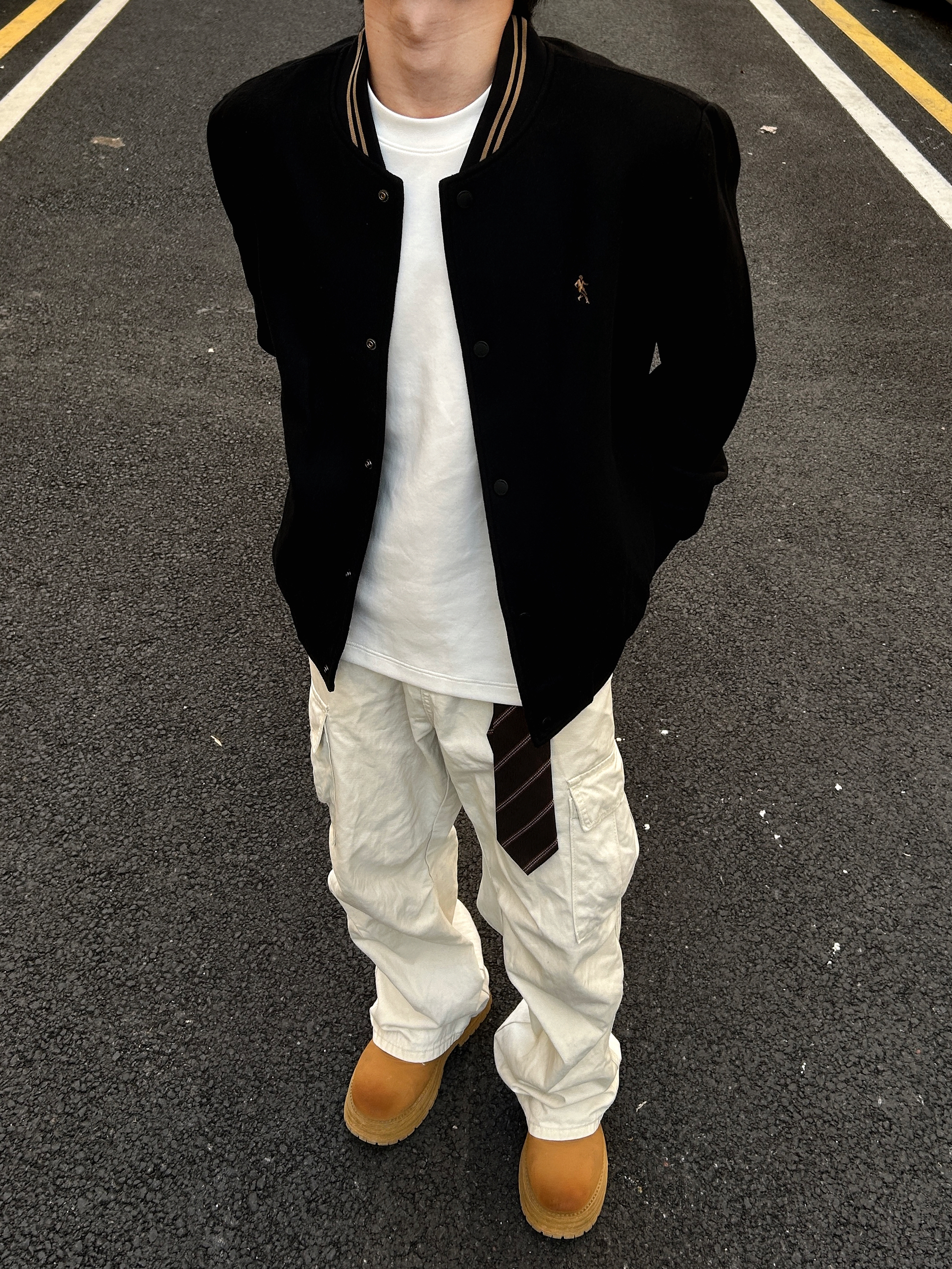 黑与白的低饱和碰撞 把松弛感焊在了穿搭里 棒球夹克的利落衬着白T的随性 米白工装裤坠着条领带当配饰 再踩双焦糖色厚底鞋 冷天里的松弛感 是冷暖色对冲的刚好 也是“不费力”的精准拿捏