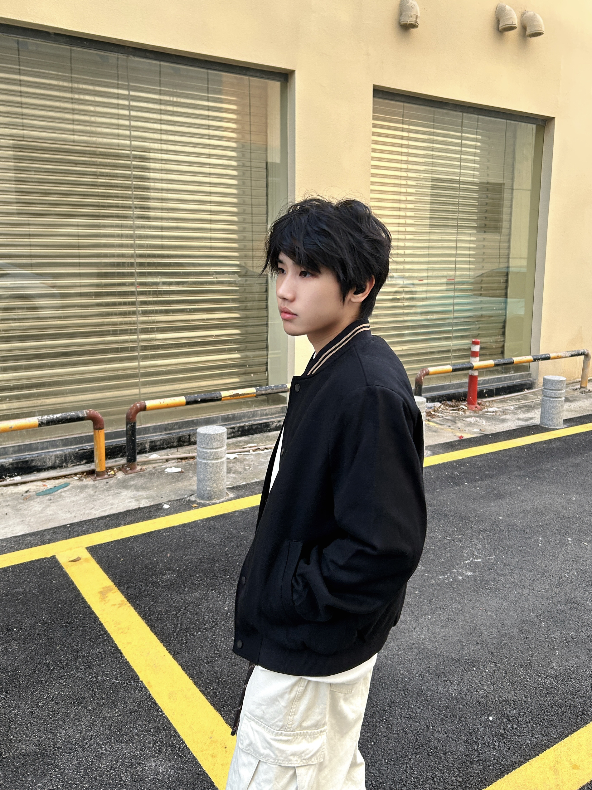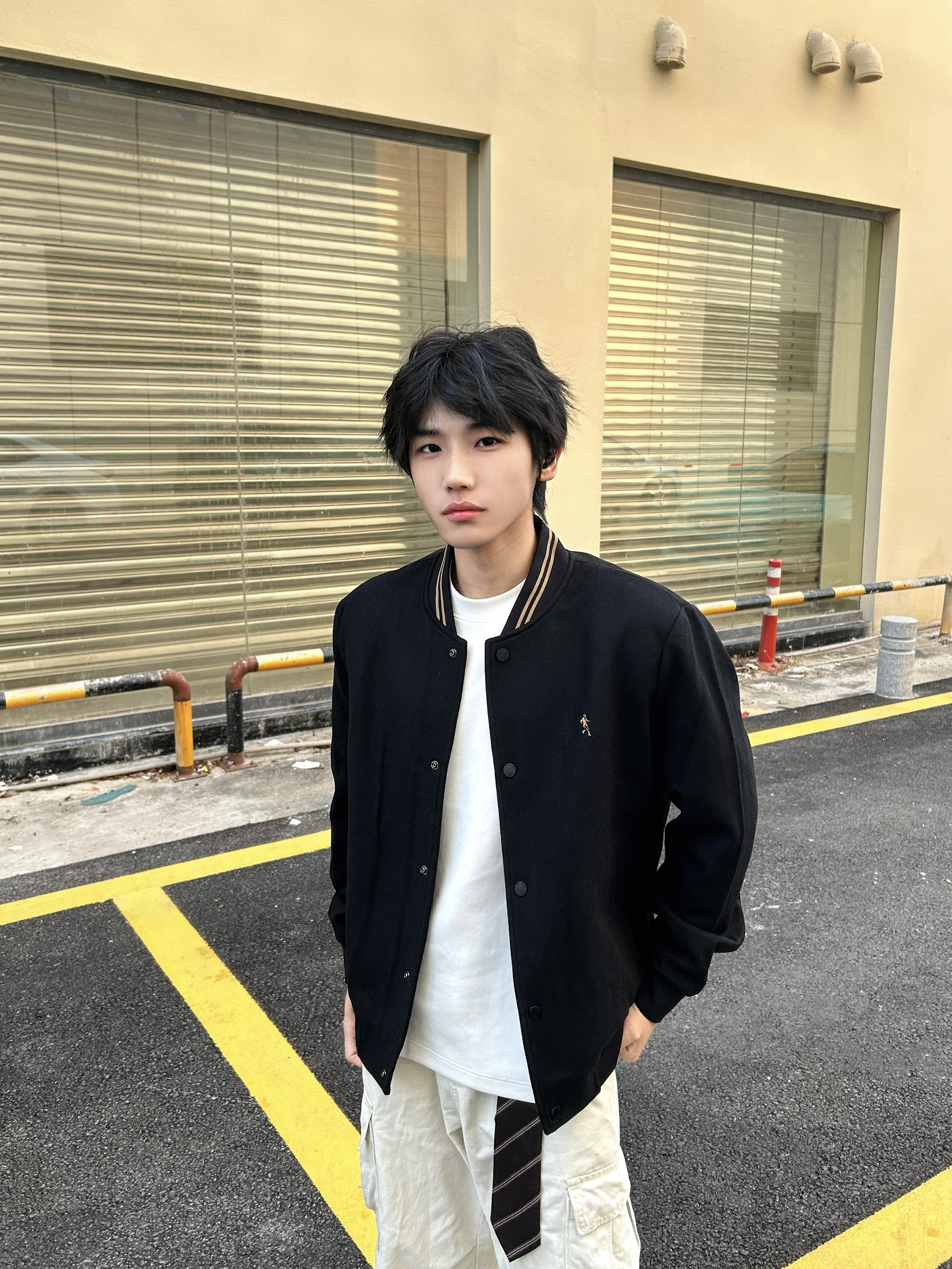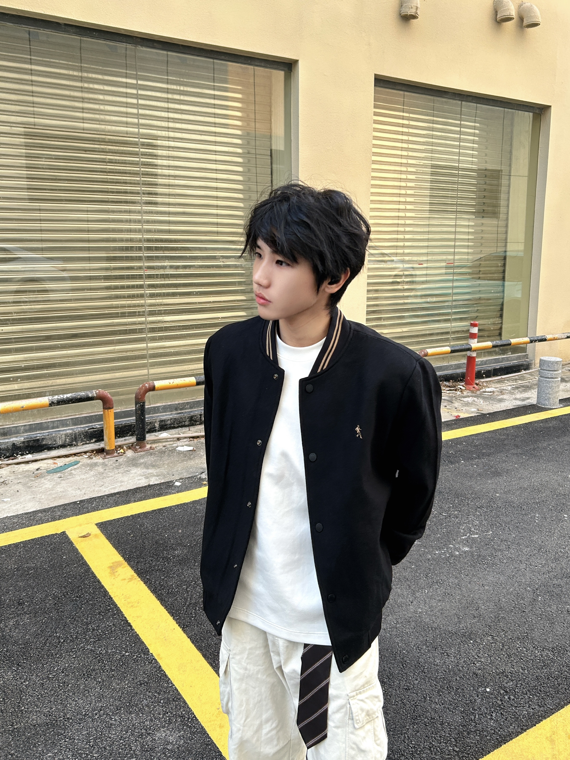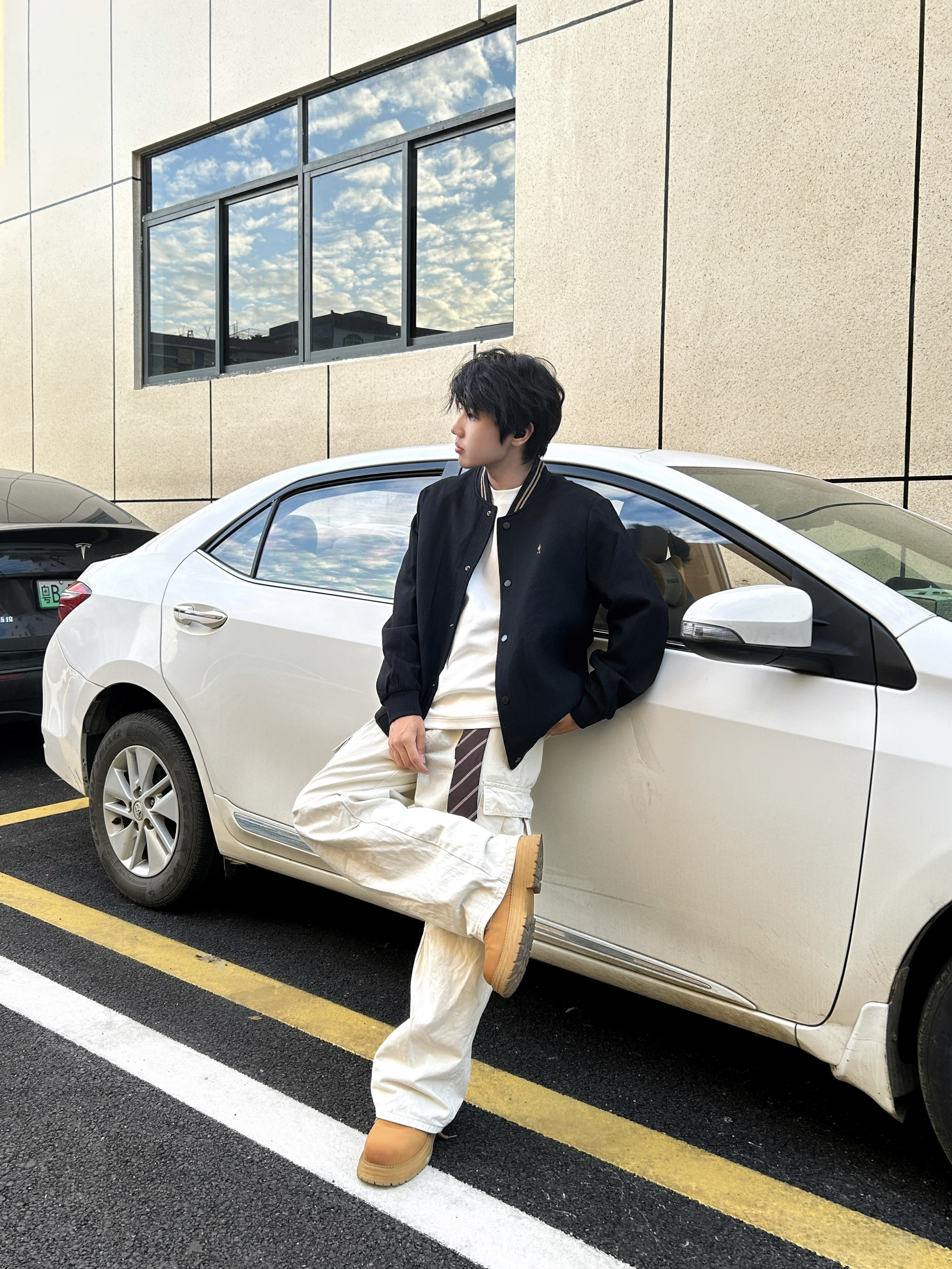 黑与白的低饱和碰撞 把松弛感焊在了穿搭里 棒球夹克的利落衬着白T的随性 米白工装裤坠着条领带当配饰 再踩双焦糖色厚底鞋 冷天里的松弛感 是冷暖色对冲的刚好 也是“不费力”的精准拿捏