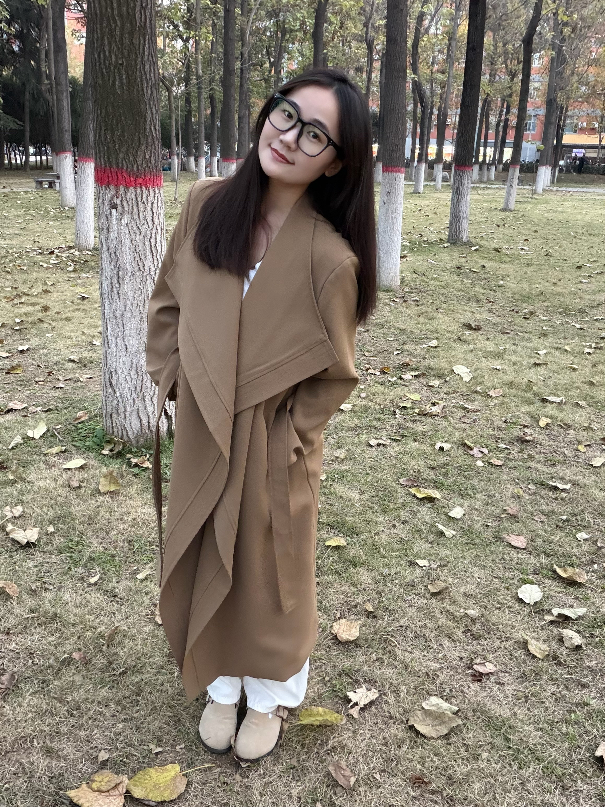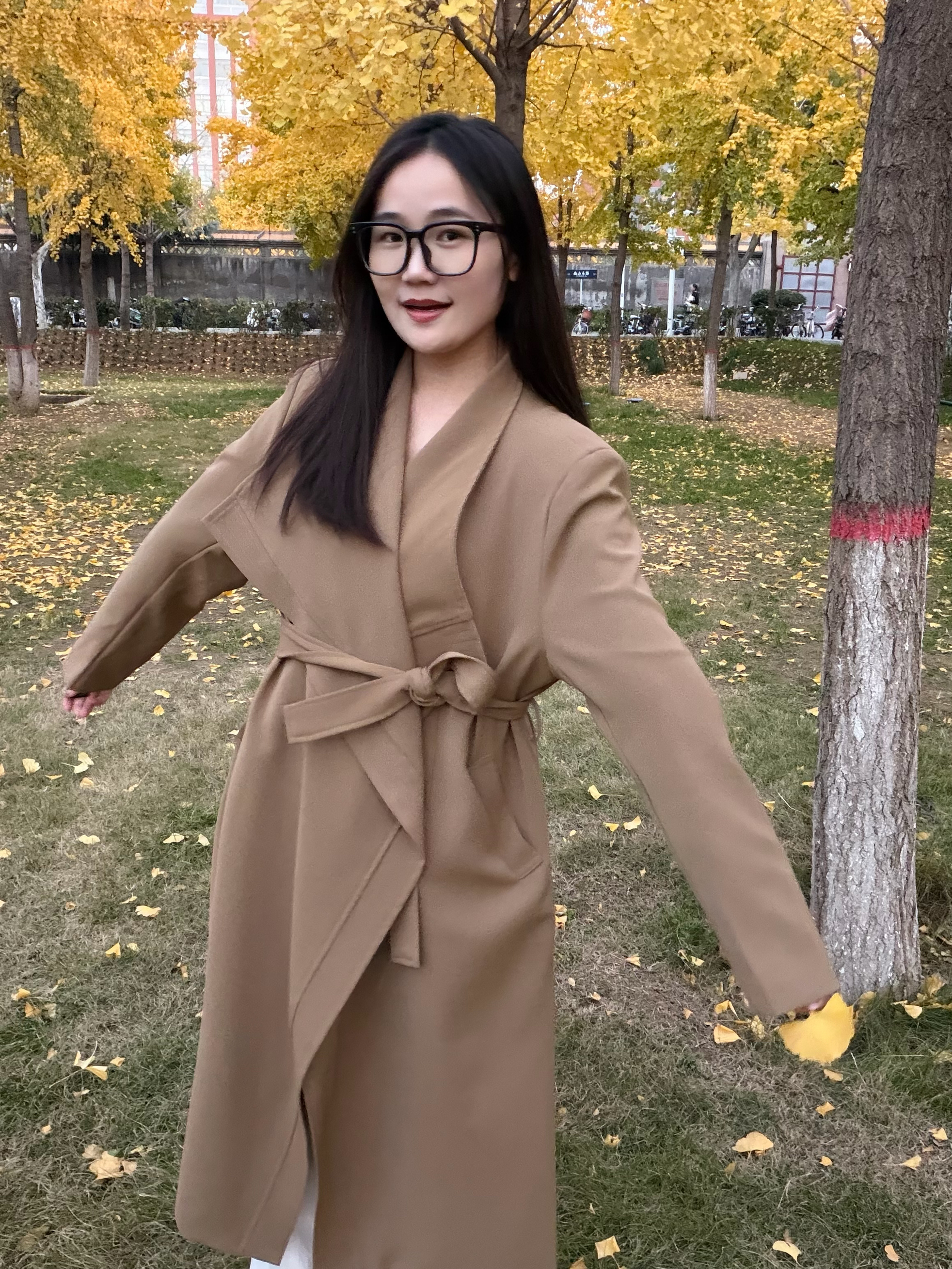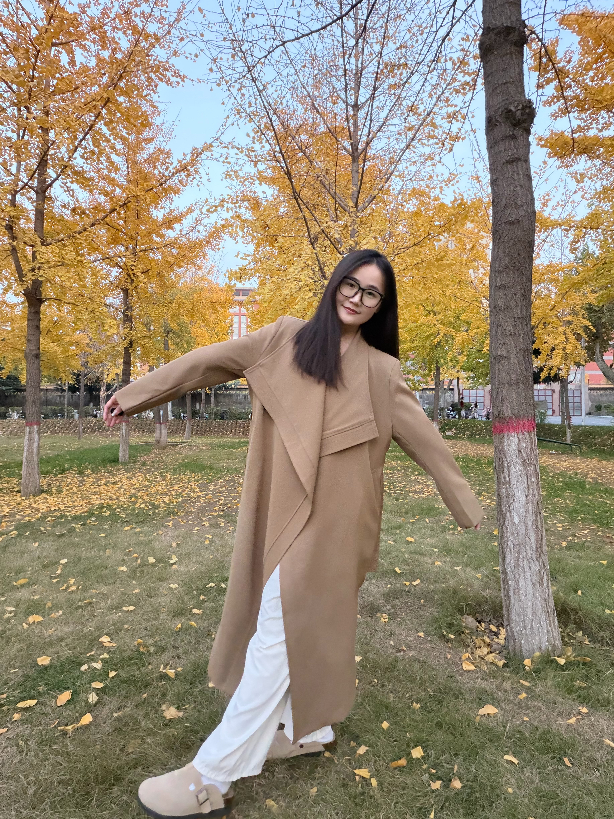 谁懂啊!满街都是打翻的银杏黄 赶紧来抓住秋日的尾巴啦~ 今天穿的这件卡其风衣?真的是‘秋日作弊神器’——大翻领一撑,松弛感直接拉满;垂感面料走路带风,配双勃肯鞋踩在落叶上,连风都是温柔的!💕 长度刚好遮肉显高,随便站在树下拍都是电影截图既视感🎬 秋天的快乐,是这件风衣给的!✨
