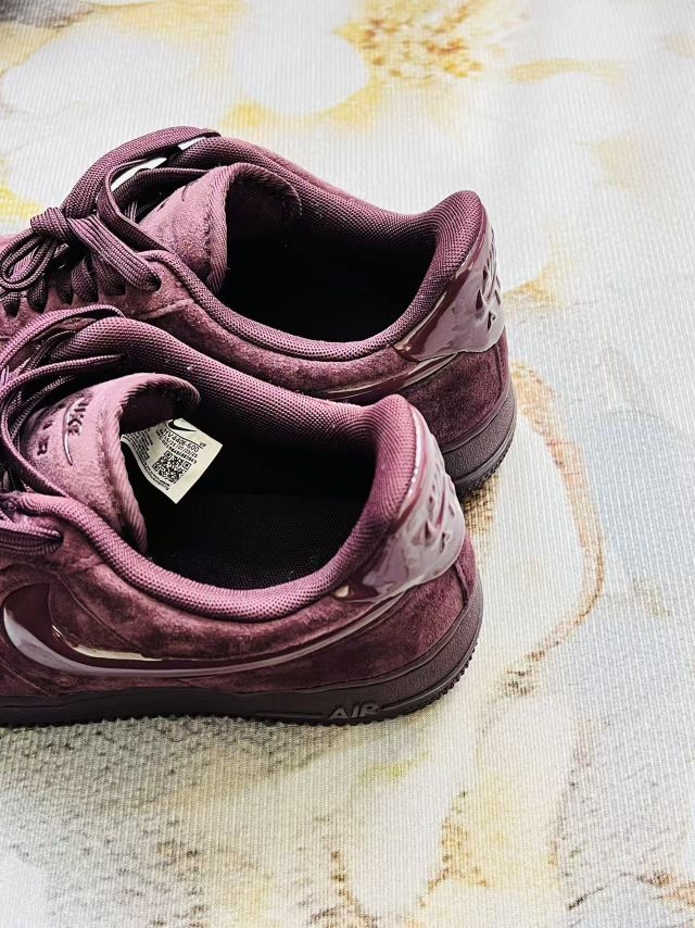 这双酒红AF1上脚一周,先说最直观的:麂皮摸着手感是真软,但这几天碰了点灰,拿布擦完留下点浅印子,得专门找绒面清洁剂,有点费事儿😮💨 脚感比普通款软点,走路半小时脚踝不硌,但鞋身比帆布款沉一丢丢,赶地铁走快了会觉得脚脖子有点坠。 漆皮勾子是真耐看,光线下会泛点细闪,但昨天不小心蹭到桌角,表面多了道浅划痕,没之前亮了。 配深色牛仔裤还行,颜色不跳但也不算特别出挑,搭浅色系裤子会有点“闷...