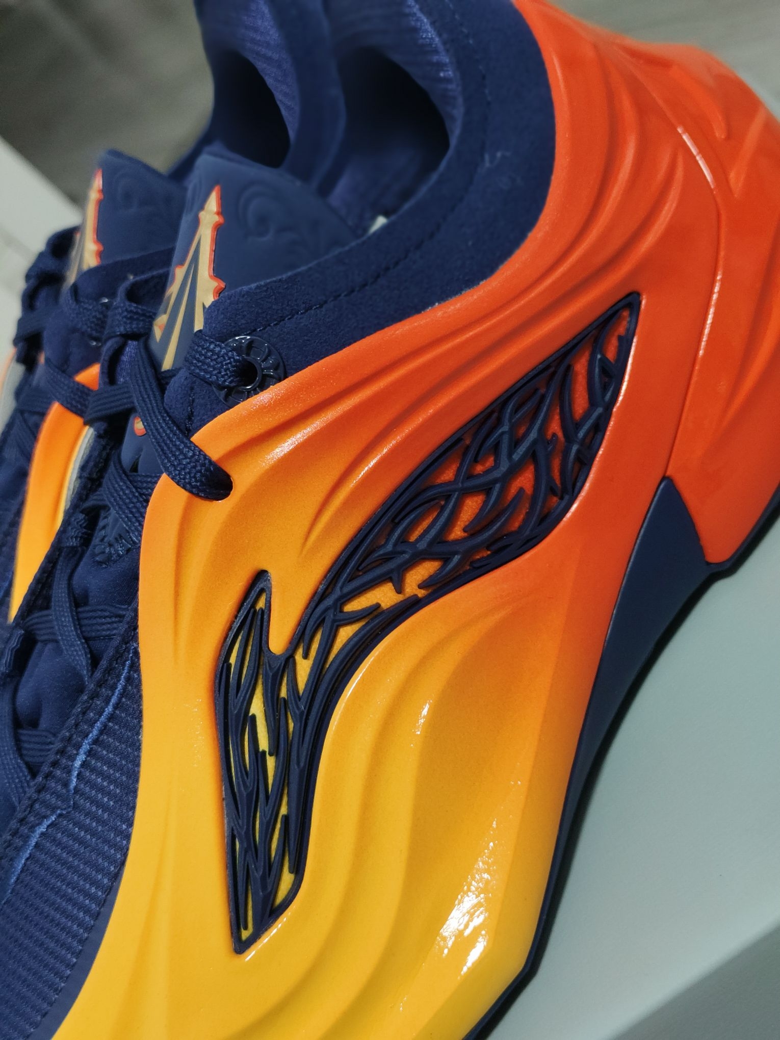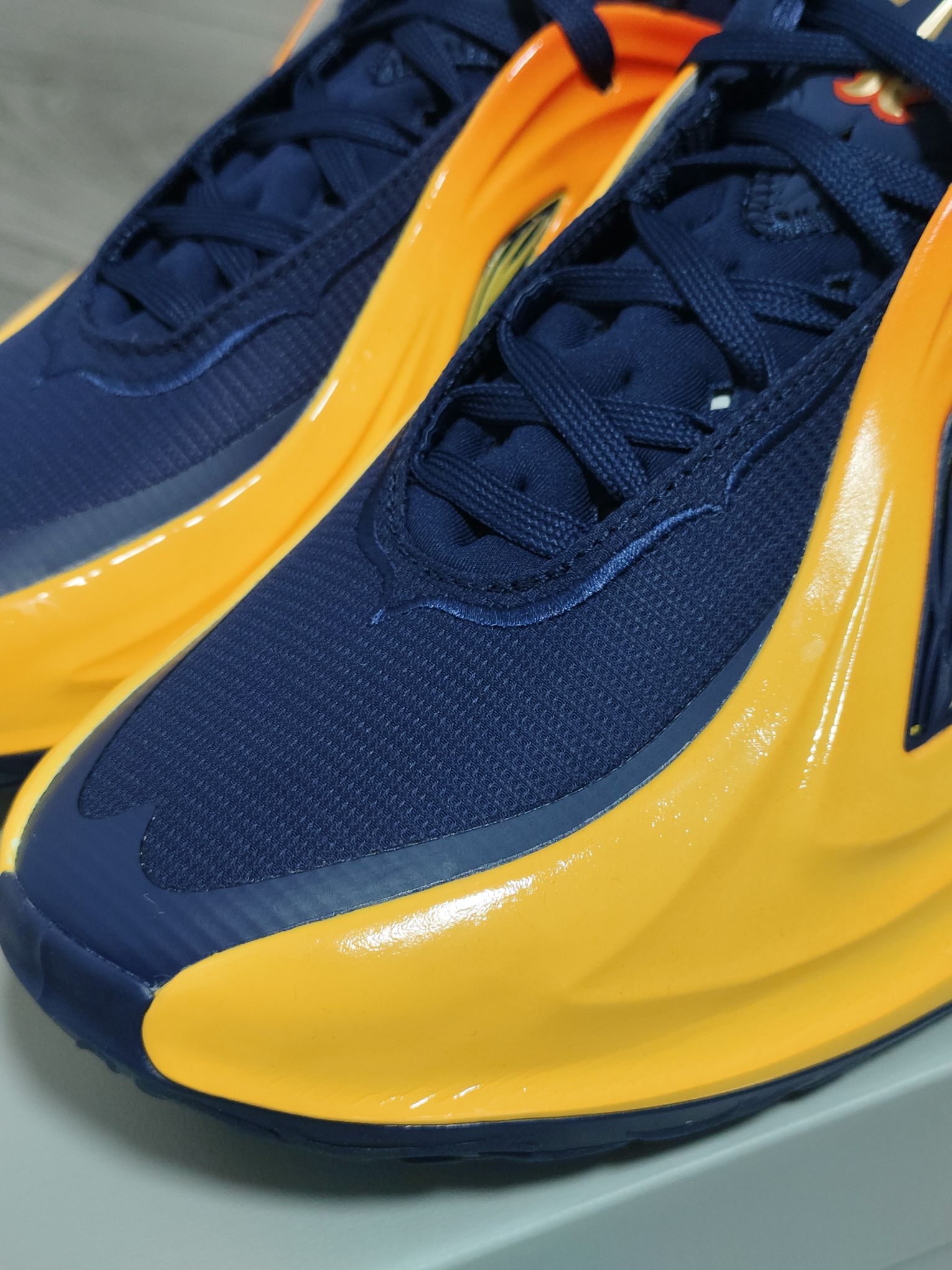 “湾区之刃”这个配色,勇士球迷闭眼入吧✨完美复制勇士队复古球衣 1️⃣支撑包裹:各个位置都有着很好的支撑性和包裹感,初上脚时鞋面偏硬的部分,存在感比较明显 2️⃣中底结构:“碳核芯”推进感挺劲爆,跑全场真的超爽,但是这个中底结构更适合腿部力量强的朋友 3️⃣尺码选择:正常脚正常选,鞋面前部压得比较低,高脚背的朋友先试穿吧
