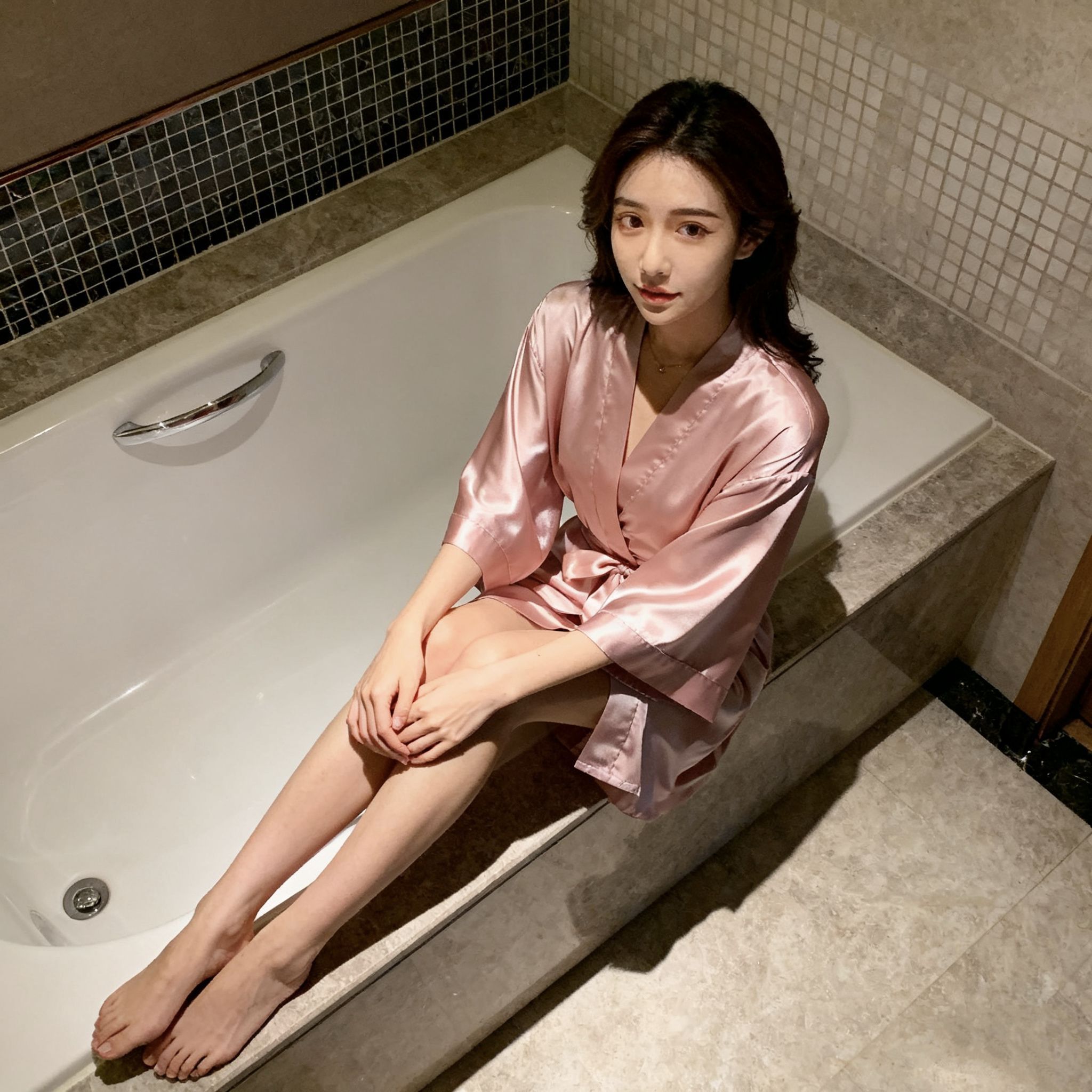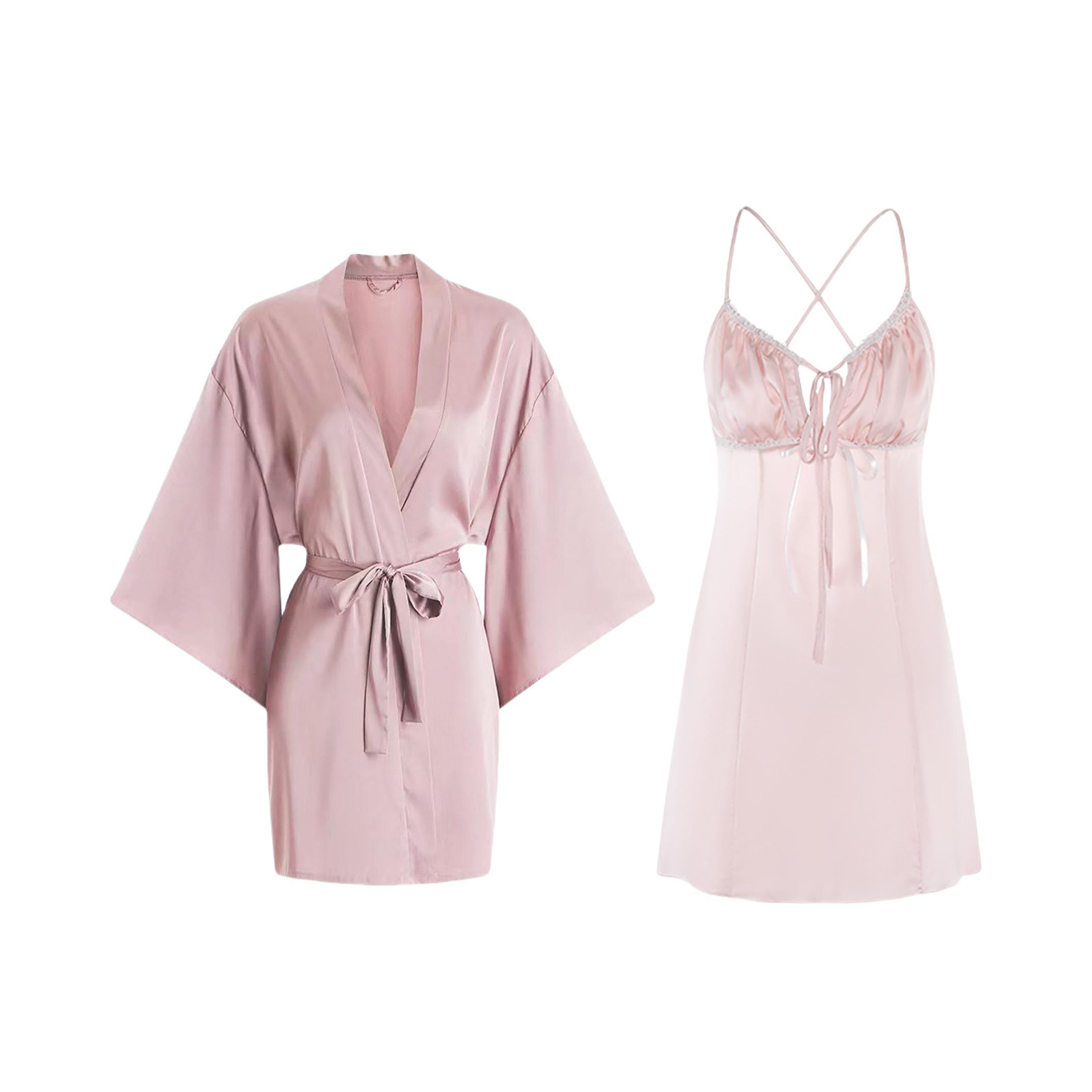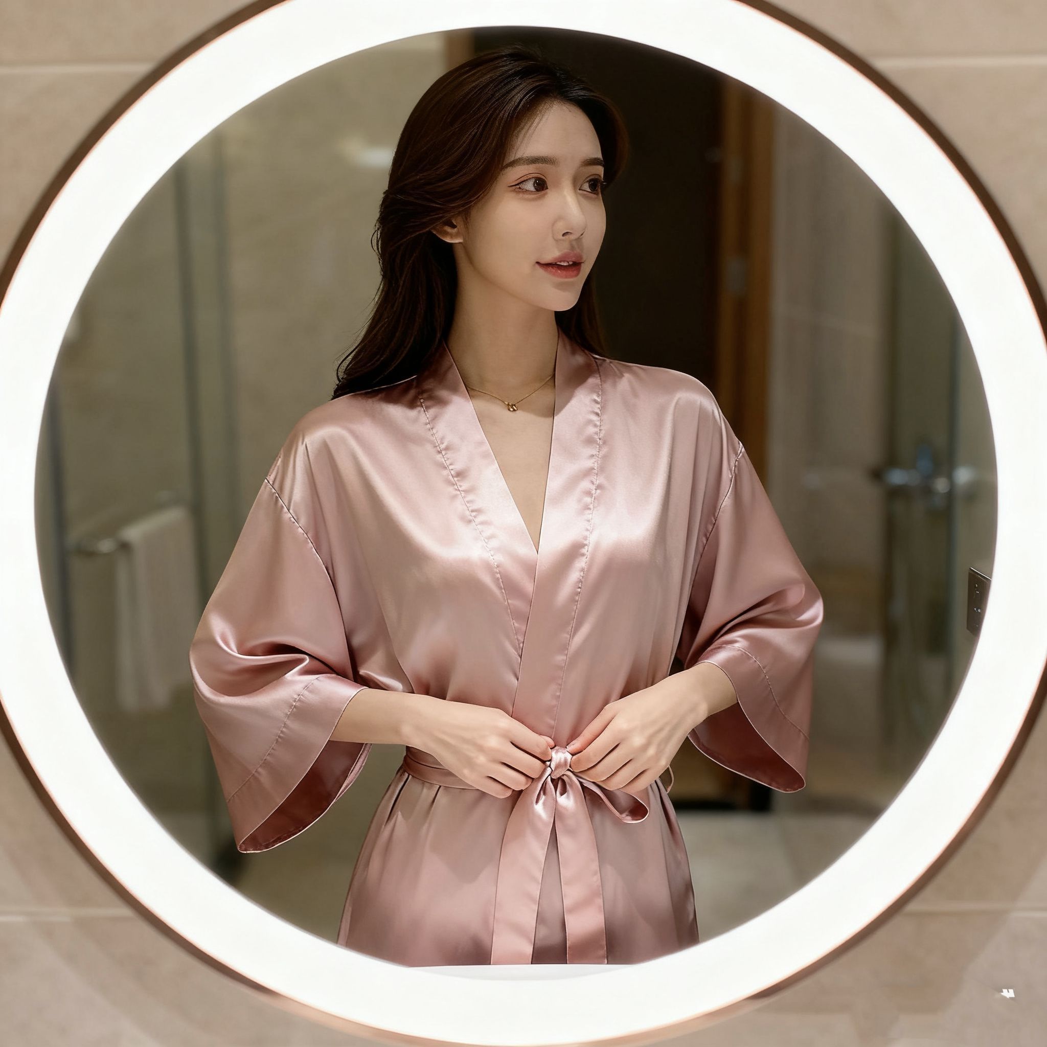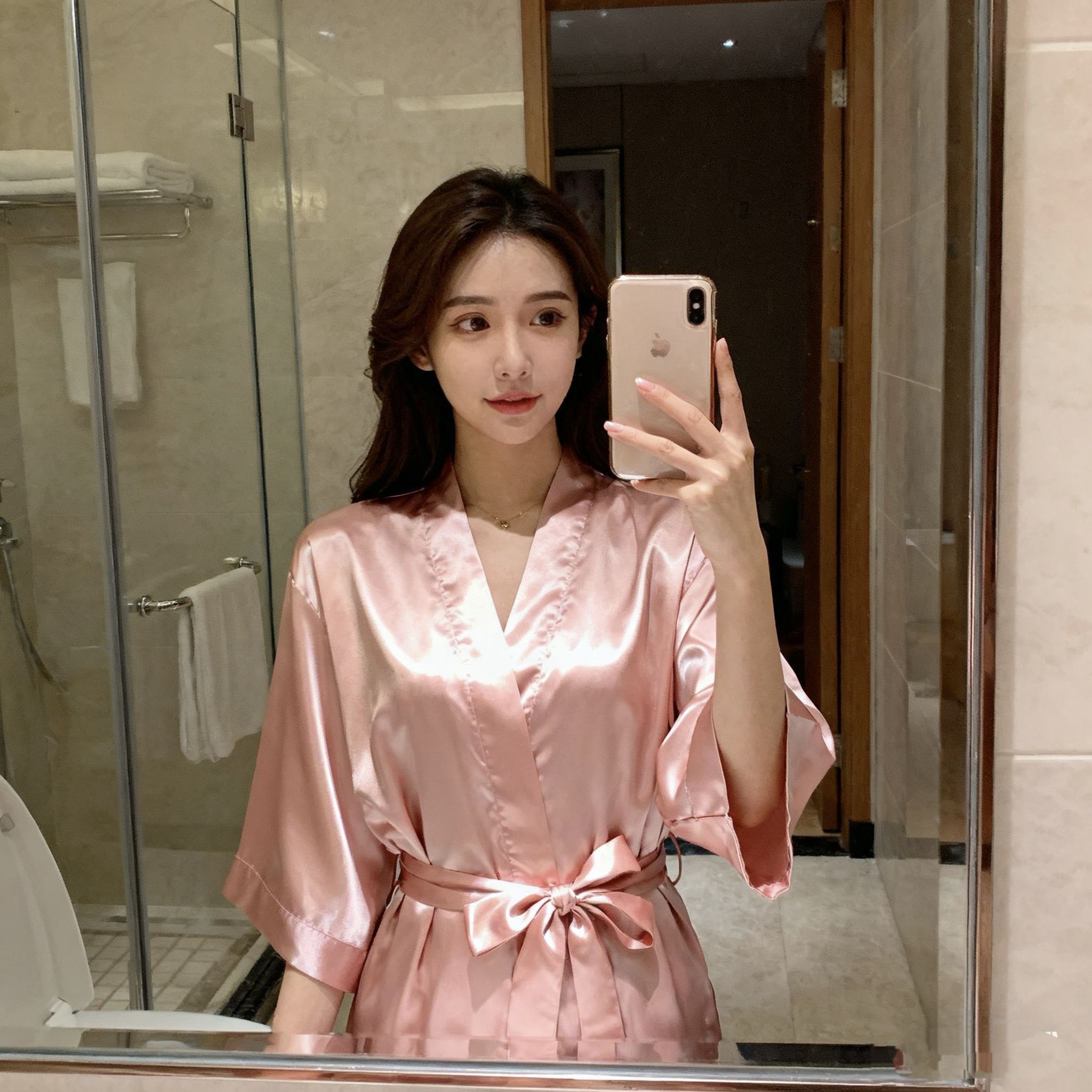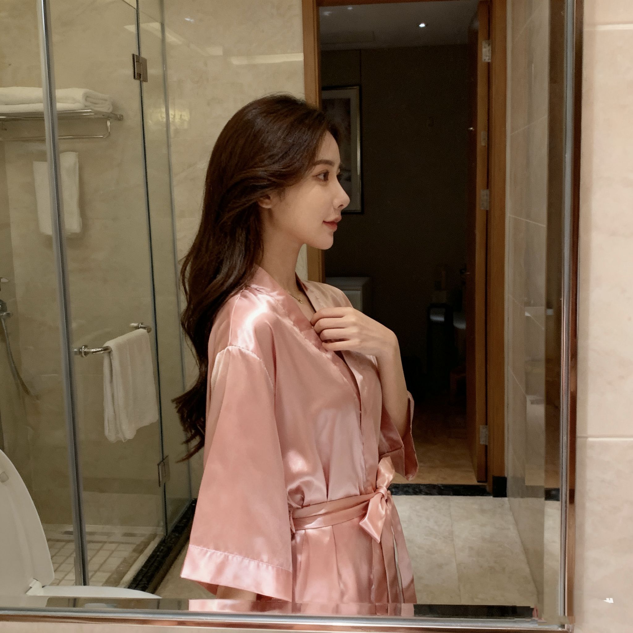 “谁懂啊!这粉缎面睡袍一整个把‘温柔大小姐’焊在身上了!拿到手质感绝了,滑溜溜的像裹了层奶皮,垂感好到完全不显皱~V领+宽袖设计把肩颈线条衬得巨柔和,腰带一系腰臀比直接封神!昨天洗完澡穿它在窗边自拍,阳光一照缎面泛着细闪,闺蜜说我像刚从韩剧里走出来的财阀千金!居家穿舒服到不想脱,偶尔下楼取快递套上也不尴尬,这颜值+舒适度直接列入年度最爱睡衣!