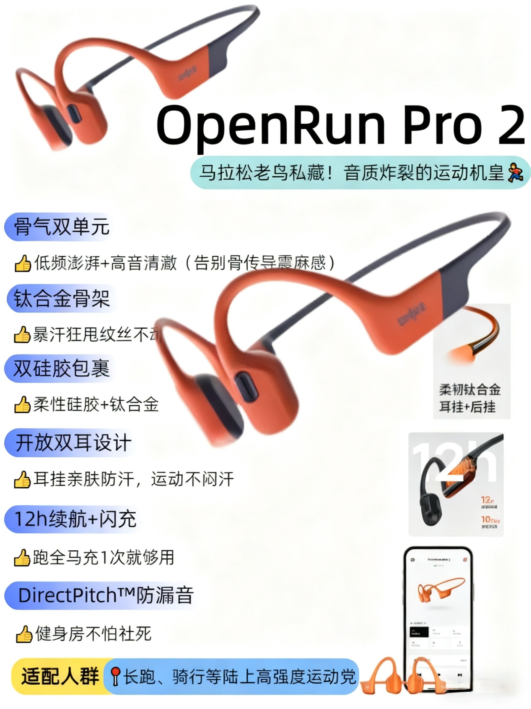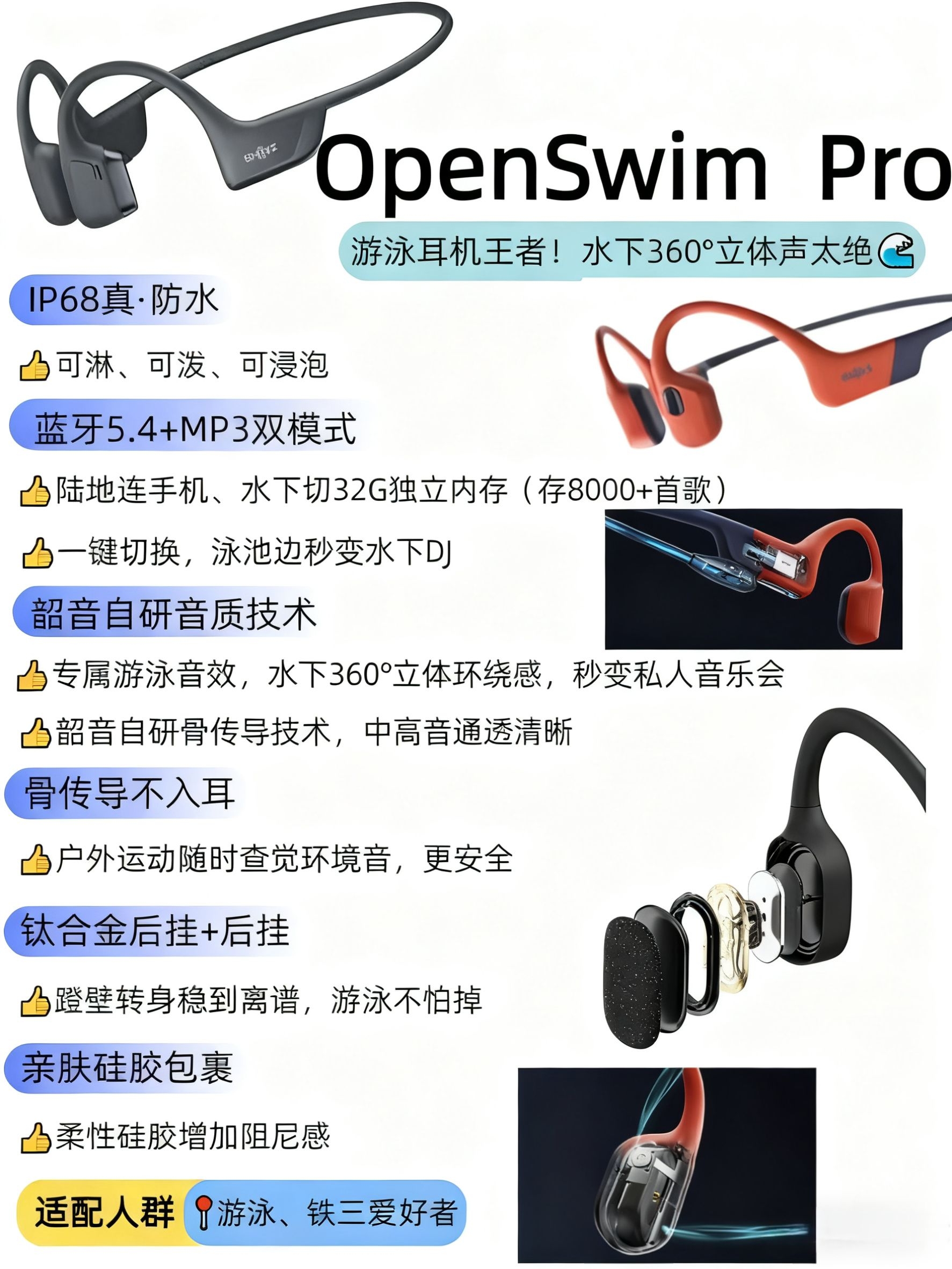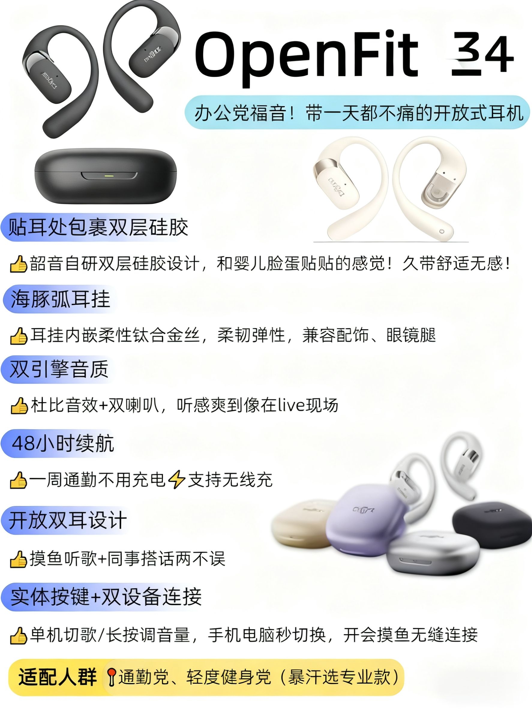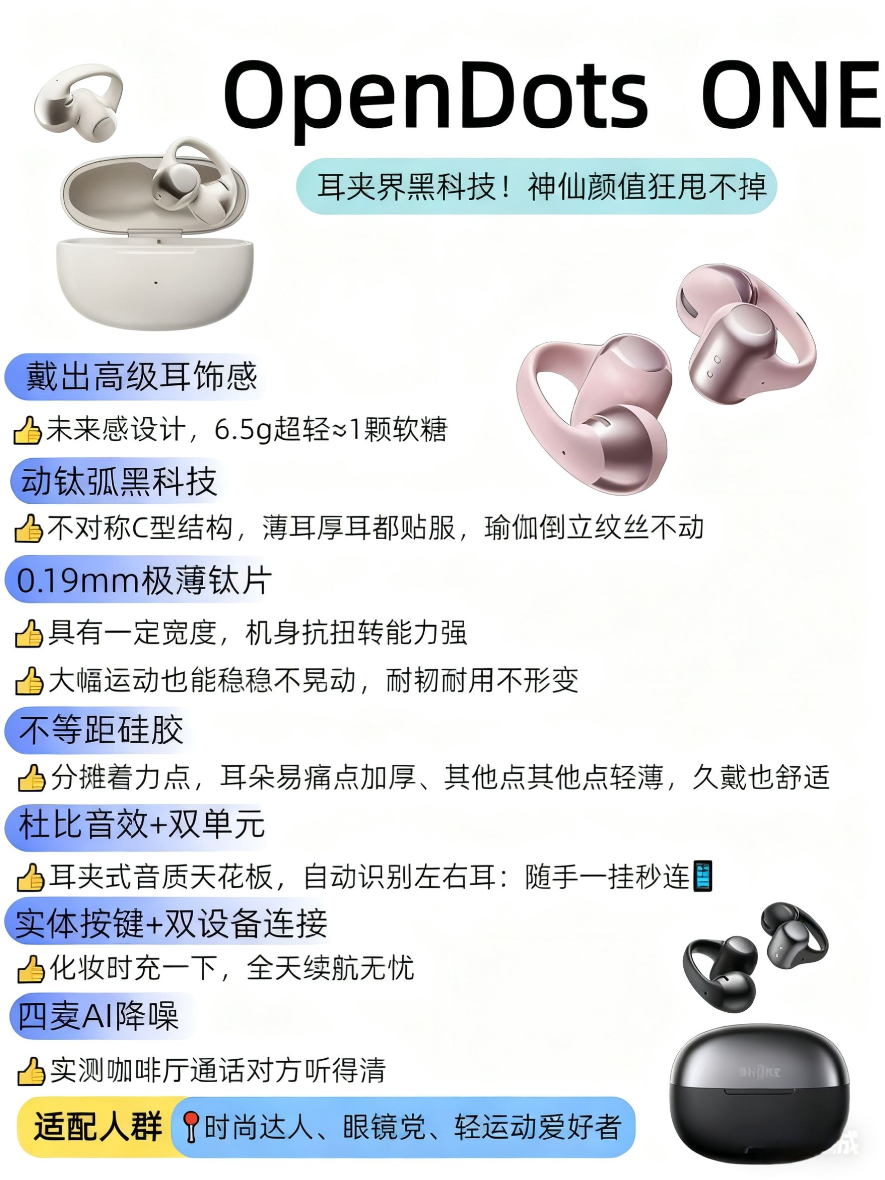 1. OpenFit 2+(舒适圈) “打工人通勤/办公刚需!戴8小时耳朵不喊疼,双层硅胶软到像贴婴儿肌,双引擎音质+48h续航,摸鱼听歌、开会连麦无缝切换~” 2. OpenDots ONE(动钛圈) “耳饰级颜值+狂甩不掉黑科技!6.5g轻如软糖,动钛弧适配各种耳型,瑜伽倒立都稳,AI降噪+双设备秒连,日常/轻运动都能打~” 3. OpenSwim Pro(游泳旗舰) “泳池/铁三党狂喜!IP...