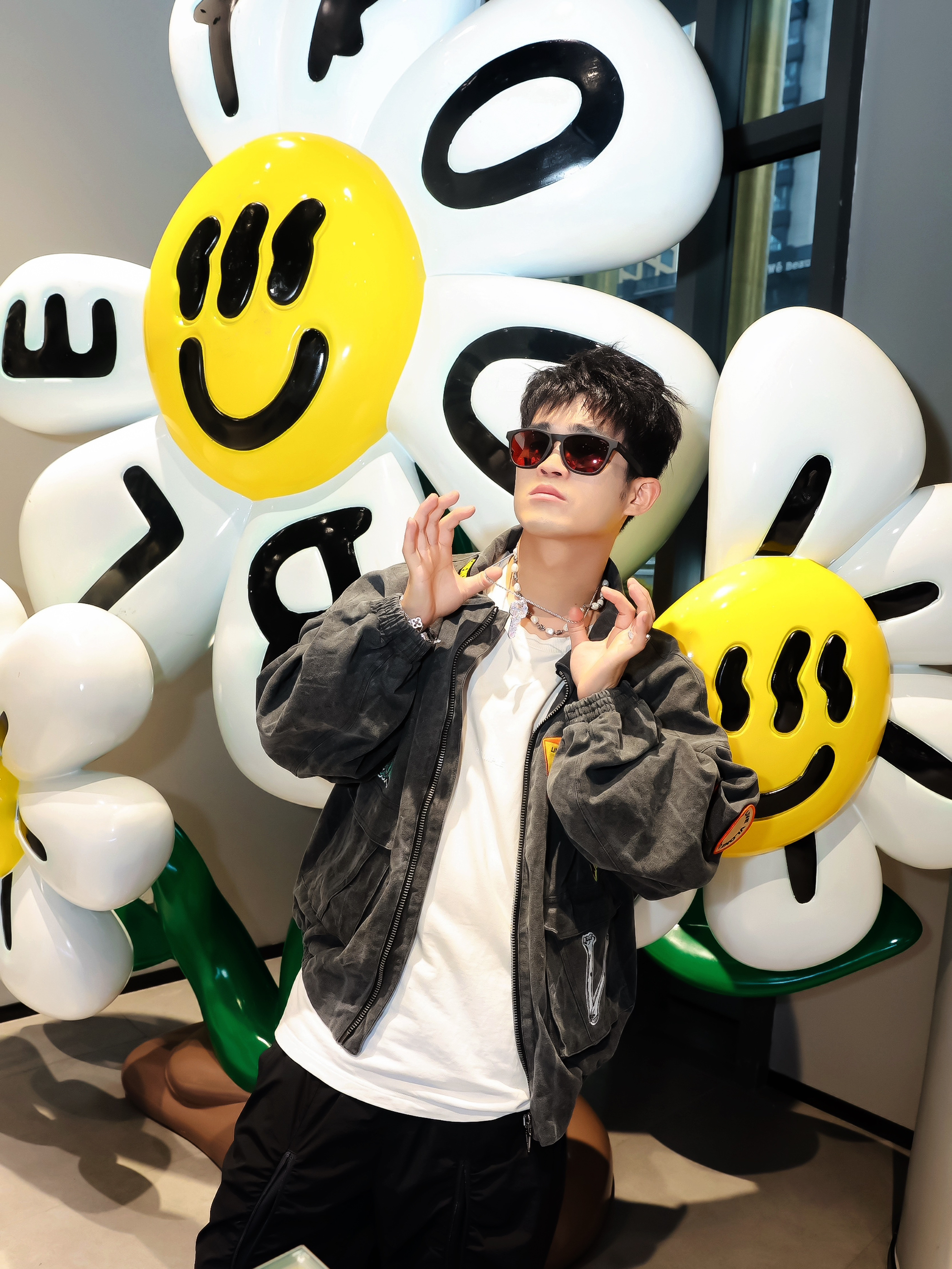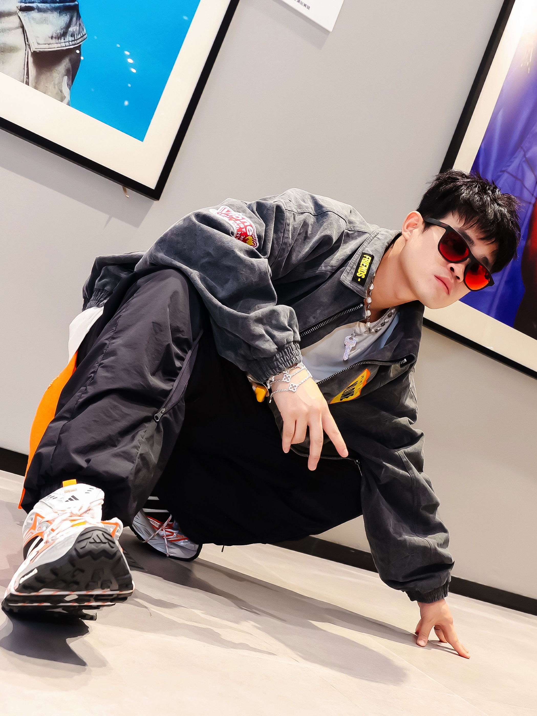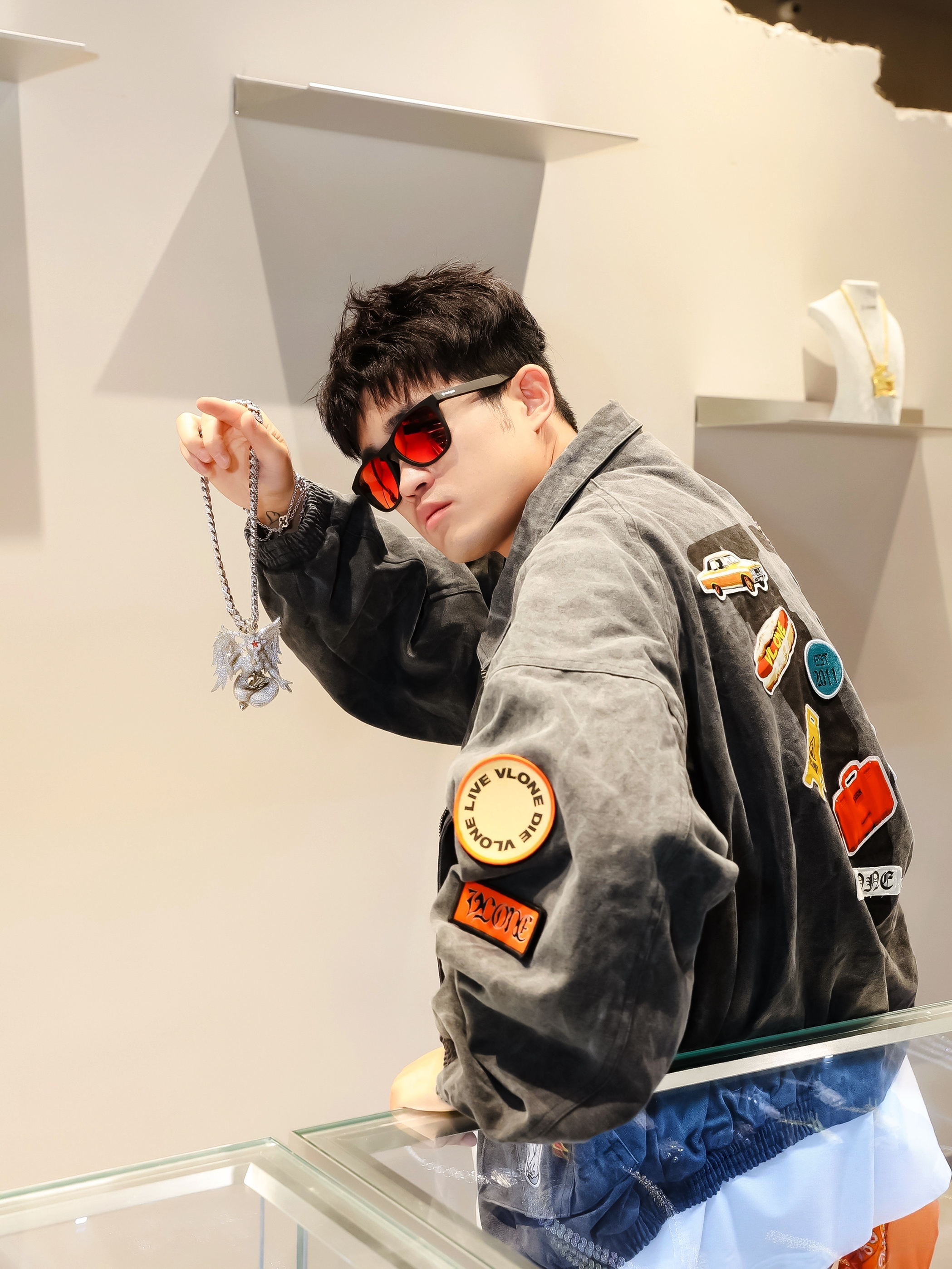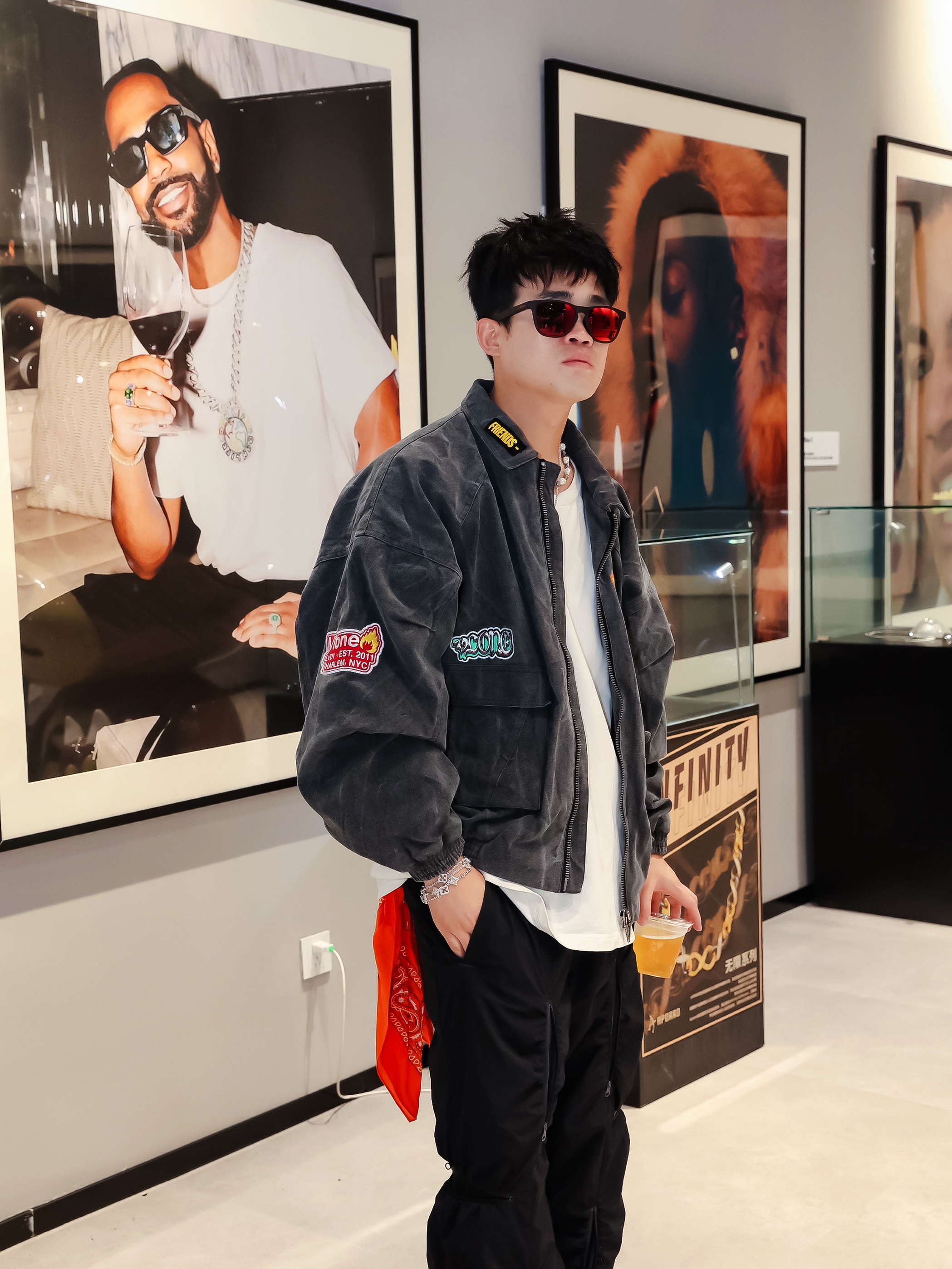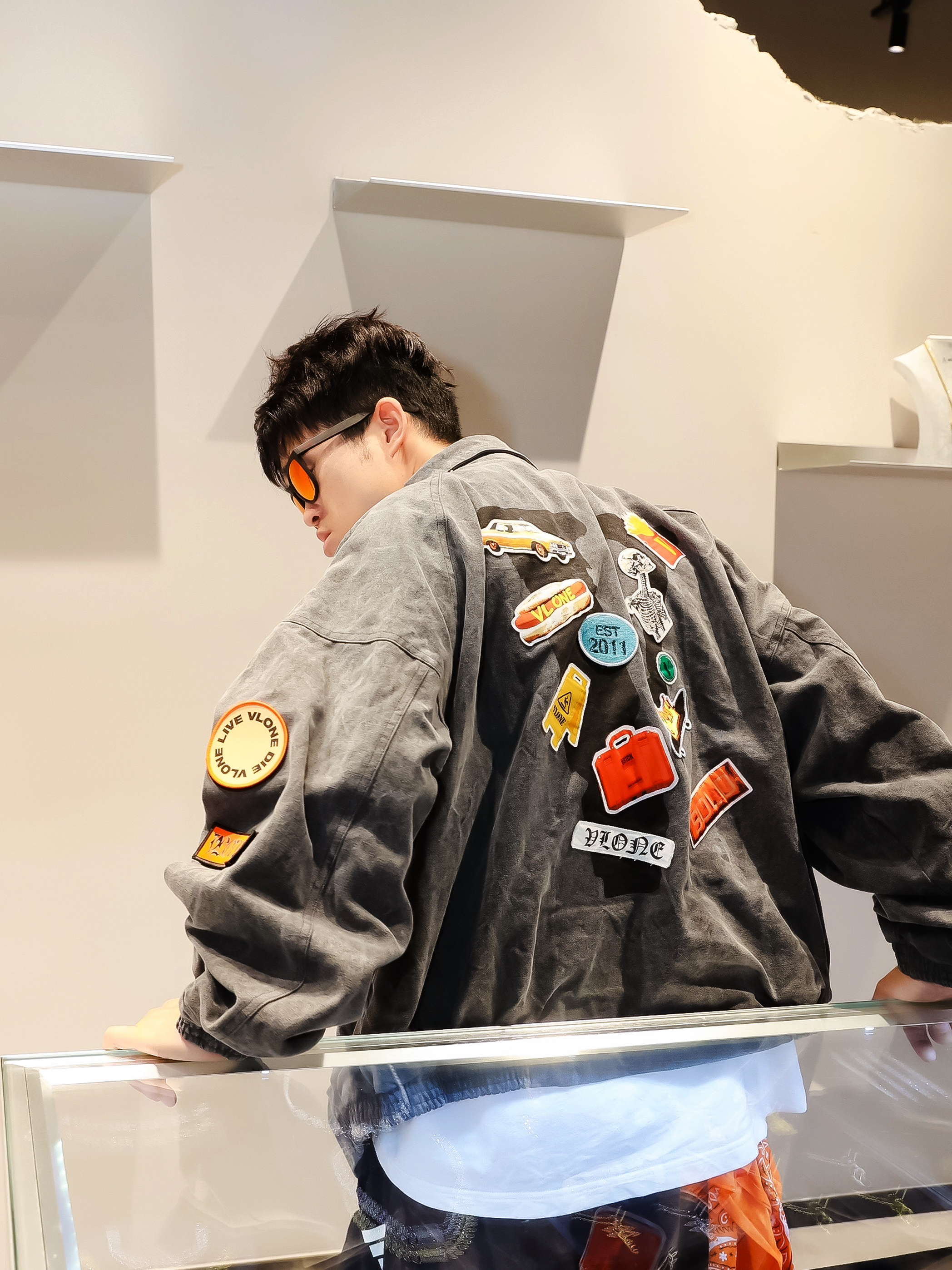 今日份OOTD解锁新皮肤🎨 VLONE 深灰徽章夹克/白T打底/黑色休闲工装裤 红色墨镜➕外套徽章呼应细节💯 脚踩拼接配色运动鞋 松弛感拿捏了 立体几何造型不撞款 搭深色外套瞬间提亮层次✨ 穿搭小心得: 用配饰颜色呼应服装细节 阔腿裤+厚底鞋显比例一绝