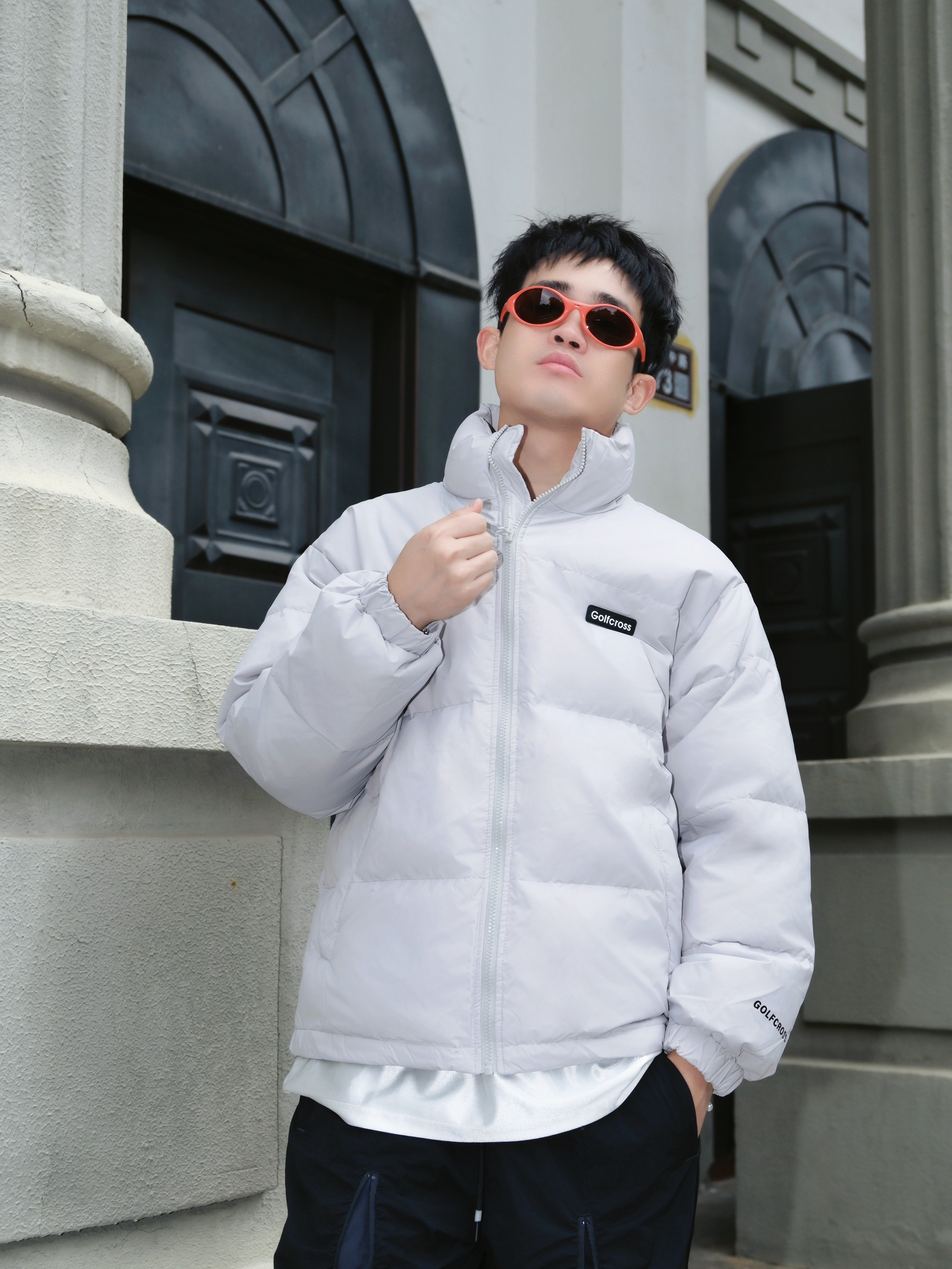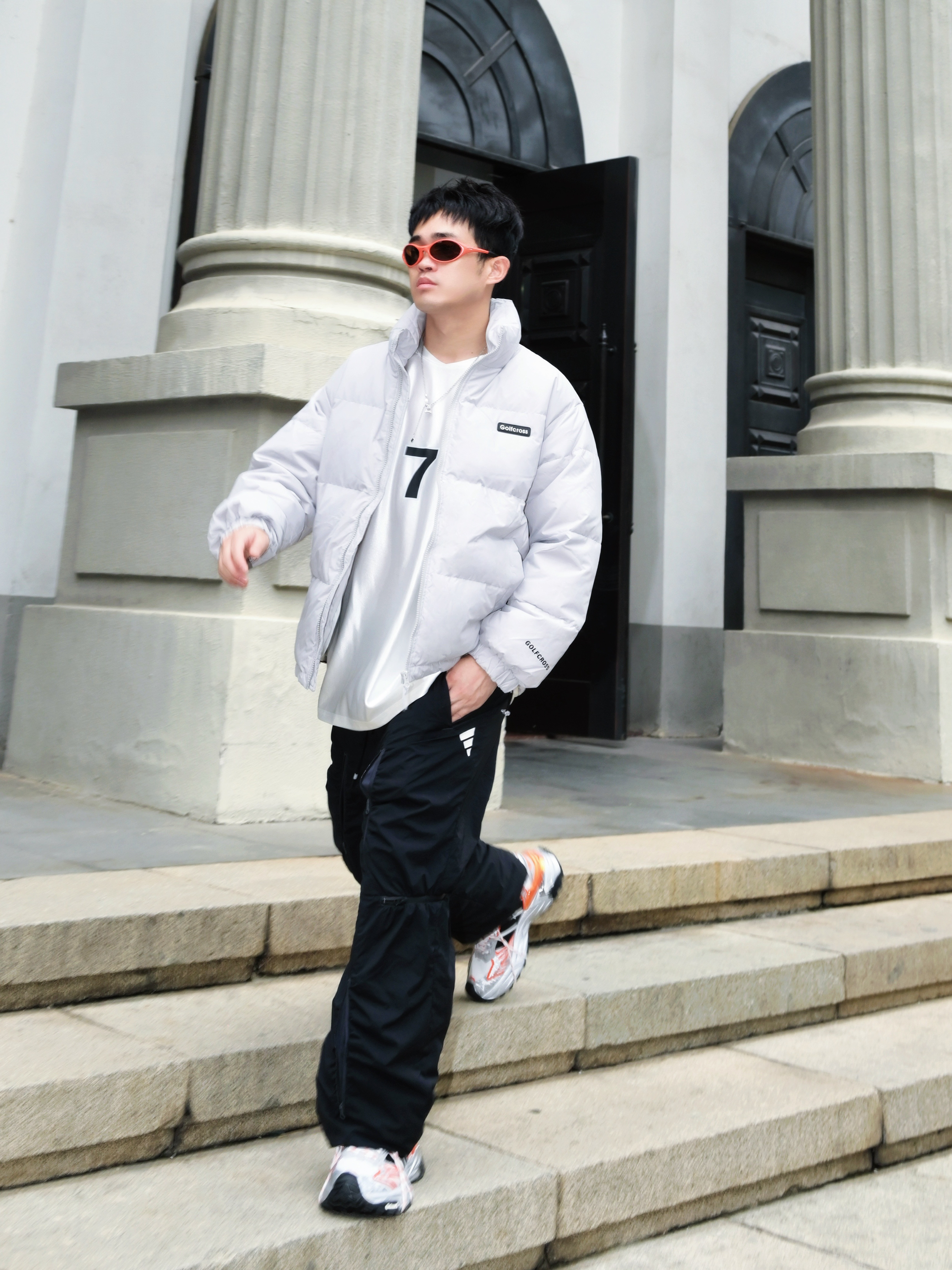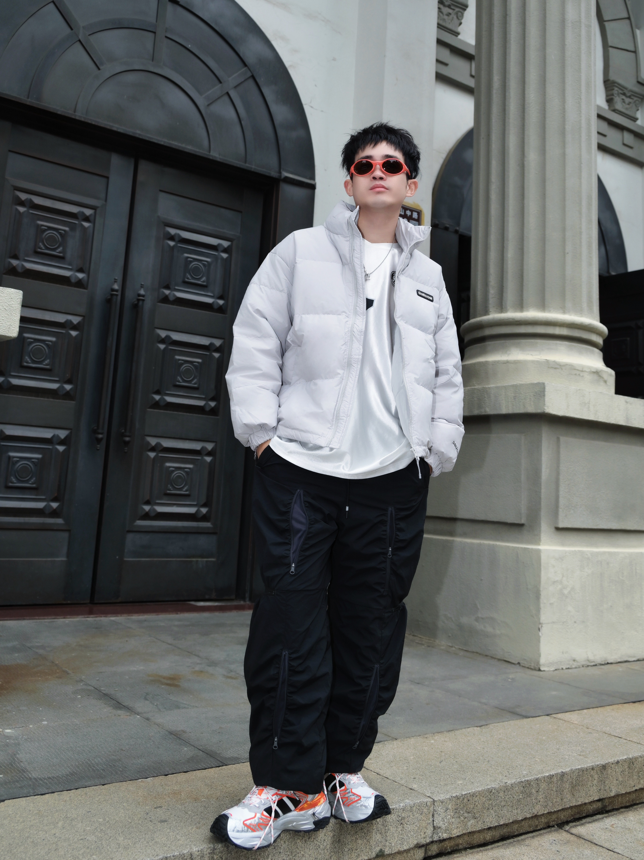 最近降温太猛了 翻出这件白鸭绒羽绒服 真的被它的百搭性惊到了✨ ▪️穿搭信息 外套:灰色立领羽绒服 内搭:纯白长袖T恤 裤子:黑色侧条纹休闲裤 鞋子:白橙配色老爹鞋 配饰:橙色墨镜➕银色项链 ▪️搭配思路 • 整体选择「黑白灰」基础色系 • 用橙色运动鞋和橙色墨镜提亮 • 侧条纹裤子拉长腿部线条 • 立领设计不用围巾也保暖 这件羽绒服属于韩系面包服版型 不会显得臃肿 小个子男生也能驾驭 白鸭绒填充...