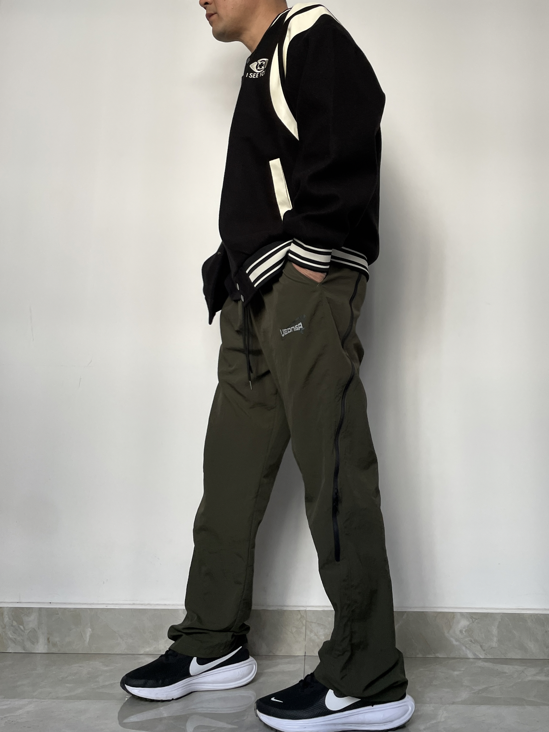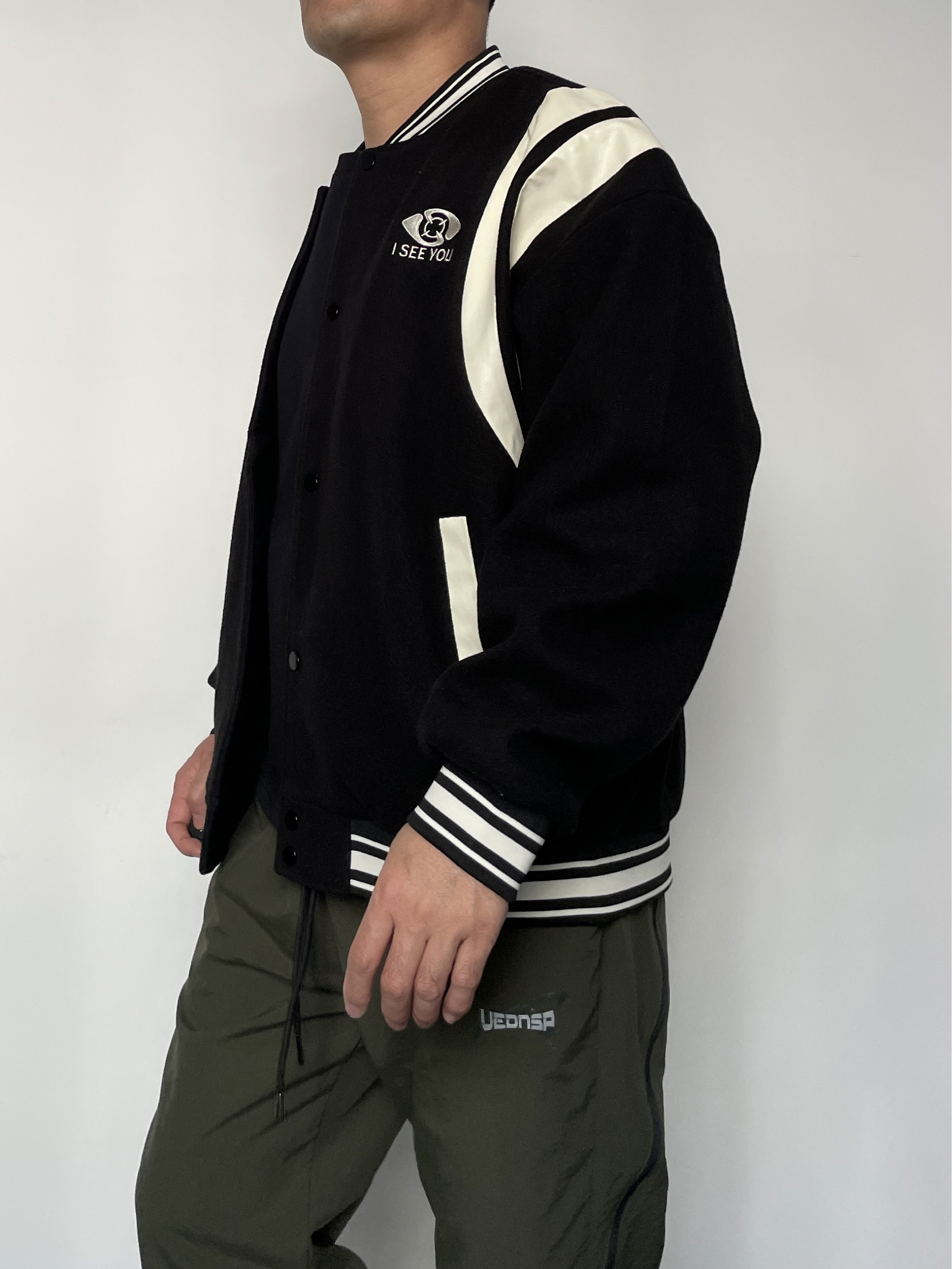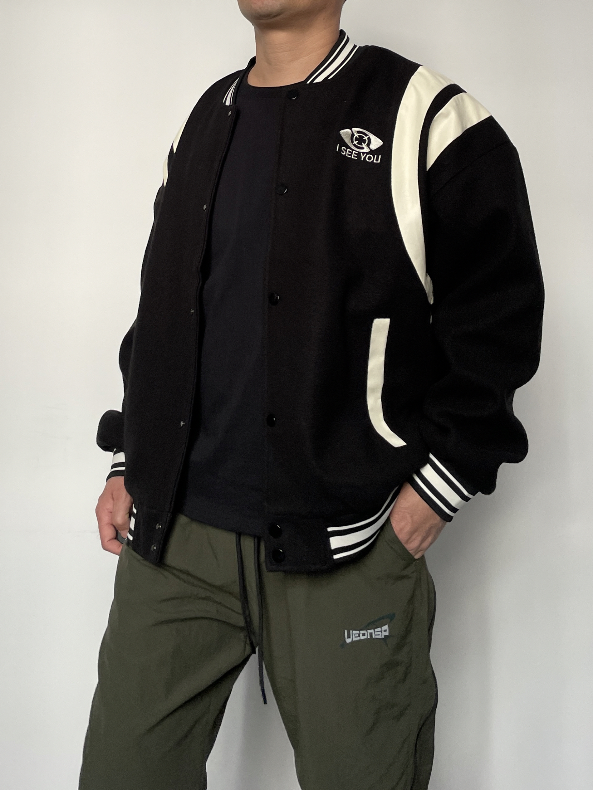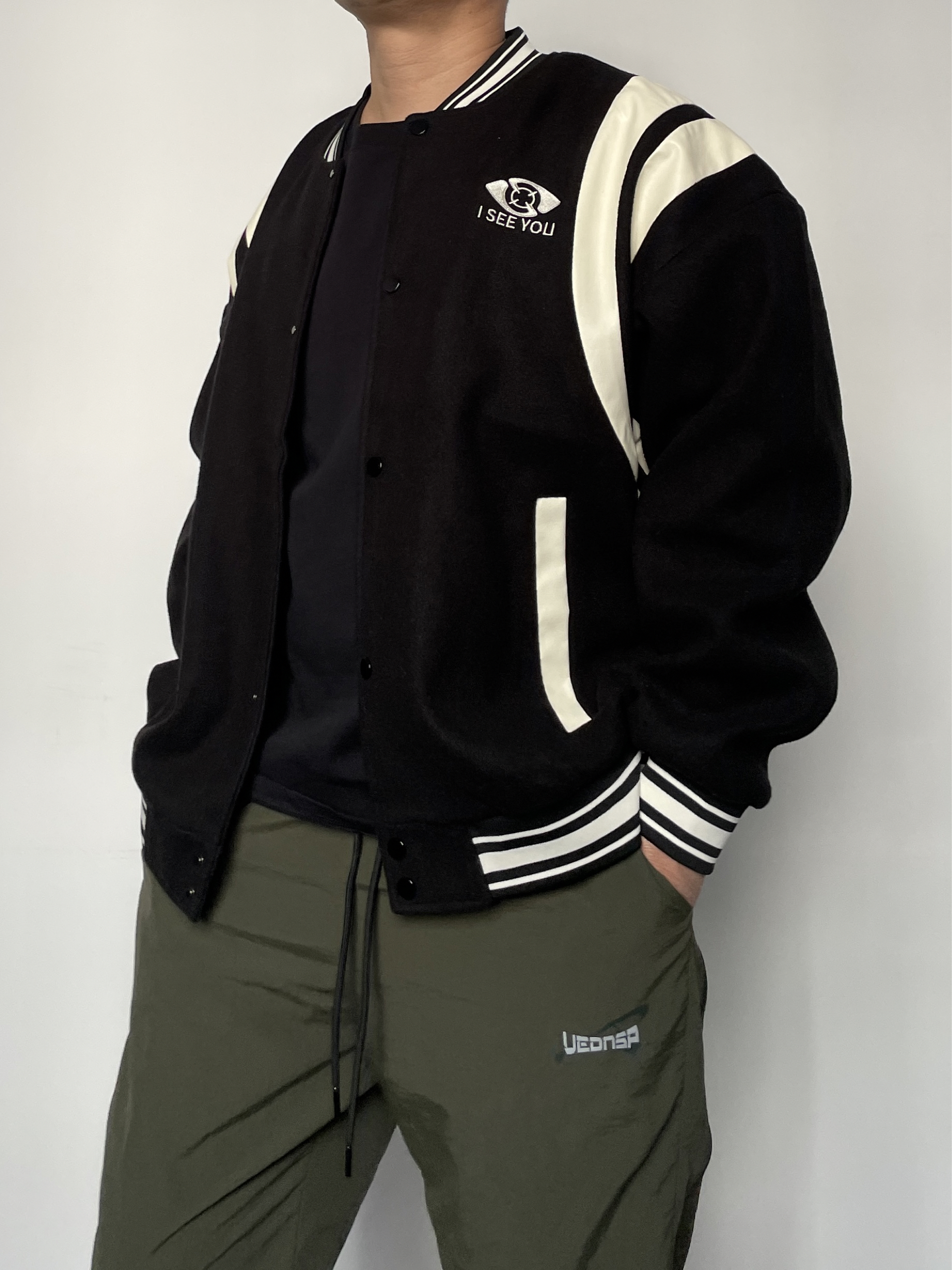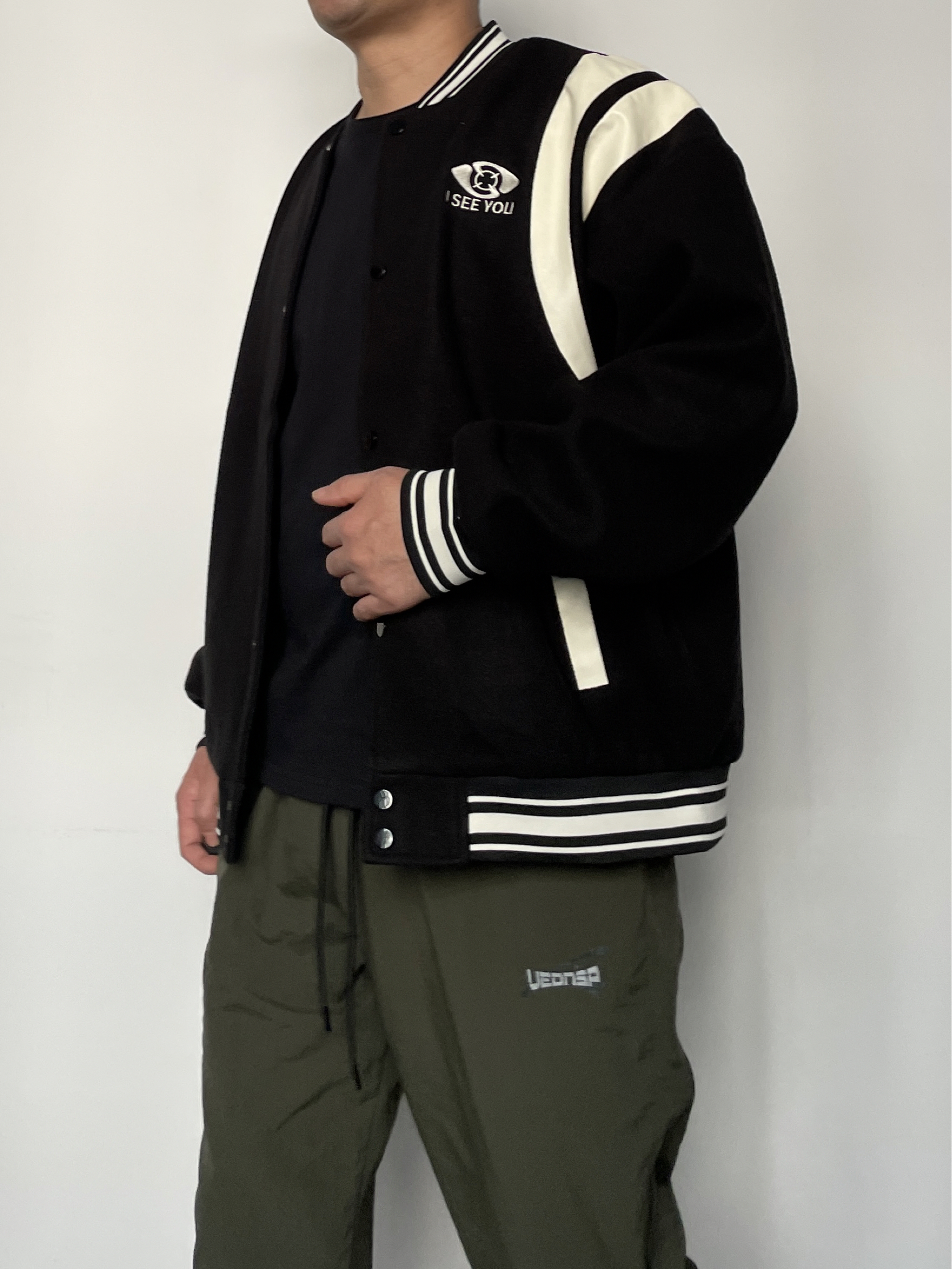 ❤️hi 宝子们好!🤝今日分享: 秋冬美式复古风必须拿捏独特的帅! 今天上身一件拼色棒球服外套 黑+米白撞色设计超有复古感,胸口“ I SEE YOU”标识细节拉满! 内搭经典黑色打底,简约不抢戏更衬外套质感~ 裤子搭配军绿色侧边拉链休闲裤 垂坠面料+做旧小标,慵懒中带点街头酷感!