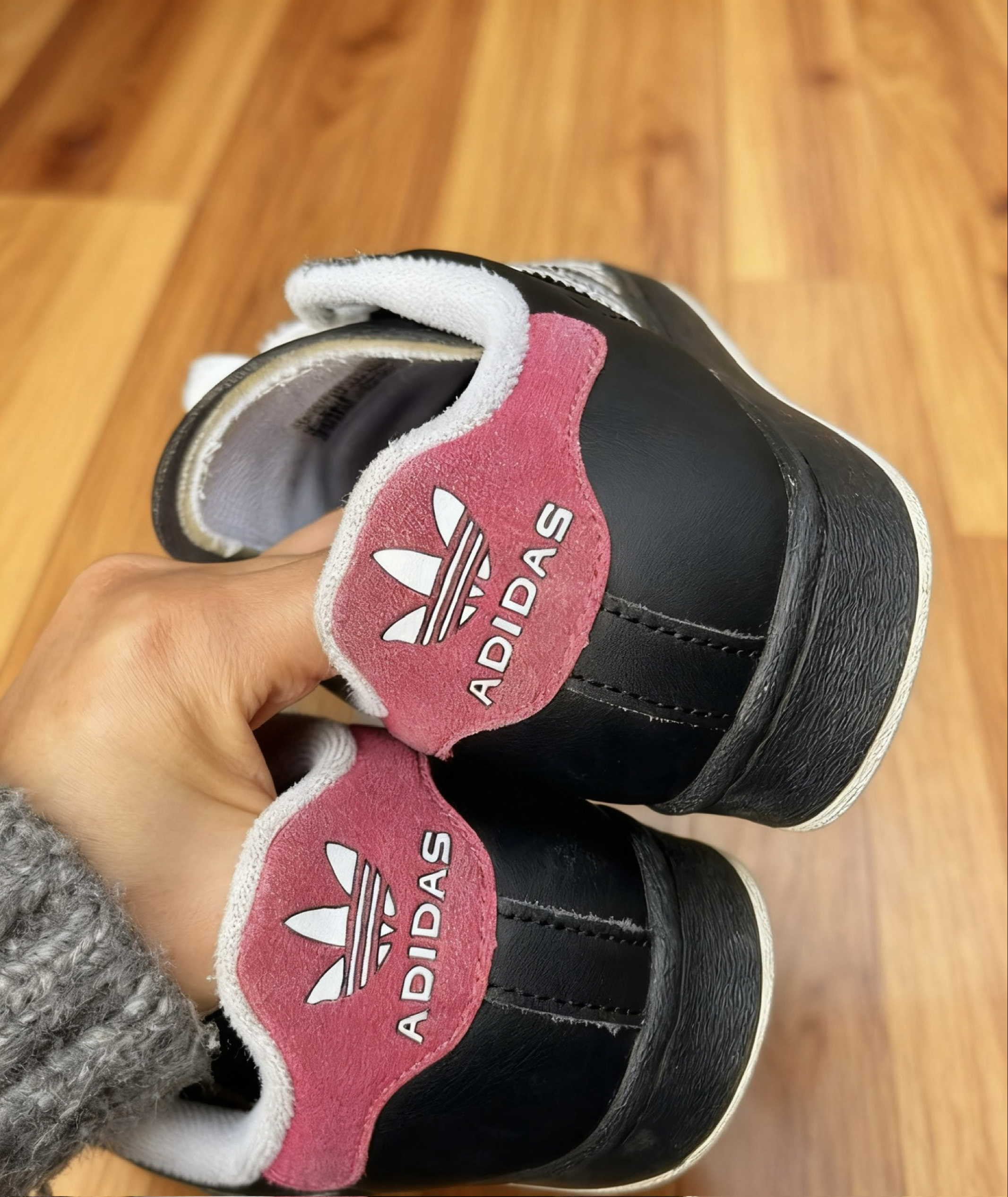 谁能拒绝这双又甜又酷的 adidas 贝壳头?经典贝壳头鞋型自带复古buff,黑色皮革质感拉满,鞋侧银条三道杠在光线下闪着潮酷光泽,后跟粉色细节又注入甜妹灵魂,甜酷碰撞的风格适配各种穿搭!不管是搭配辣妹短裙走甜酷风,还是和工装裤组复古潮搭,它都能稳稳hold住。脚感舒适还巨百搭,复古玩家和潮流达人都该冲的一双,穿上你就是街头吸睛王~