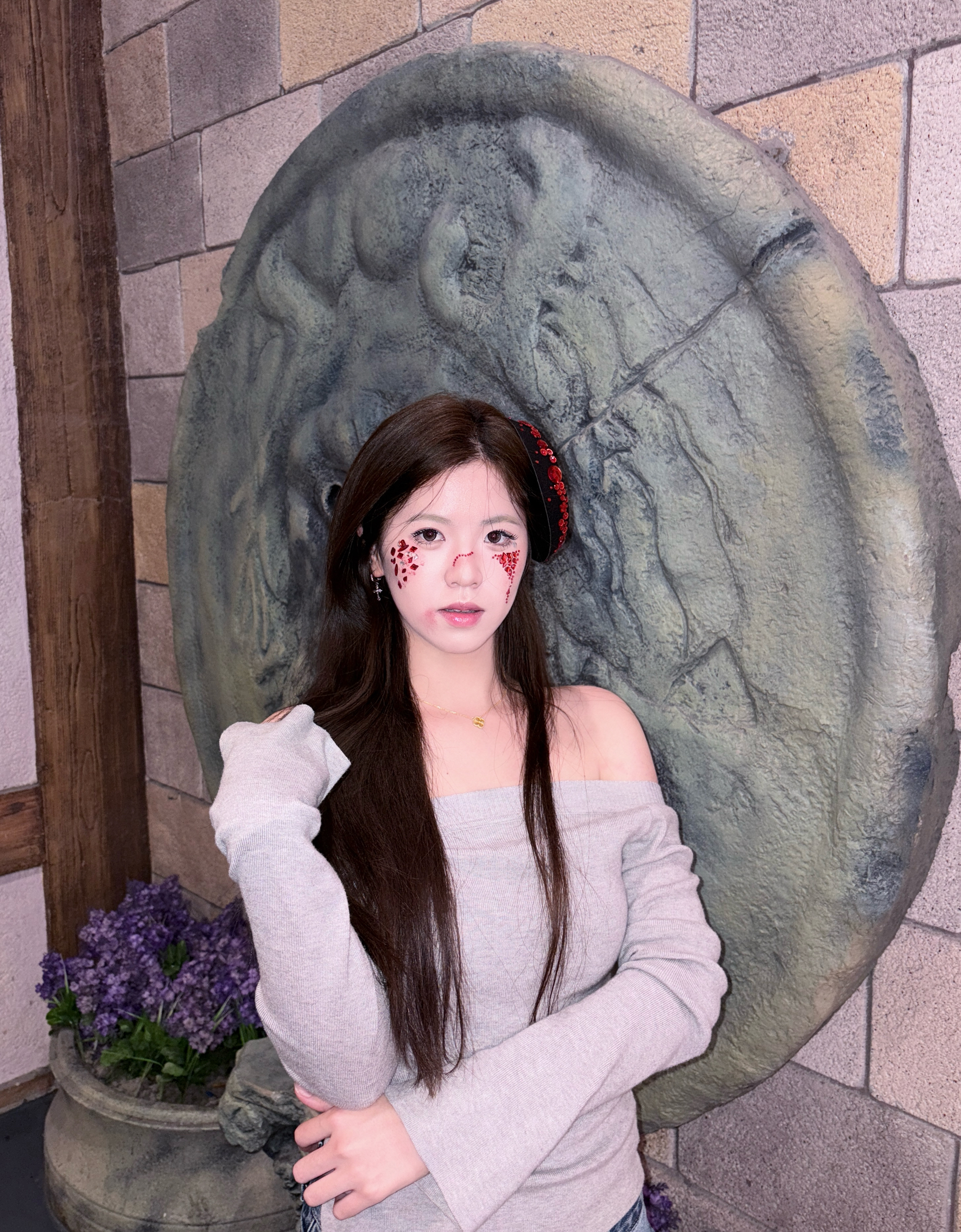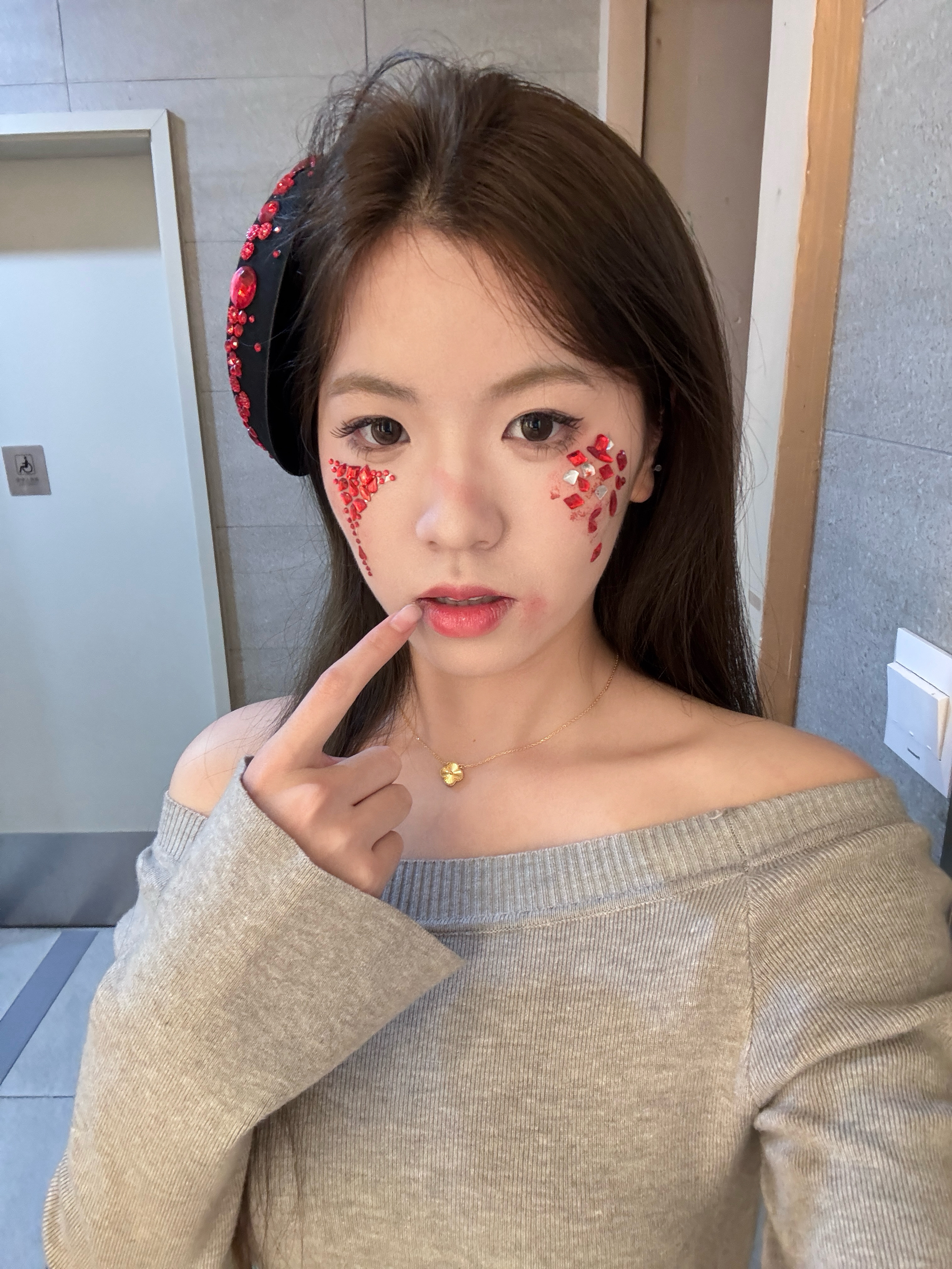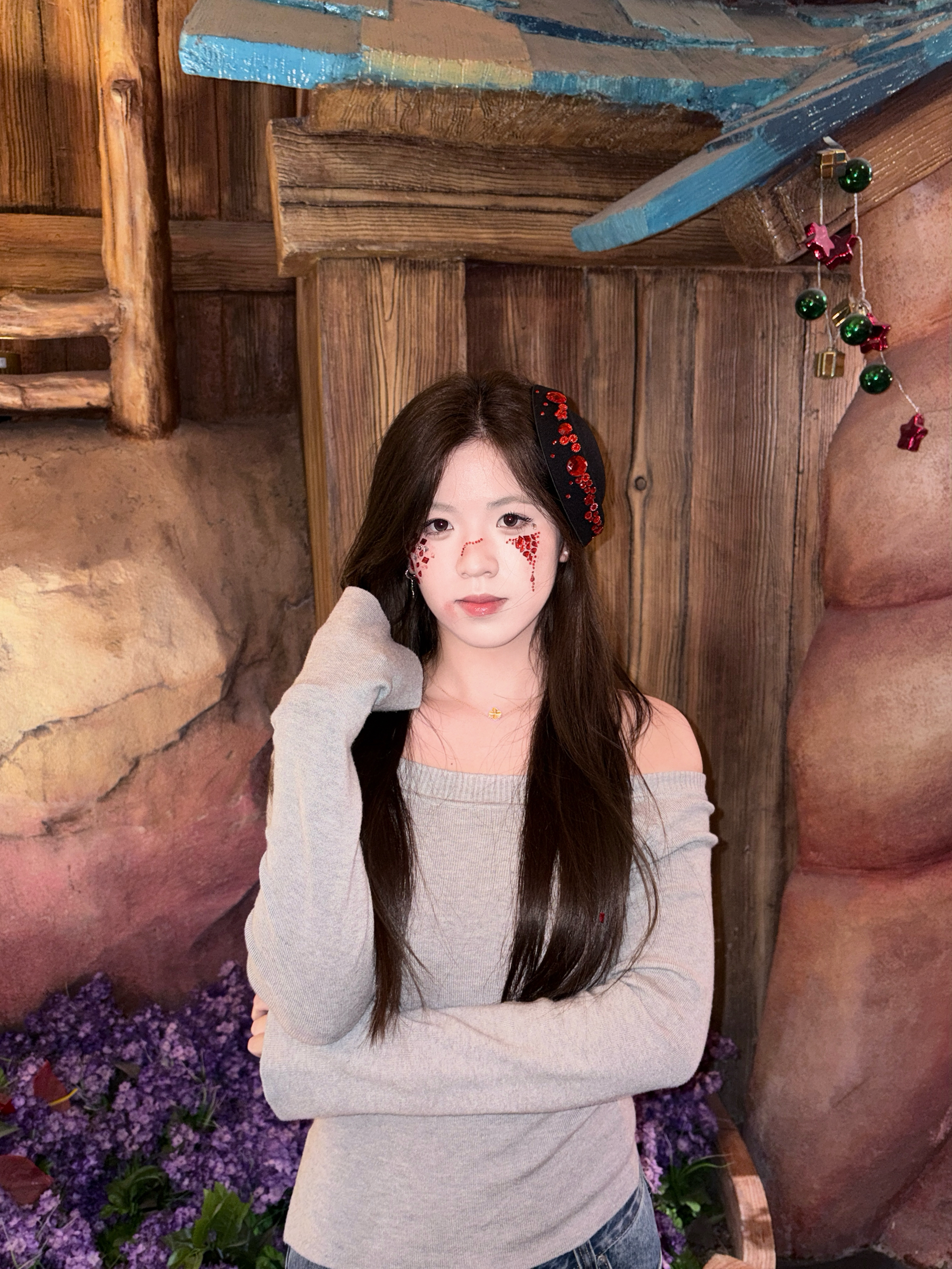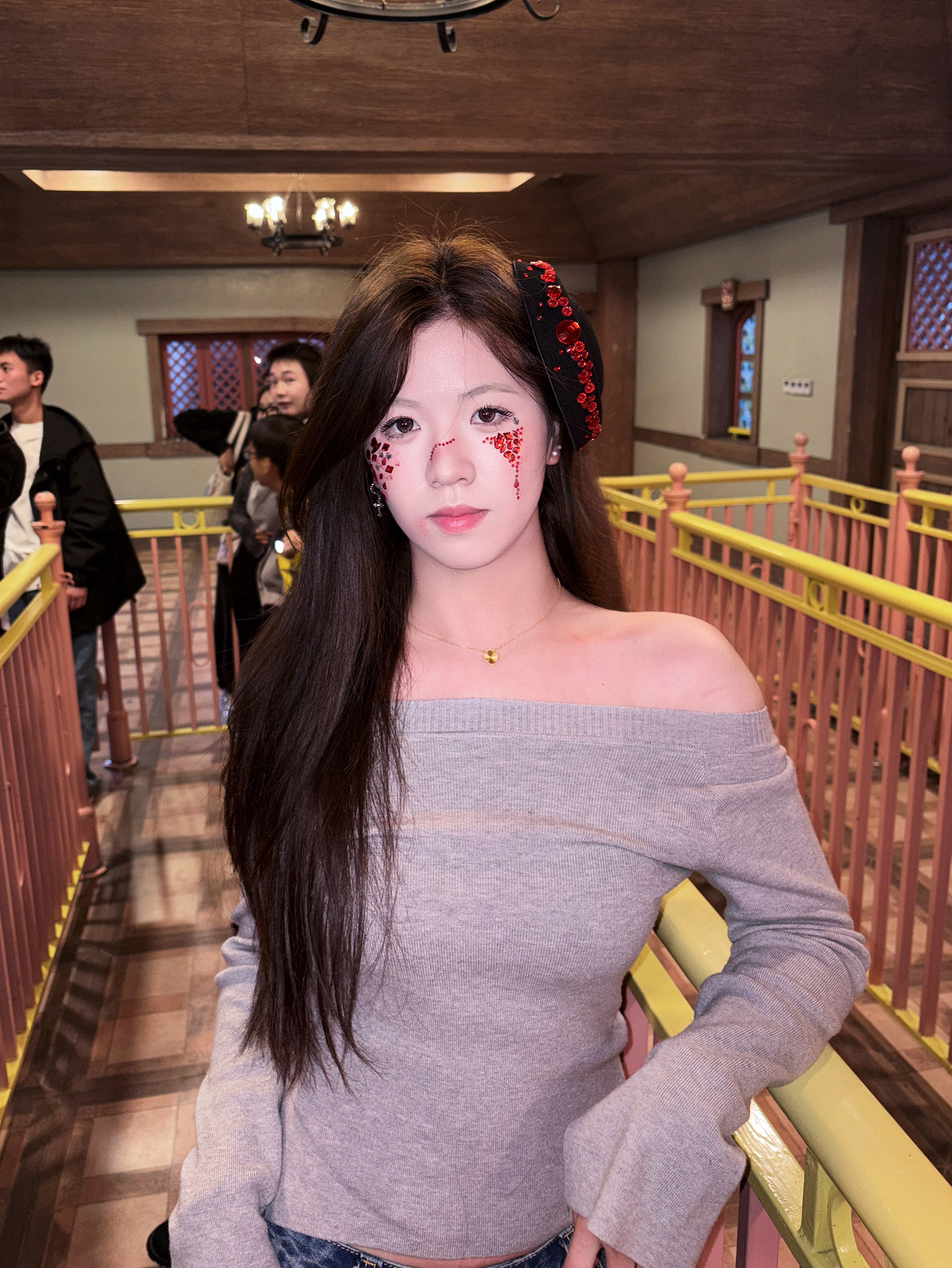 眼角又红色钻石做点缀十分灵动 浅灰针织露肩上衣显瘦又灵动 配水洗牛仔裤,温柔松弛感拉满,搭配万圣节妆容,甜酷氛围感直接拿捏。 你们对万圣节妆容的灵感来源于哪里呢?来评论区交流 #我的万圣节战 #万圣节穿搭 #分享今日份宝藏化妆分享 #氛围感穿搭 #万圣节ootd
