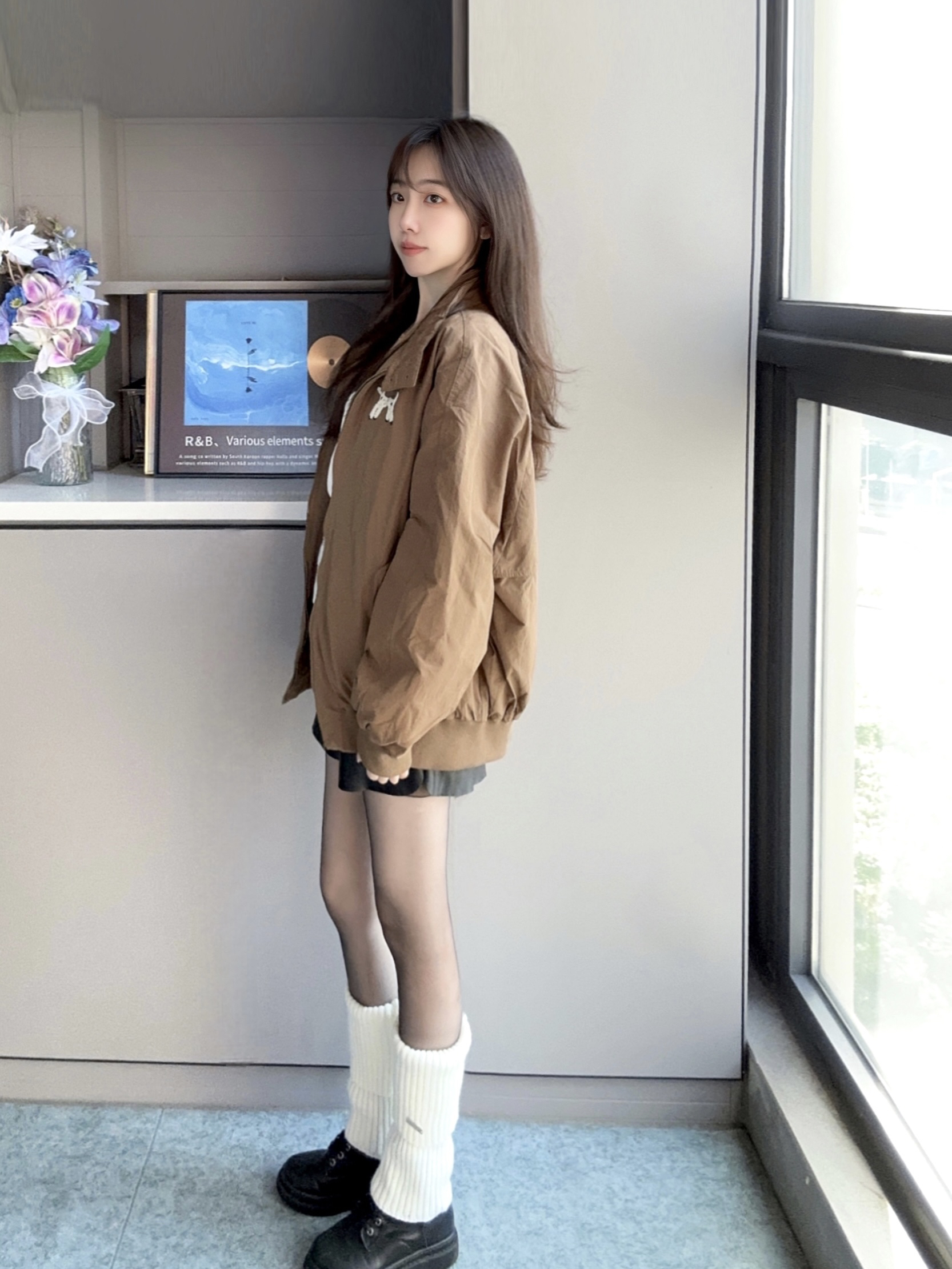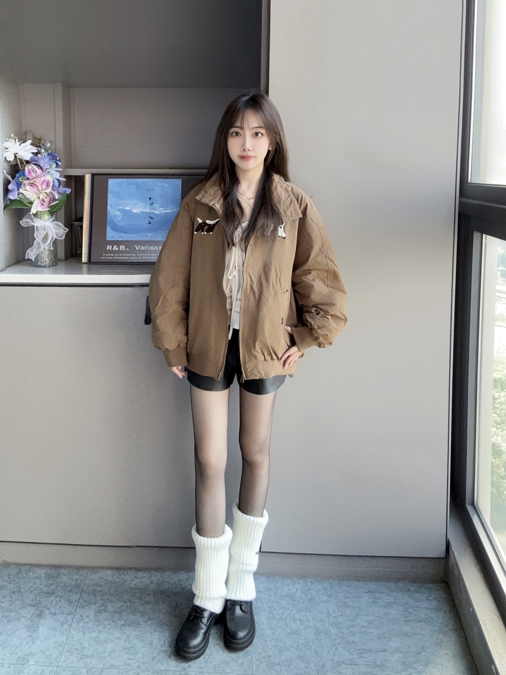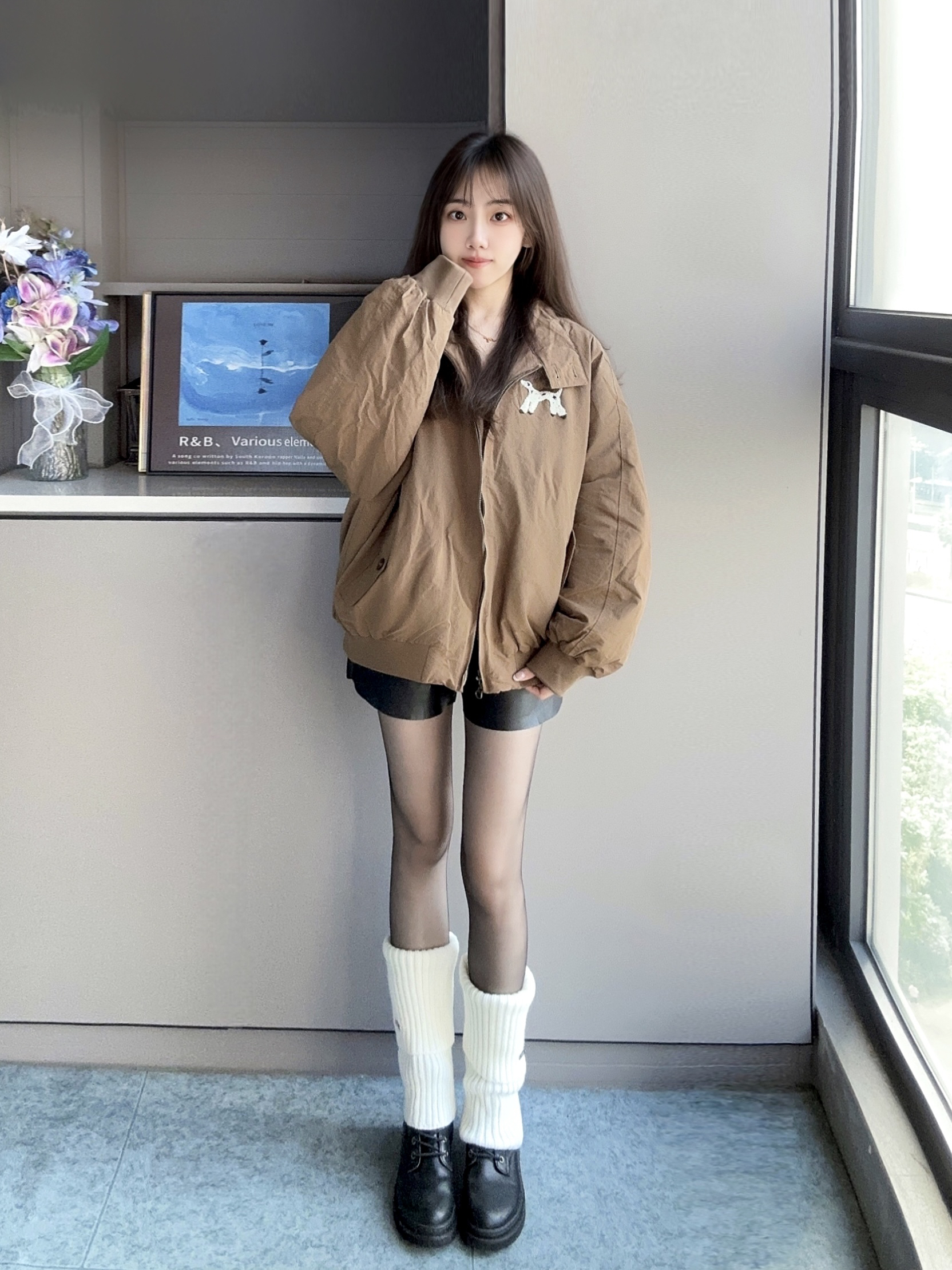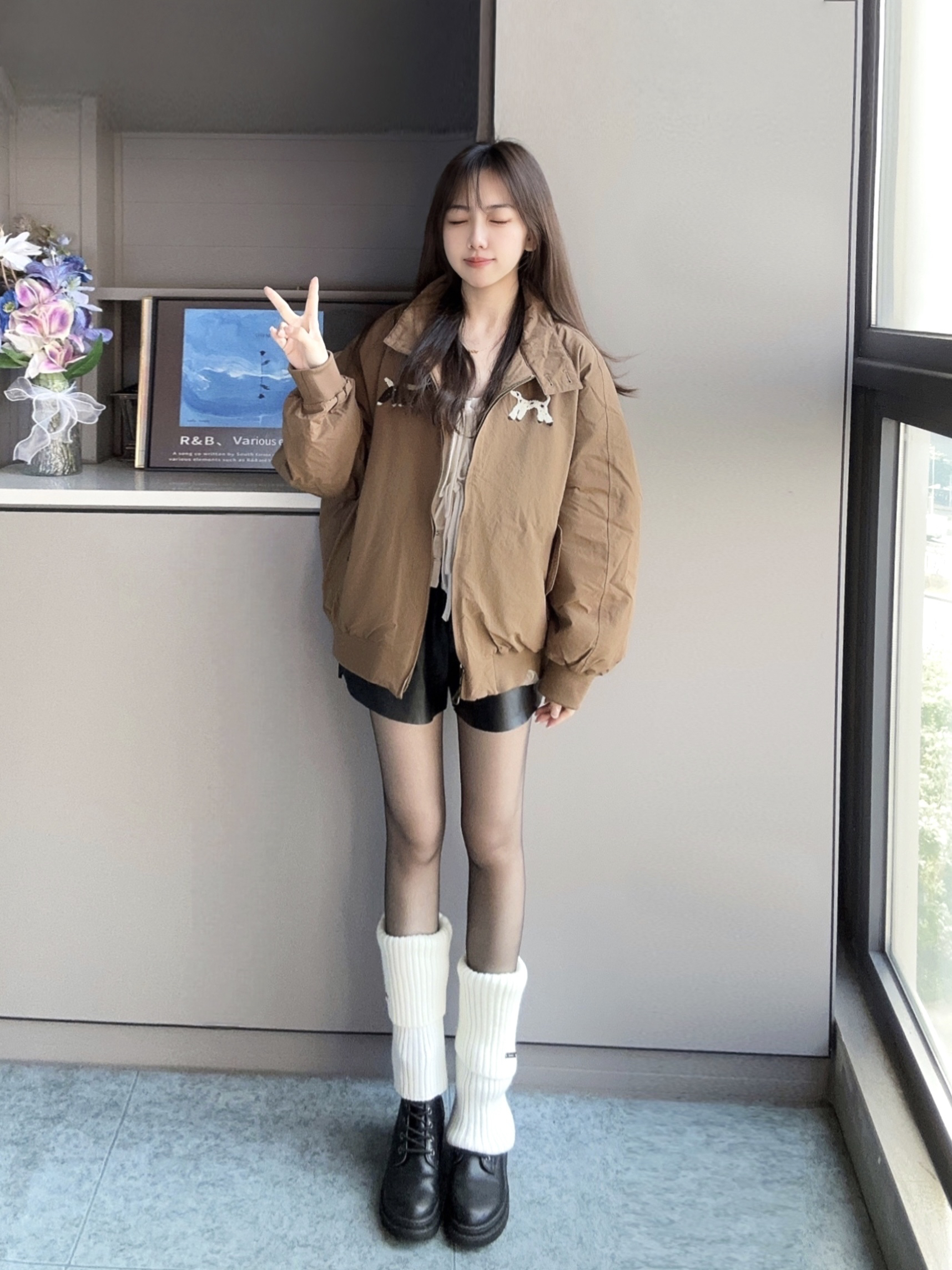 冬天的棕色外套就这样搭 很温暖又时髦的感觉~ 咖色立领夹克短羽绒服 搭配皮短裤和靴子,很甜酷又保暖