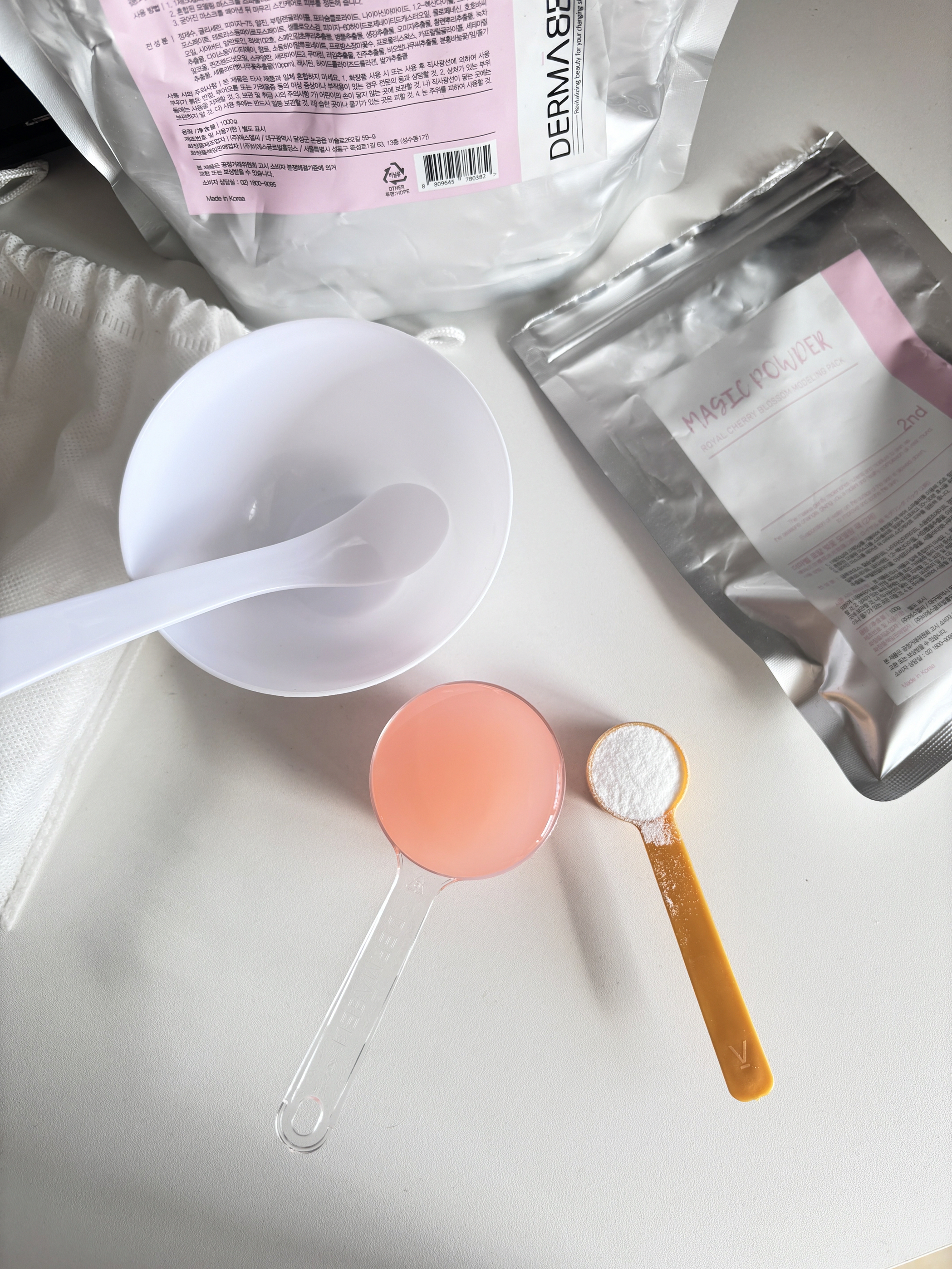 #德玛贝尔面膜 我用过红色玫瑰和粉色樱花的软膜,一个是 提亮去黄,一个是补水保湿,我个人用下来更喜欢粉色樱花的,补水效果不错用完后皮肤软软滑滑,第二天皮肤就像水光肌一样有光泽, 使用方法:根据自带的勺子来用量, 一勺粉,一勺膜,然后放在碗里搅拌就可以了,千万不要搅拌完后放置一会,在上脸,不然凝固了就涂抹不了了😭 (之前在学校想要躺床上敷,就先把搅拌好的放在床上,可能开空调的原因吧,等我拍完水上床...