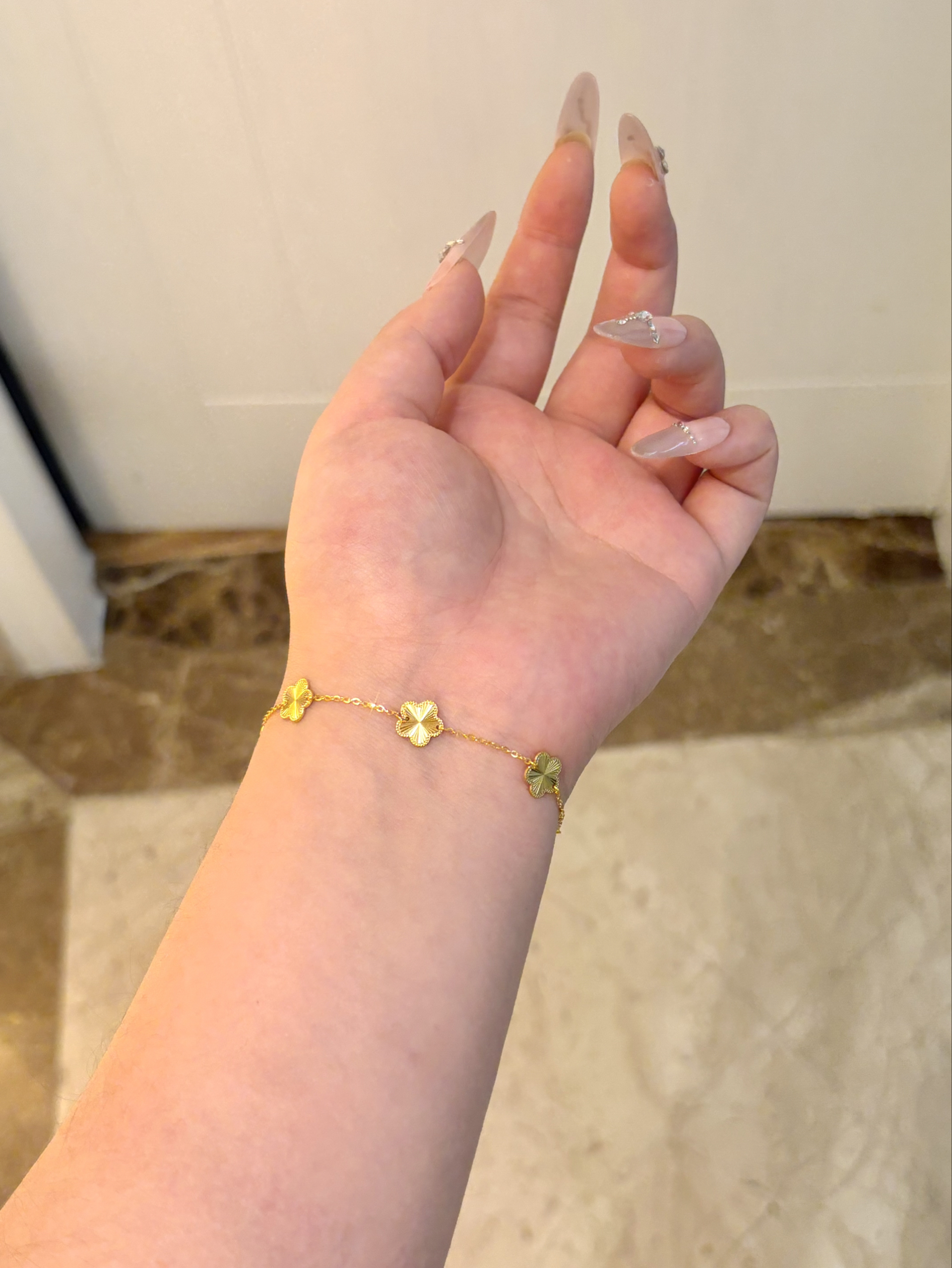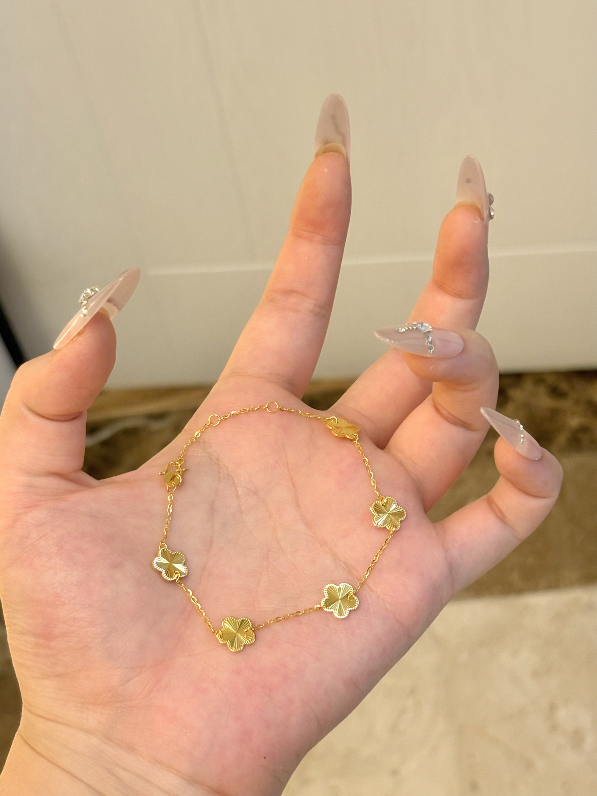 这个世界什么都是假的 只有我的五花黄金手链才是真的 收到这个礼盒真的开心的不行!一整个都金灿灿嘟 每个小花都特别精致!戴在手上贵气感满满 质感和光泽感看起来很不错
