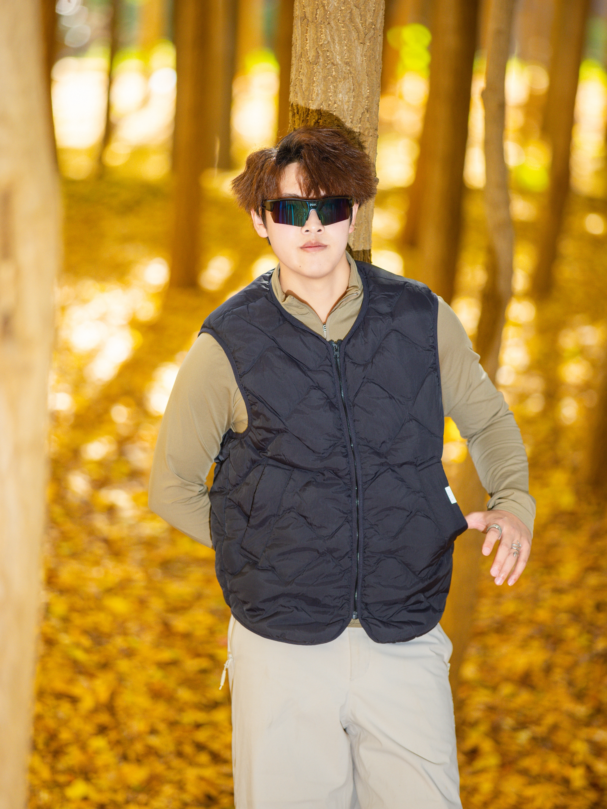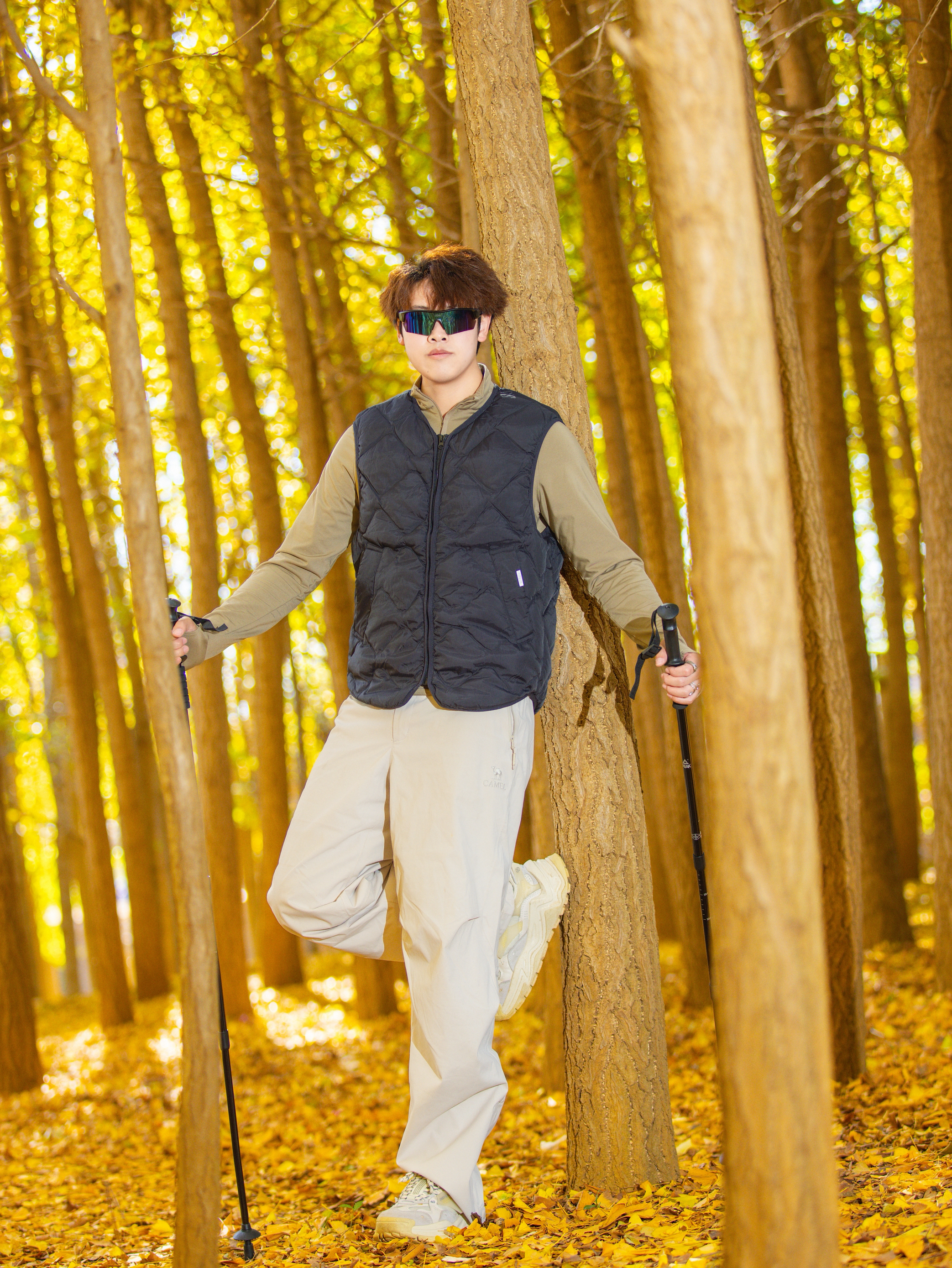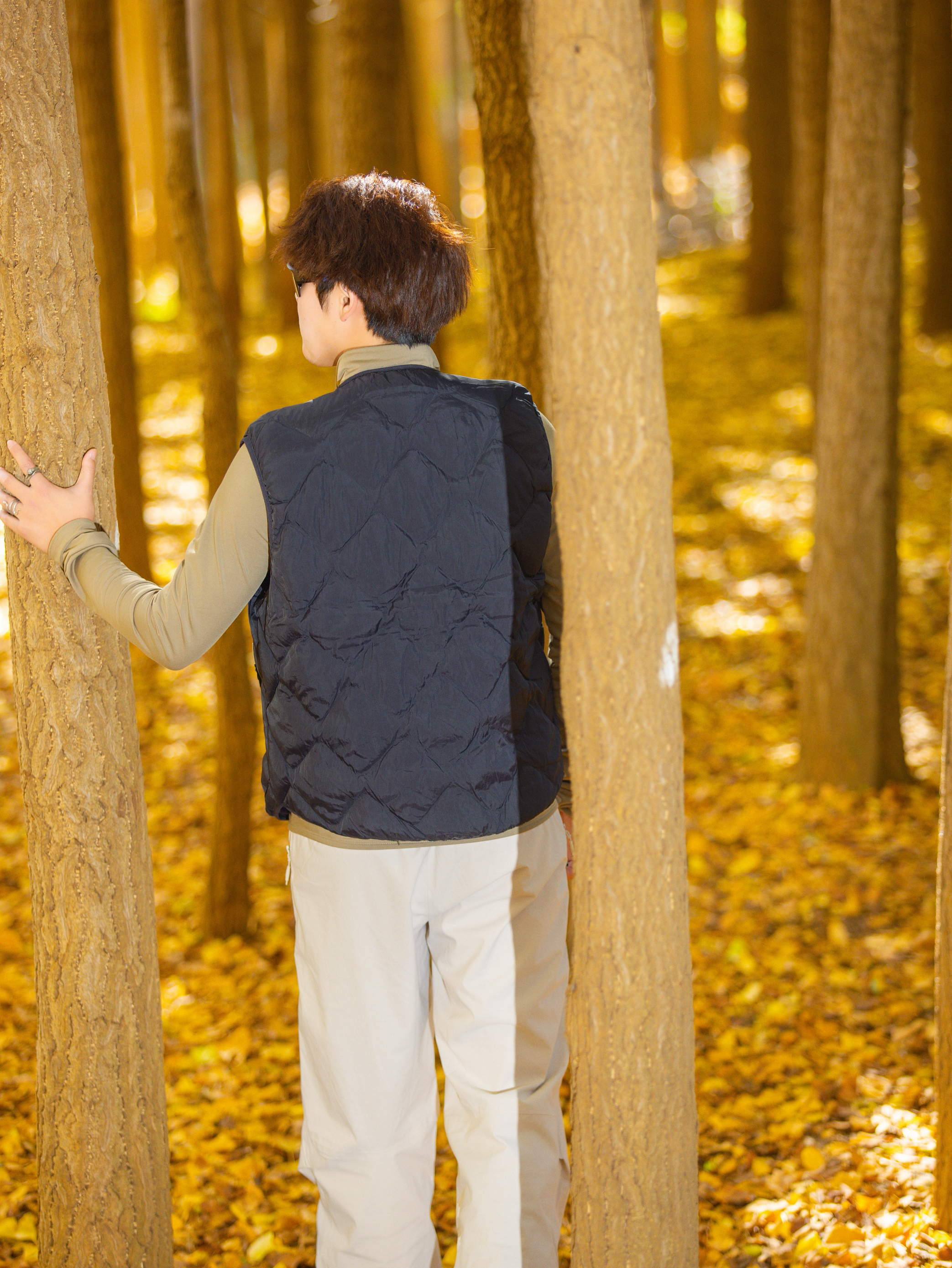 谁懂啊,昆明秋天的银杏林真的是自带柔光滤镜✨ 🔹今日穿搭公式:藏青菱格羽绒马甲+卡其长袖+浅卡其阔腿工装裤 • 马甲是轻量款!叠穿内搭完全不臃肿,早晚出门套上巨挡风,藏青色还耐脏(户外党狂喜) • 卡其长袖贴身不闷,和马甲撞色温柔又有层次,秋老虎天单穿也舒服 • 浅卡其工装裤版型封神!阔腿+垂感,踩满落叶的地面都能穿出长腿,面料抗皱坐地上摆拍都不心疼😎 道具小心机:带根登山杖!...
