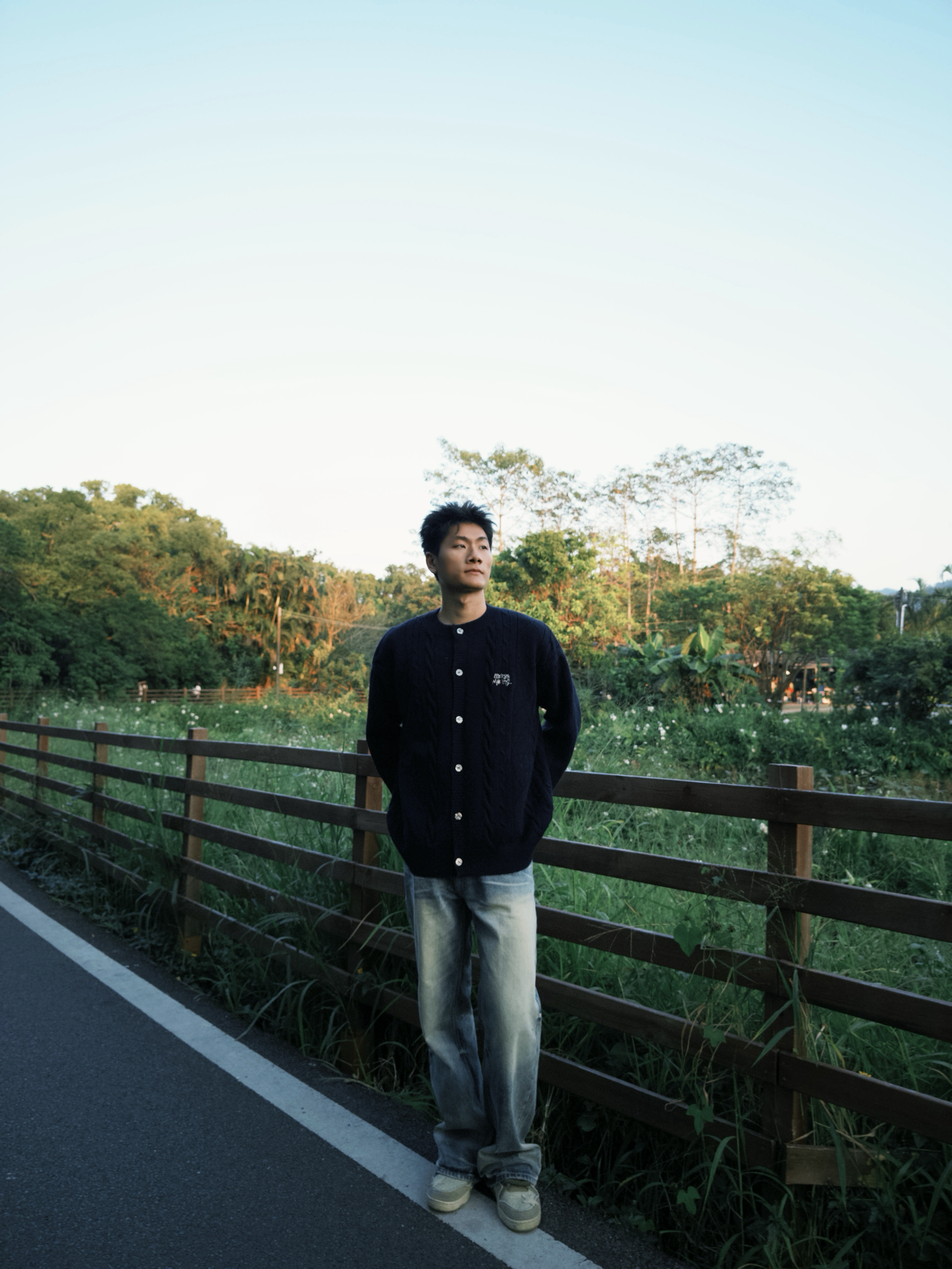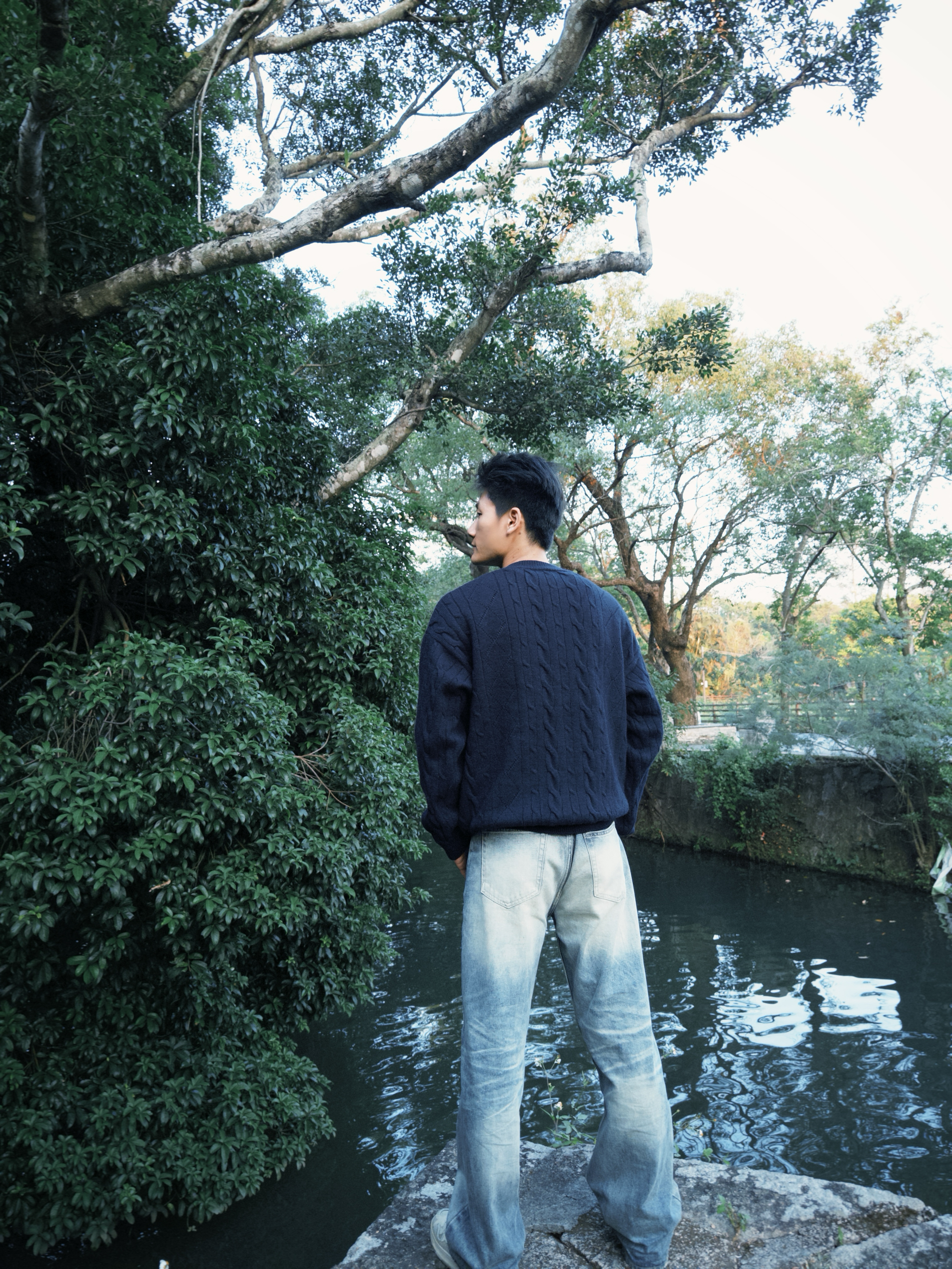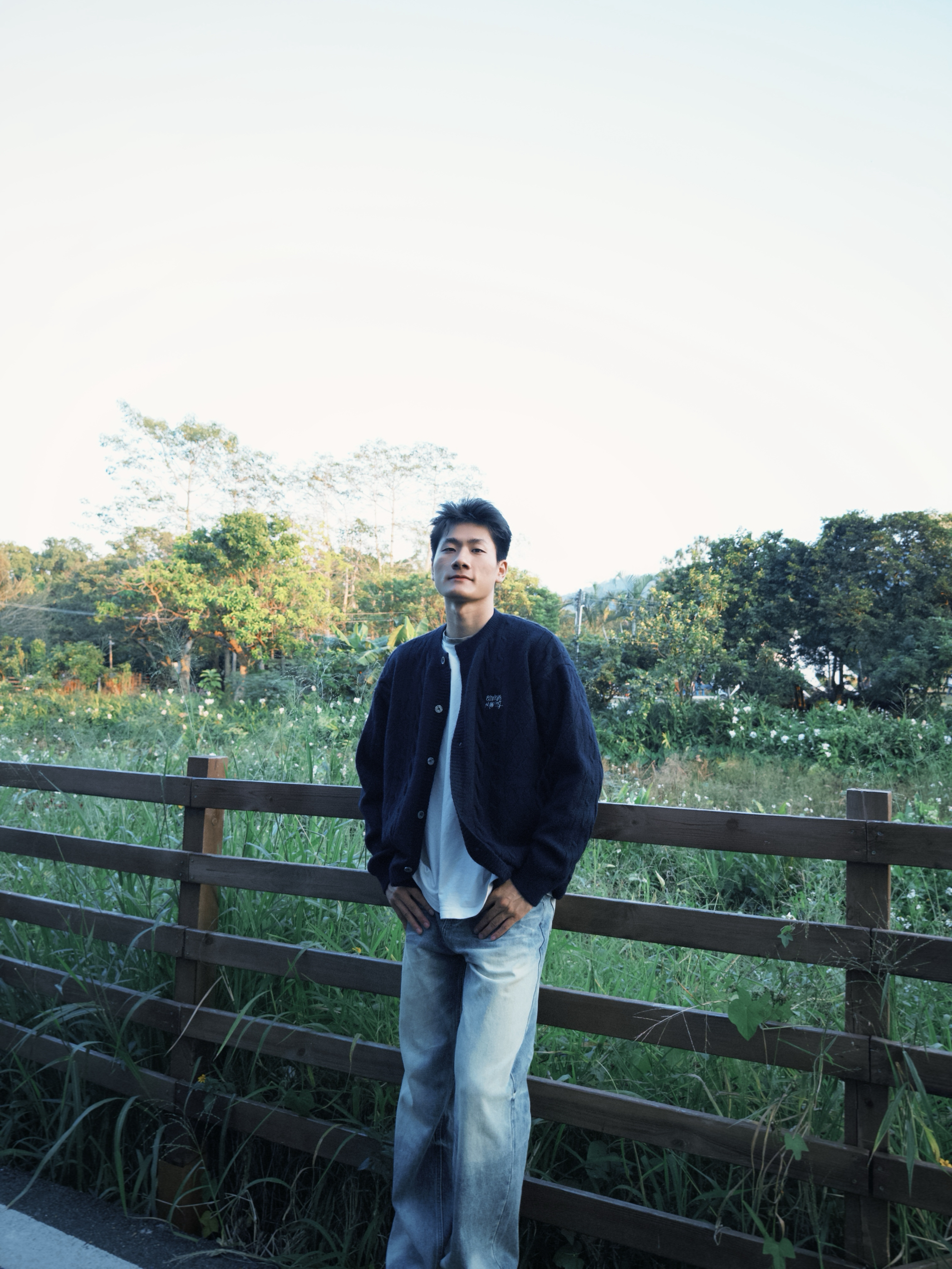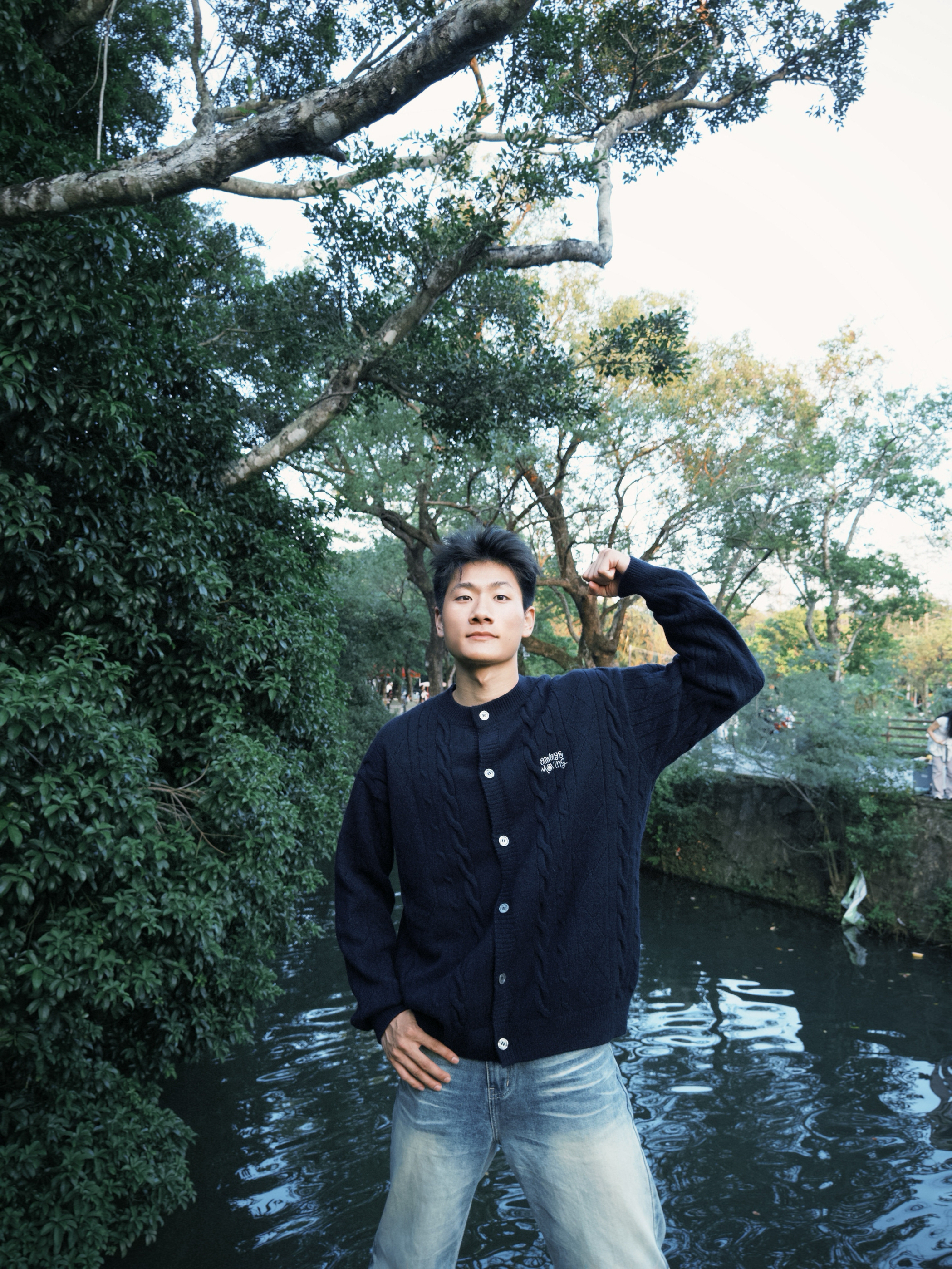 “这藏青针织开衫是我最近的‘出门刚需’——绞花纹理摸着软乎乎的,河边吹风时裹着刚好挡风,单排扣开襟穿脱方便,配浅蓝牛仔裤往自然景里一站,松弛感直接拉满。现在这温度穿不闷汗,抬手、活动都不卡身,属于‘舒服又自带复古调’的款。”