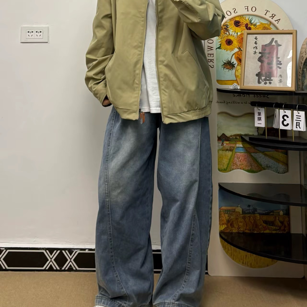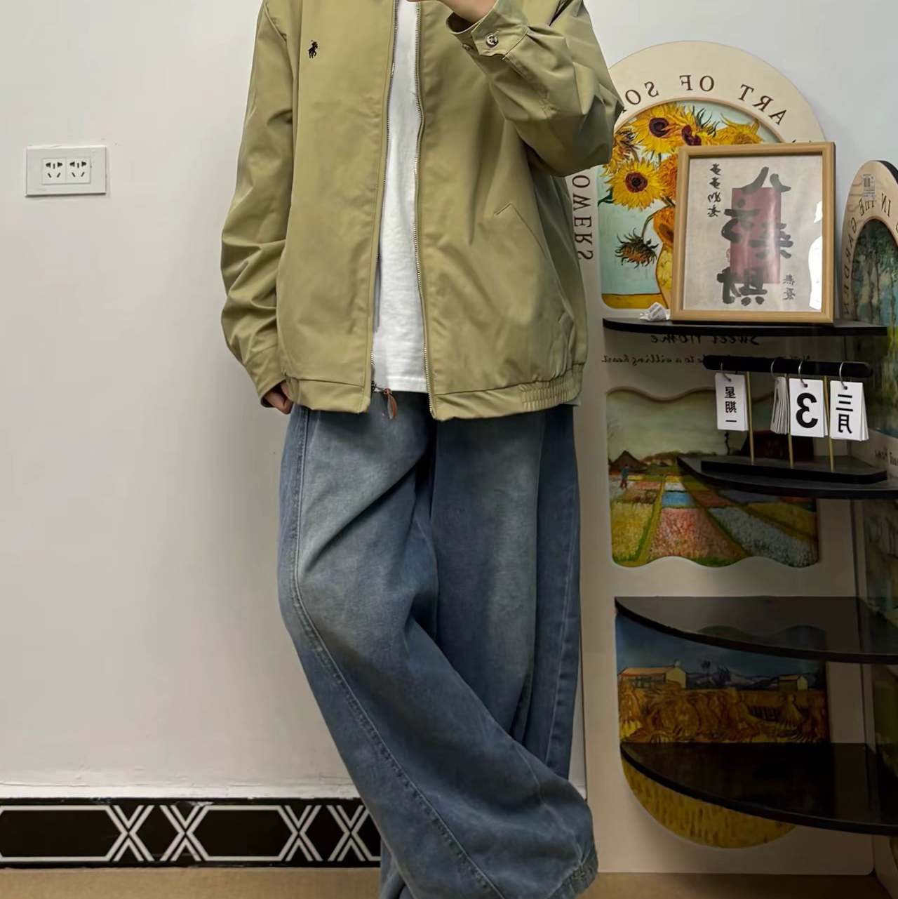 今日ootd 上身卡其色拉夫夹克 裤子选择复古牛仔裤 搭配一双Nike板鞋 一套搭配还蛮有秋季氛围感的
