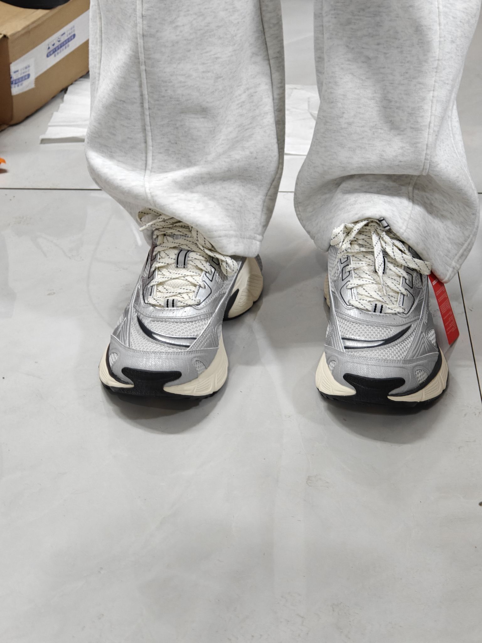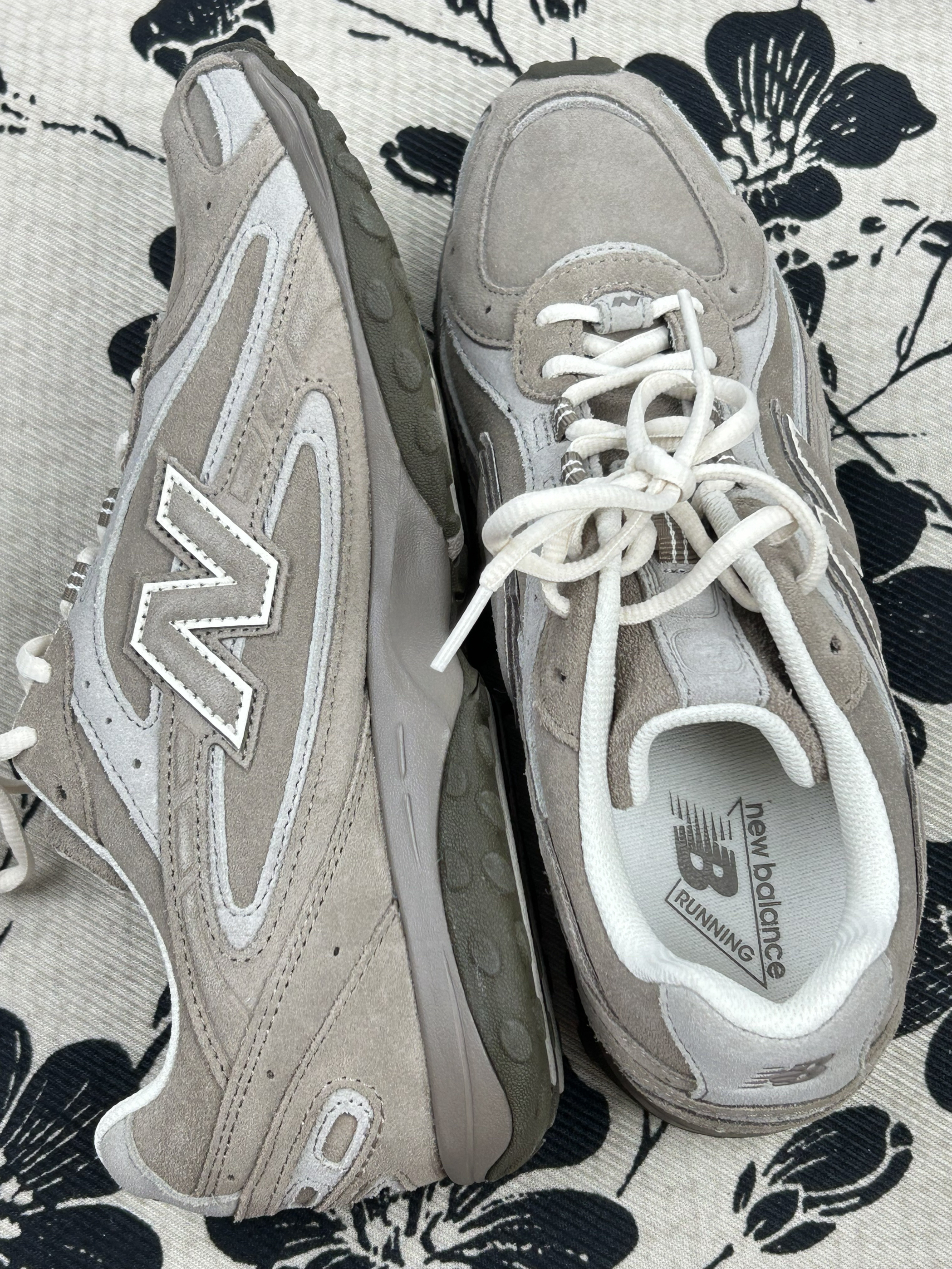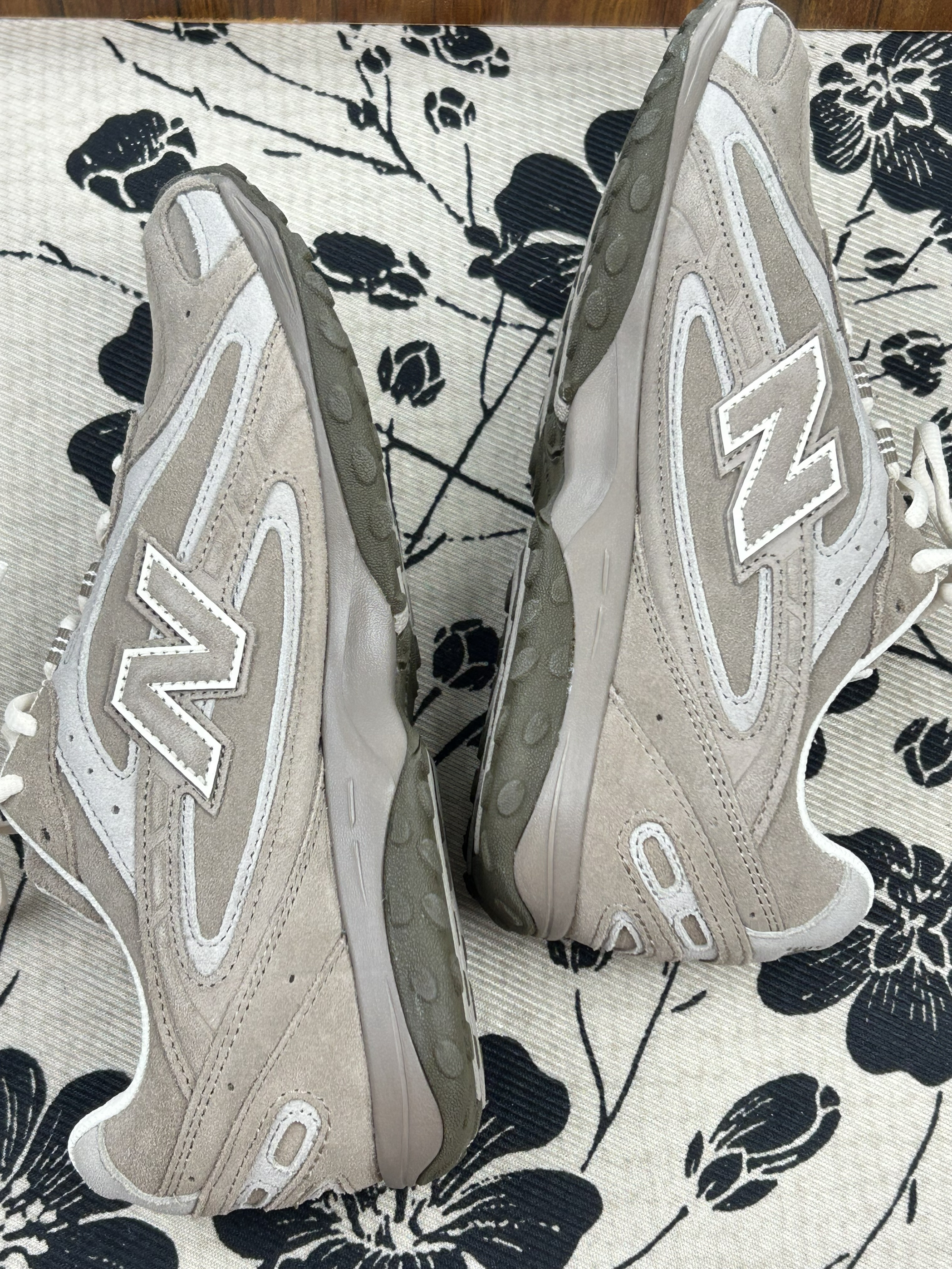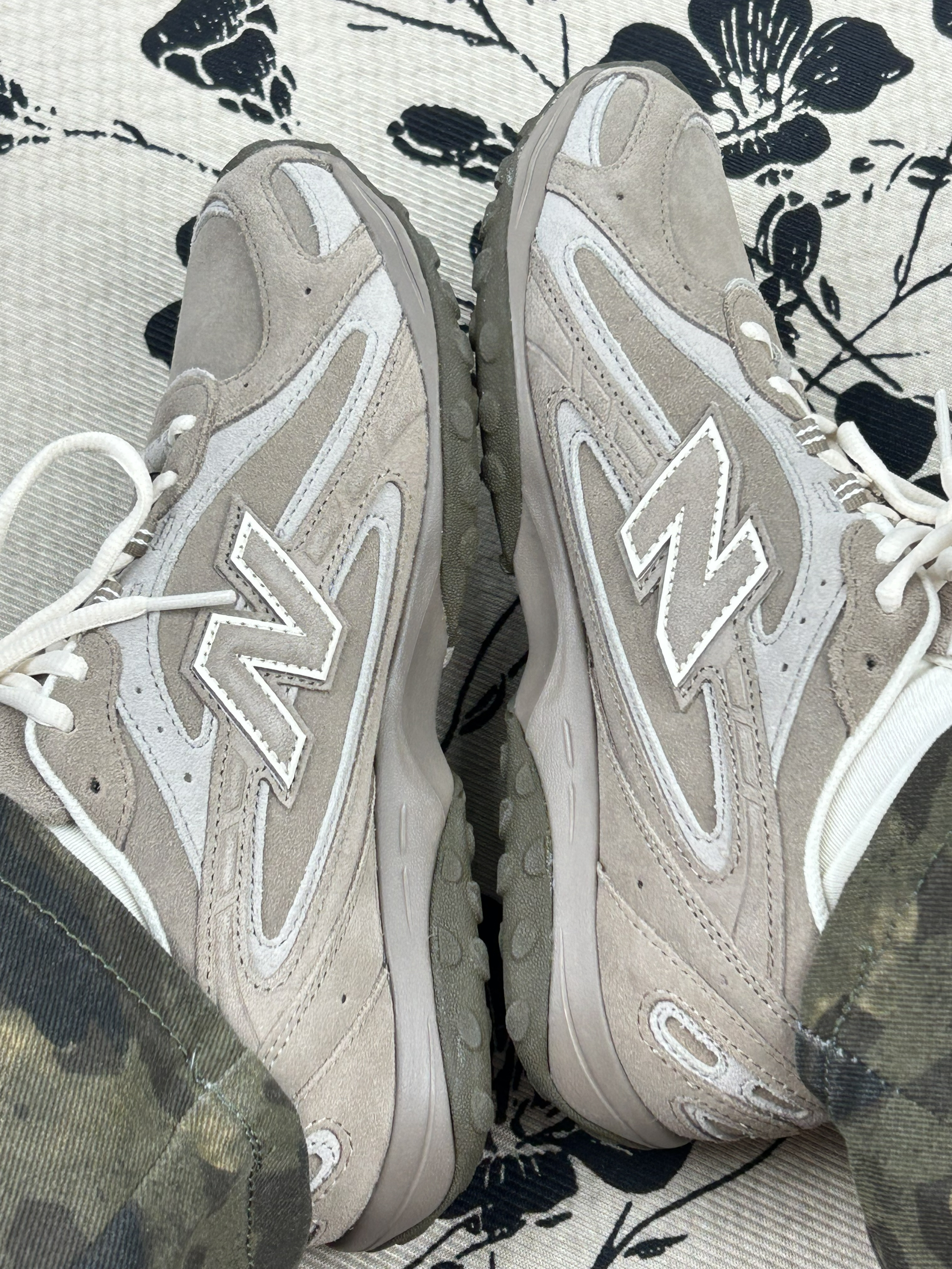 浅卡其+米白的拼色温柔到骨子里,鞋型是那种恰到好处的“老爹感”但不显笨重。很好搭衣服,像弯刀裤阔腿裤,其他一些牛仔裤都不挑,配运动裤也是少年感十足 不过可能是鞋型偏窄,我正常脚型穿厚袜子会挤小脚趾。 麂皮面难打理,蹭到奶茶印子容易留印,现在鞋头已经有点灰蒙蒙的。不过鞋底抓地力比想象中好,下雨天踩湿砖路没打滑。 现在穿它的频率是“周末随便出门穿”,出门逛街也会被要几次链接