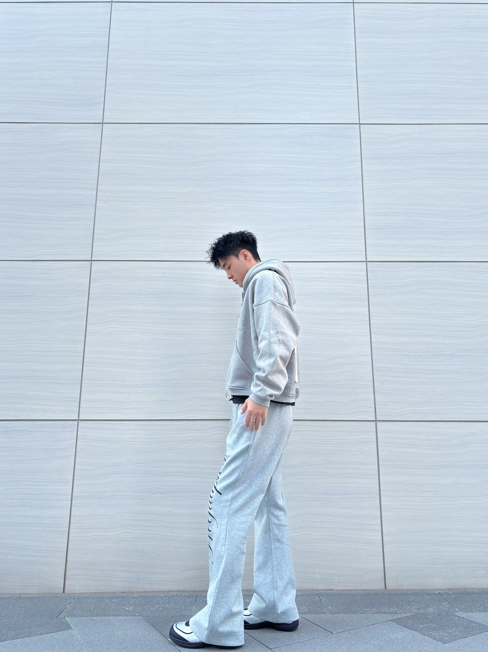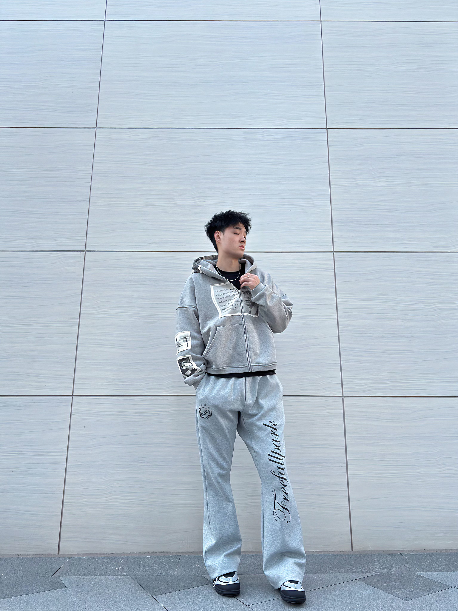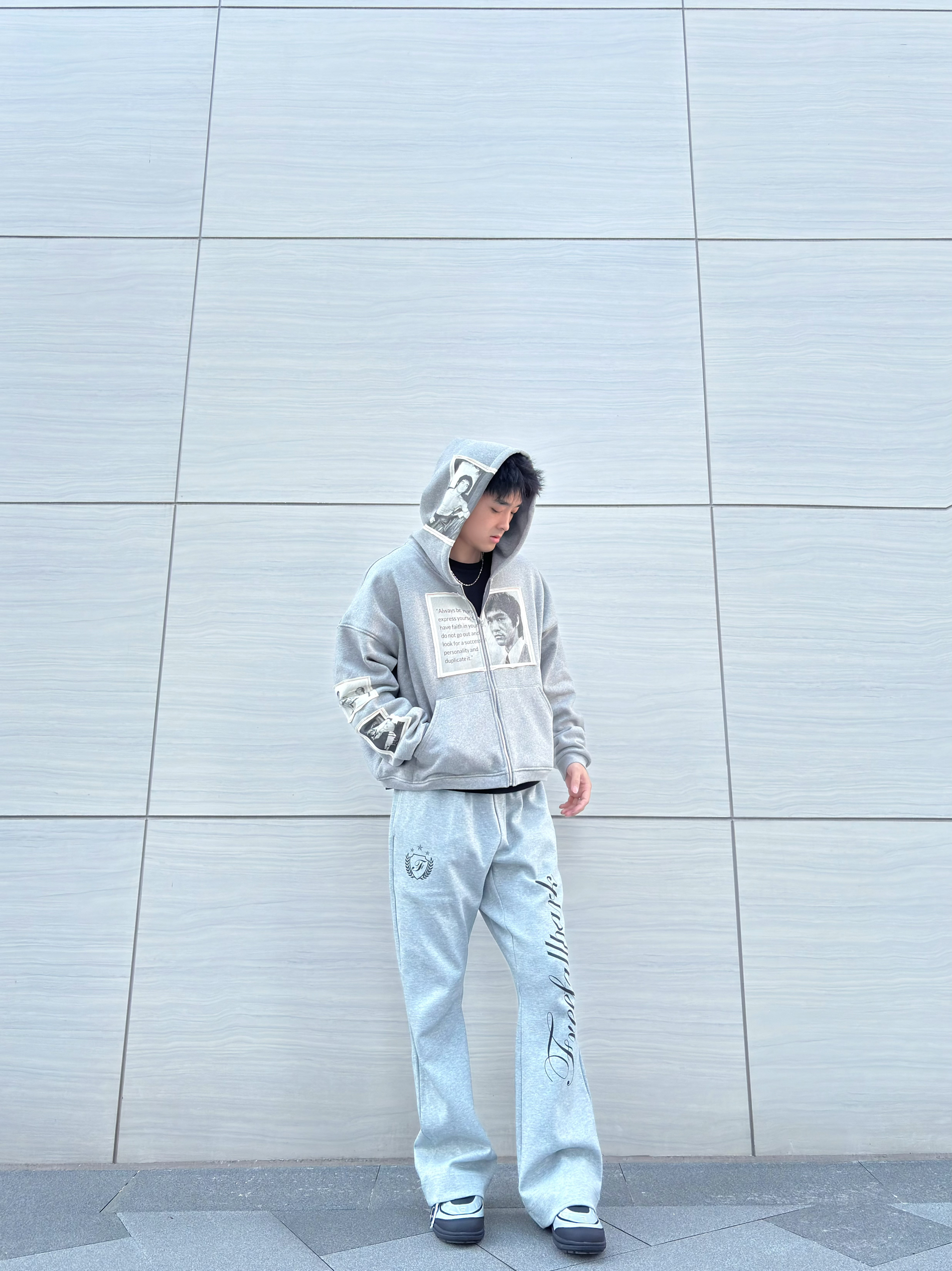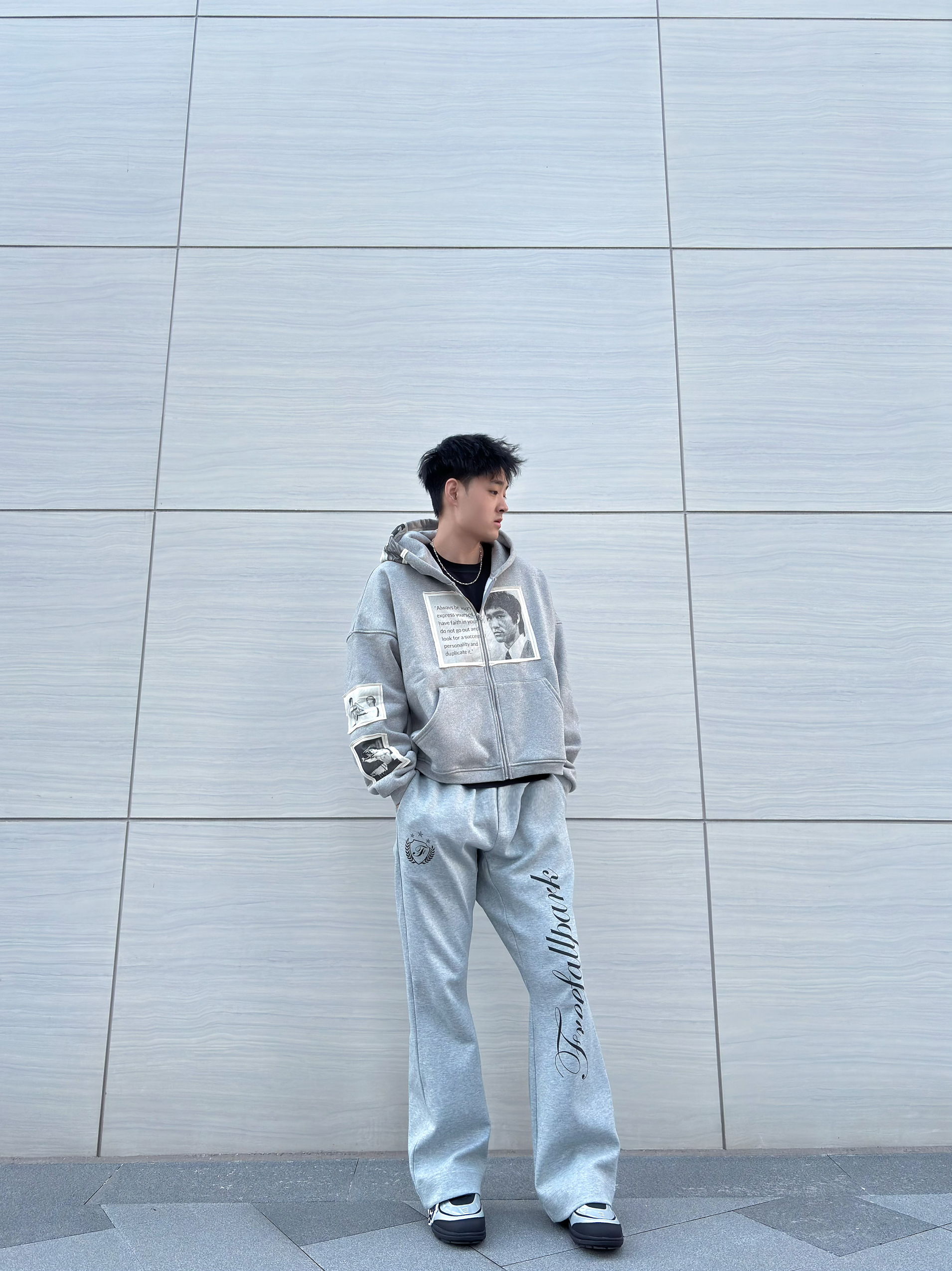 连帽卫衣上的李小龙印花和臂部贴布设计,宽松版型对各种身材都很友好! 搭配同色系阔腿卫裤,侧面的艺术字体印花让整体不再单调,垂坠感十足的裤型还特别显腿长~ 鞋子选了双银色与黑色撞色赛车鞋,增加了点复古运动感,整套穿搭日常出街或者和朋友约饭都很合适,舒适又有风格,潮男们可以直接冲!