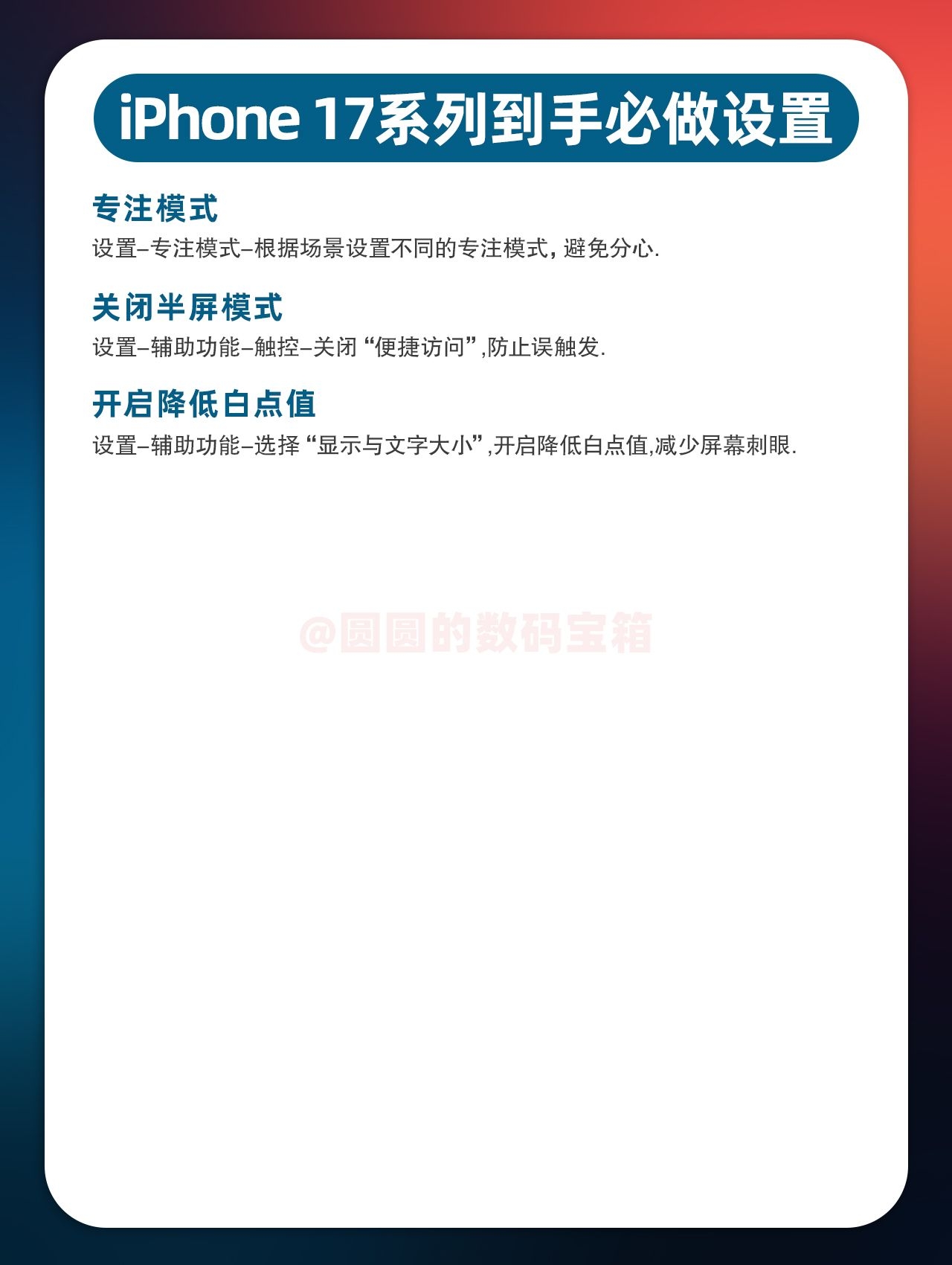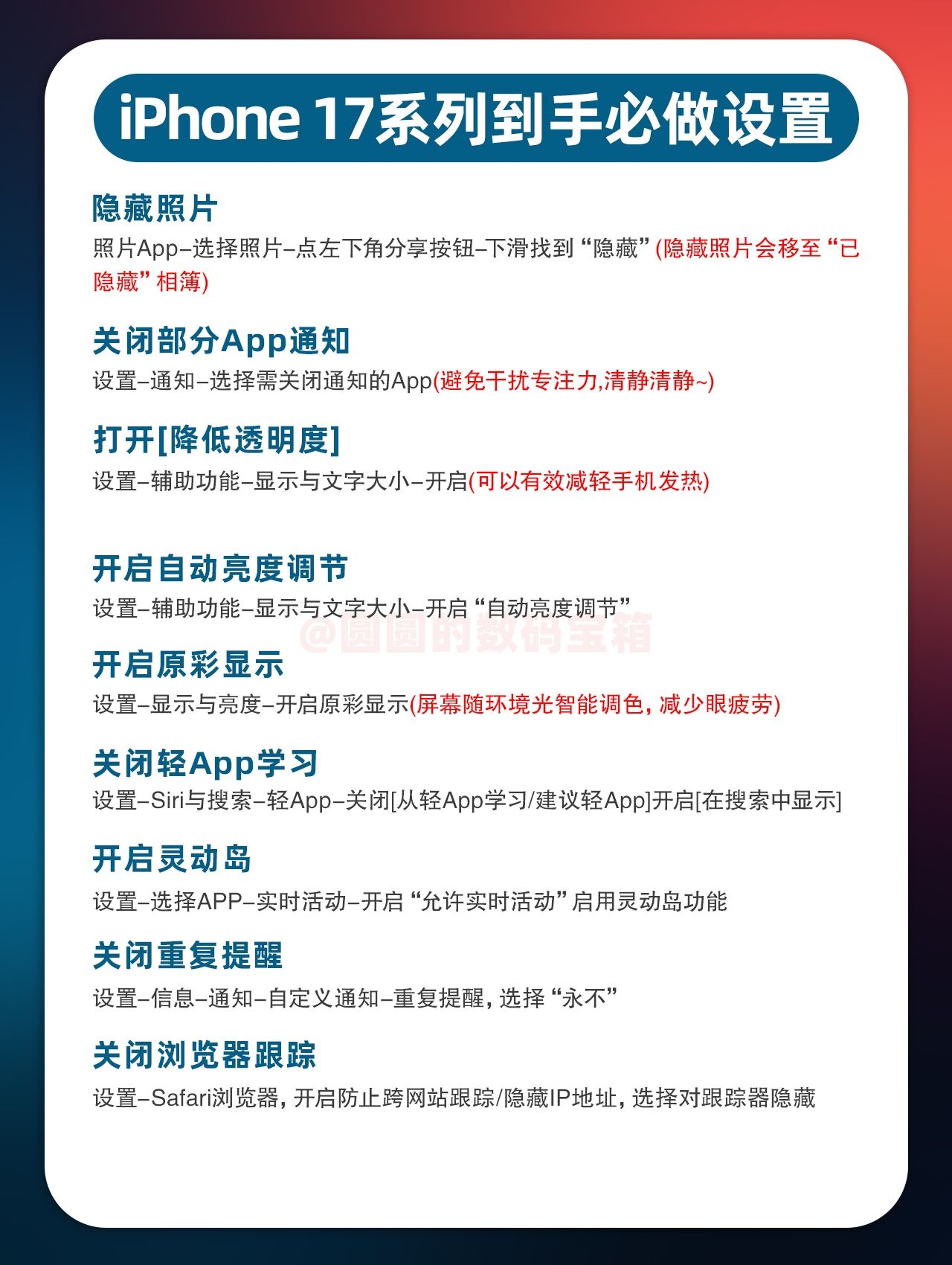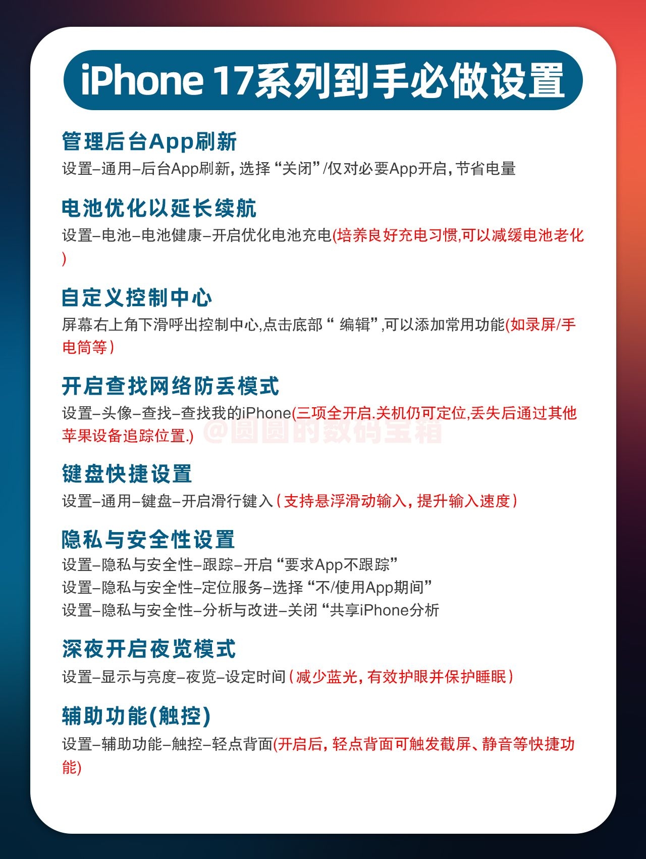 【🤤iPhone17到手必做设置】,由用户 圆圆的数码宝箱 分享,来自广东。这是一篇来自识货社区的真实用户分享笔记。