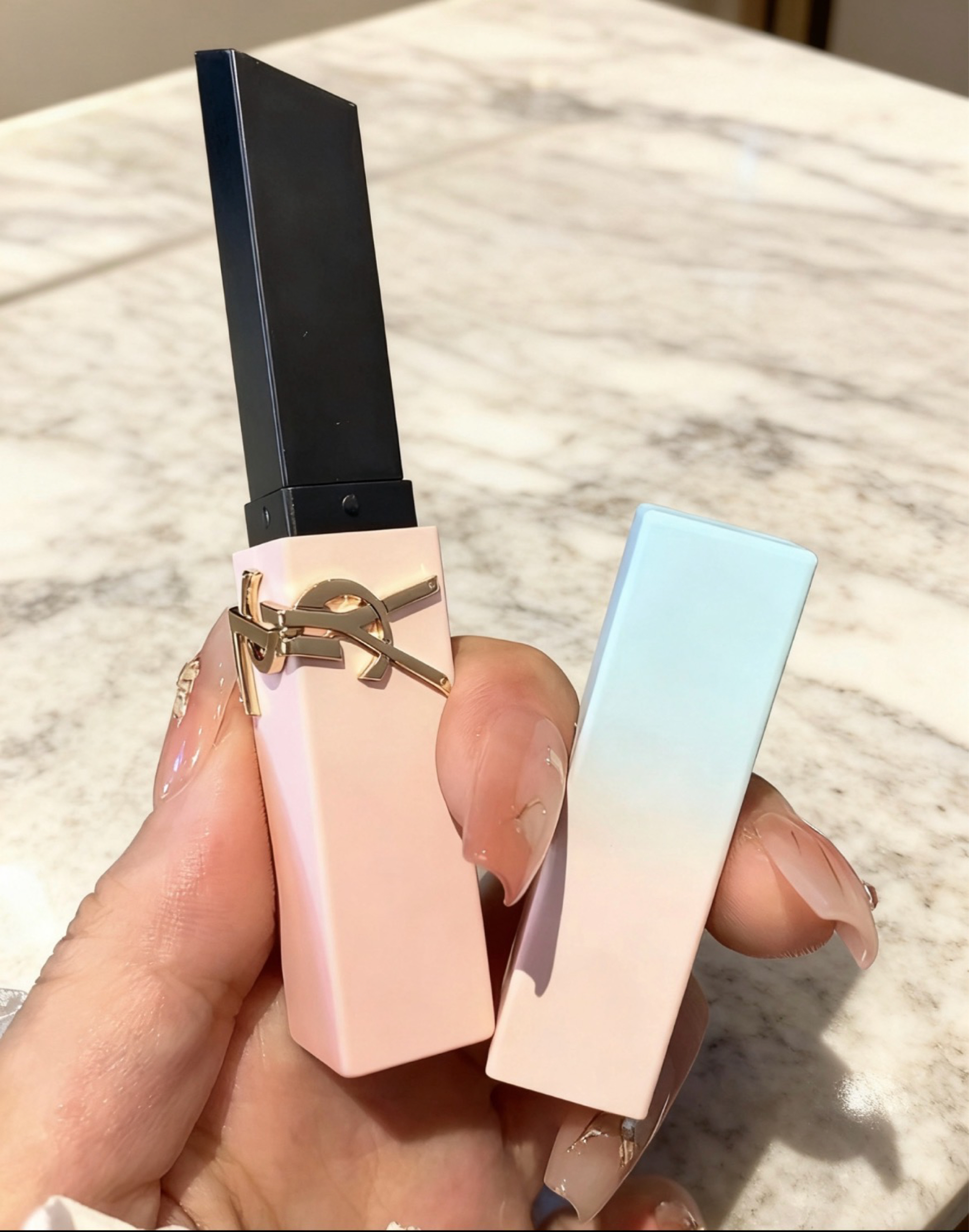 谁懂啊!YSL新出的粉管系列直接戳中我少女心💕 拿在手里像握着马卡龙,樱花粉外壳配金色logo,精致到舍不得用!旁边渐变蓝粉的小方管也巨嗲,光看包装就疯狂心动,这颜值放在化妆包里都是视觉享受~ 涂上嘴更是惊喜,质地润到像涂唇膏,颜色也很nun,黄皮姐妹闭眼冲,素颜涂都很提气色,现在出门必带它,补妆都变成享受啦