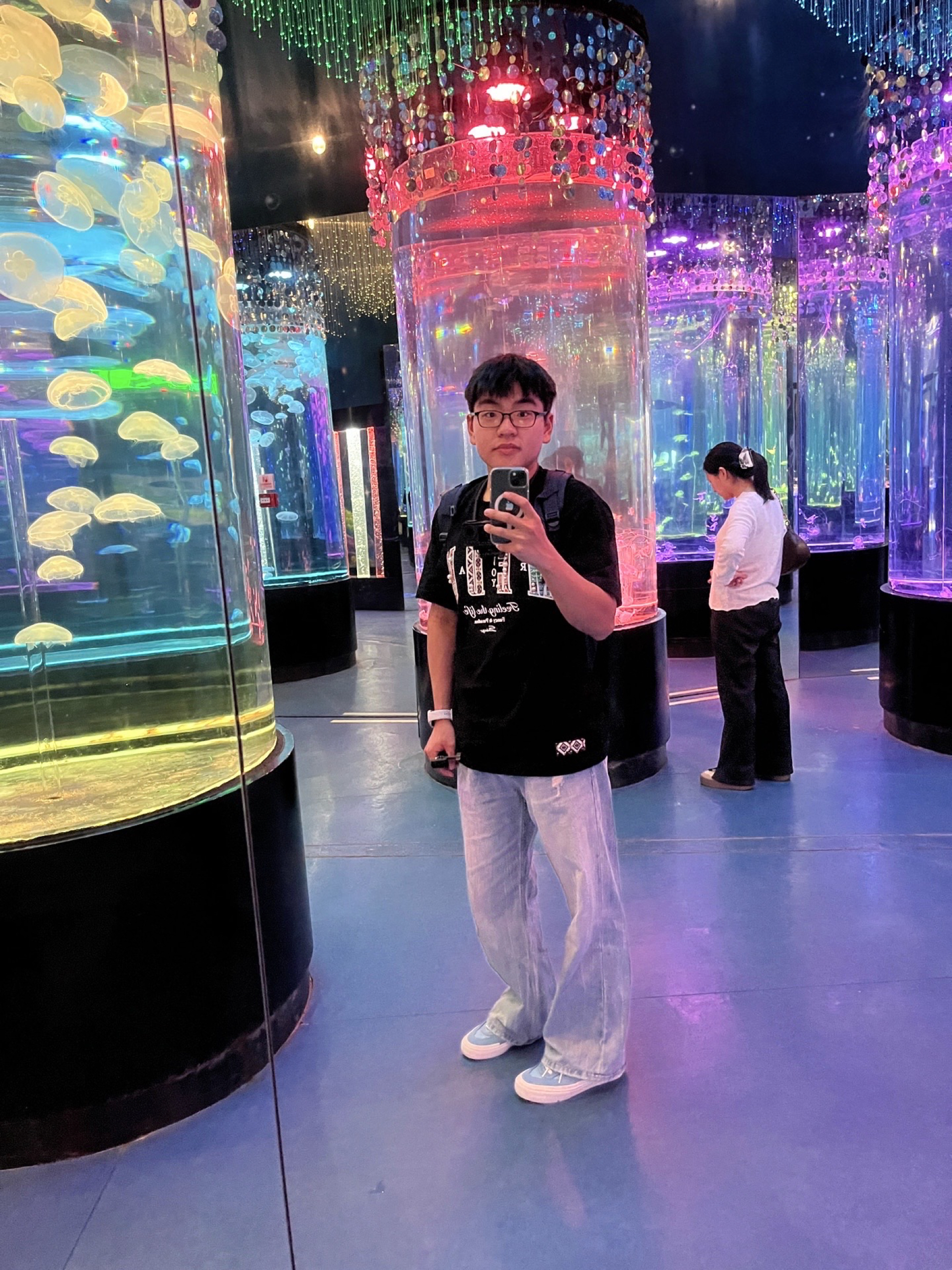 今天去逛海洋馆,灯光一打氛围感直接拉满~ 身上这件MEDM 珍珠民族风设计潮牌时尚潮流美式宽松百搭休闲圆领短袖T恤 是最近的新宠,黑T+白色印花低调又有细节,面料软乎乎的逛一天都不闷; 裤子是suitedall2021m浅灰色巨显腿长,垂感刚好不会贴腿,搭配白鞋清爽又有少年感,和海洋馆的彩色灯光超搭!