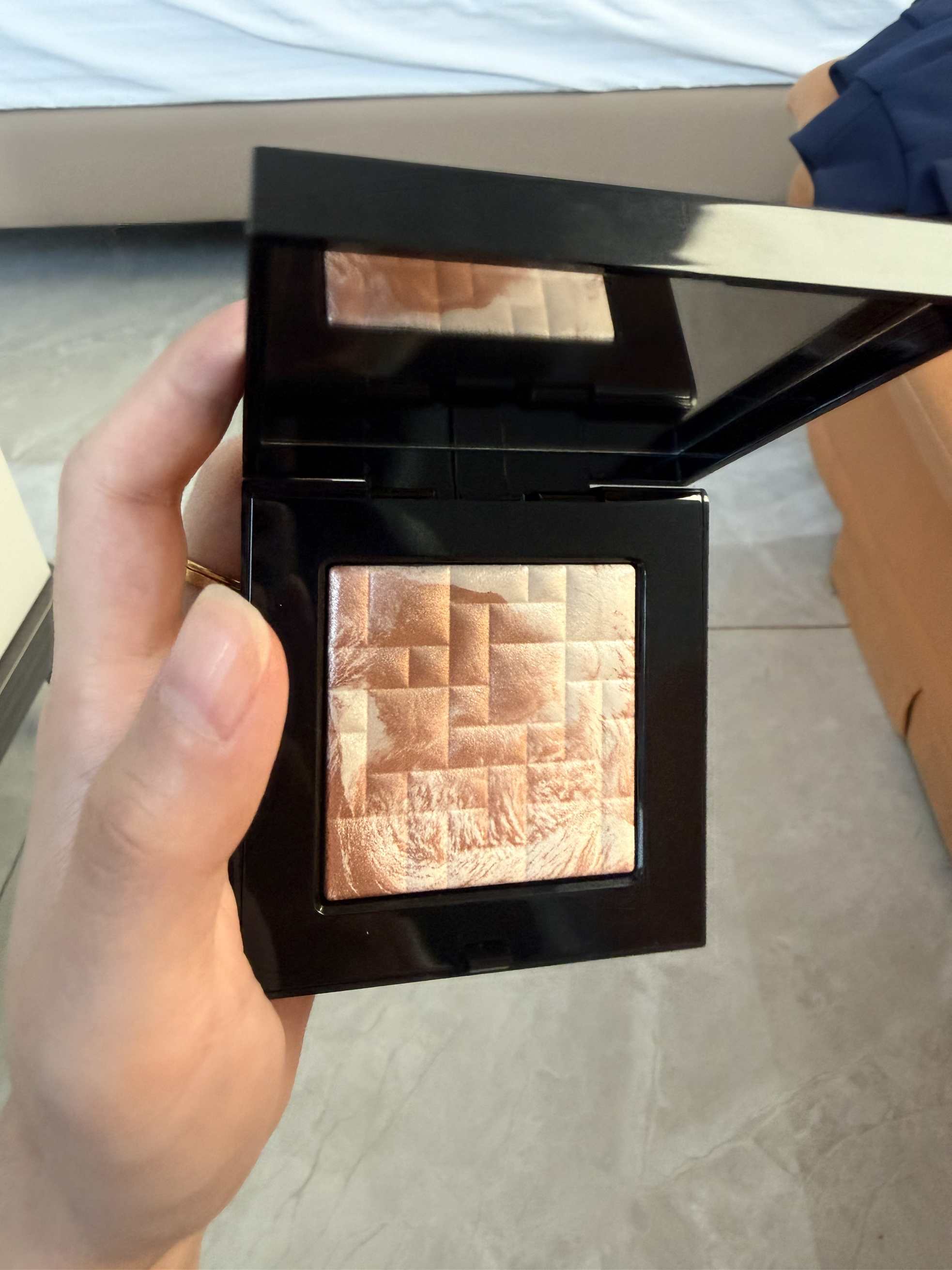 一直都很想买它,但又一直犹豫,看到科普总是说它是高光界顶流,嗯嗯嗯,那我总要试一下了,终于下手了,果然,上脸后是看不到粉感的,很细腻又有光泽,真的很棒,只有闪闪没有一点粉感!!!我是用刷子感受的,如果用手指在手上摸还是有点小粉感的。