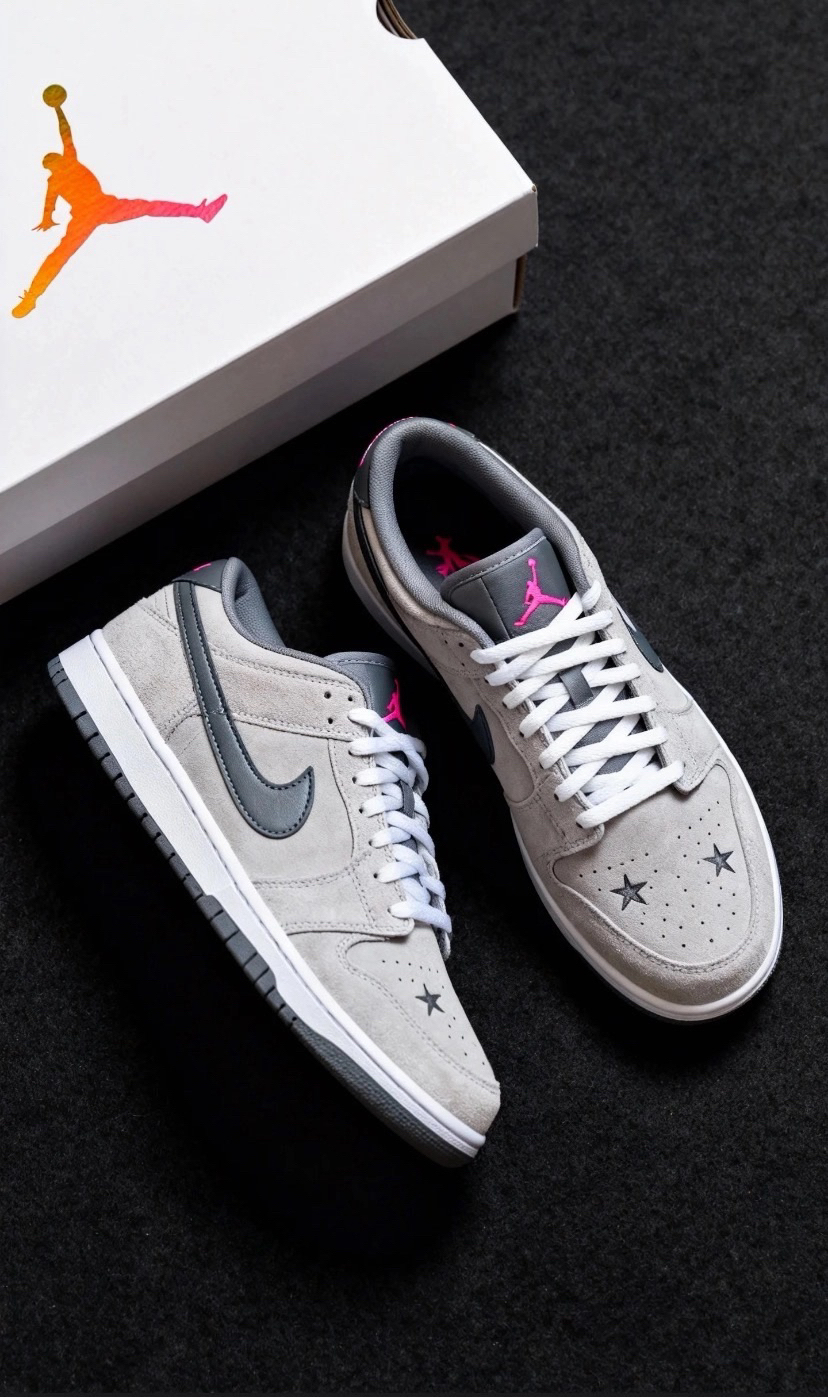 刚拆箱就被麂皮鞋头的星星刺绣戳中——浅灰底色+细密的星星纹理,温柔又藏着小心机;最绝的是霓虹粉毛绒Swoosh,摸起来软乎乎像rua小毯子,秋冬穿自带暖乎乎的氛围,连鞋跟的包边都是同色系毛绒,细节控狂喜!