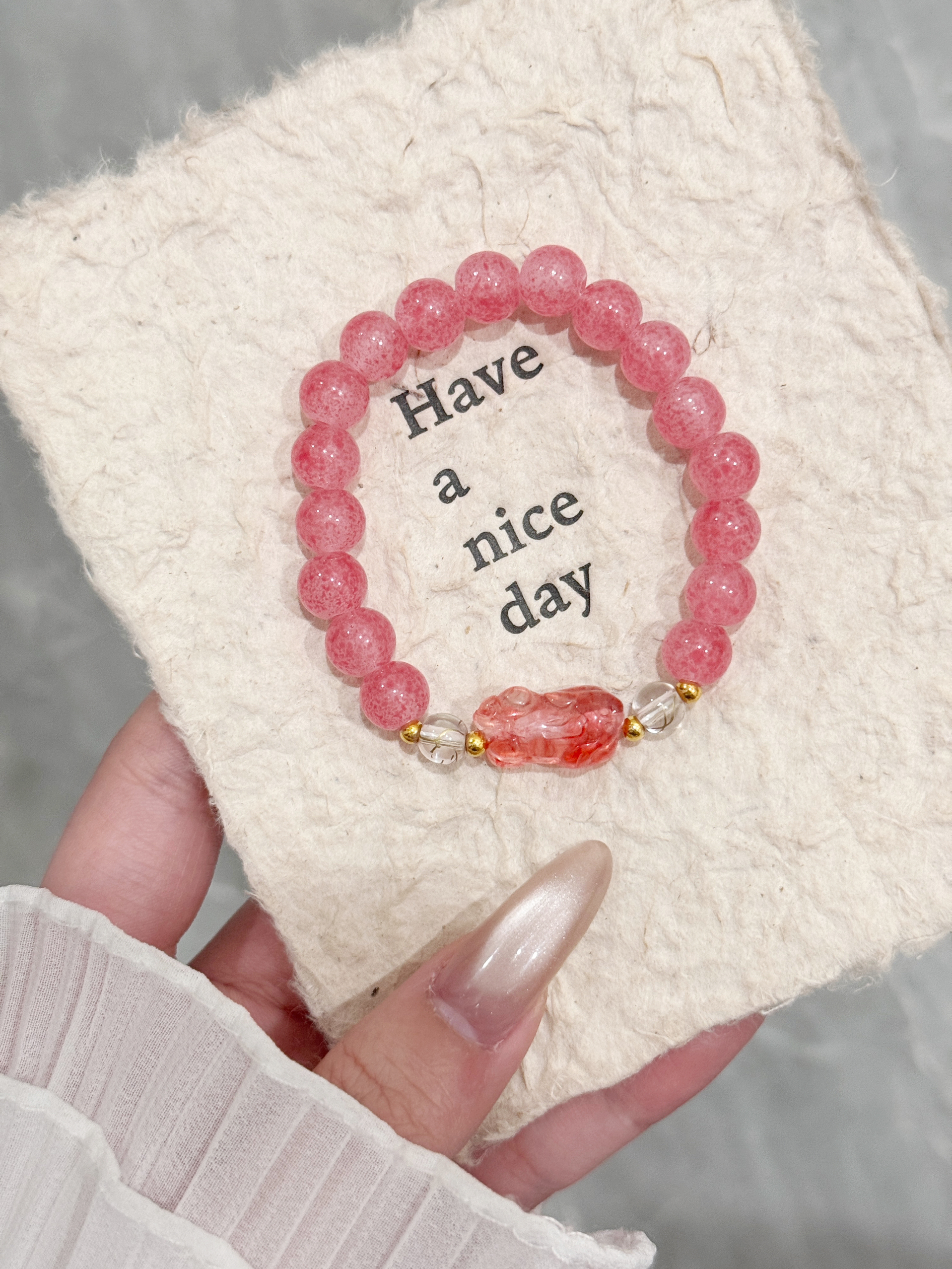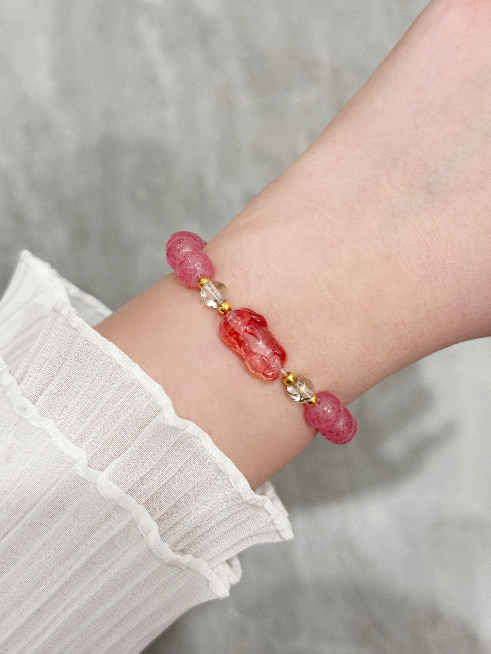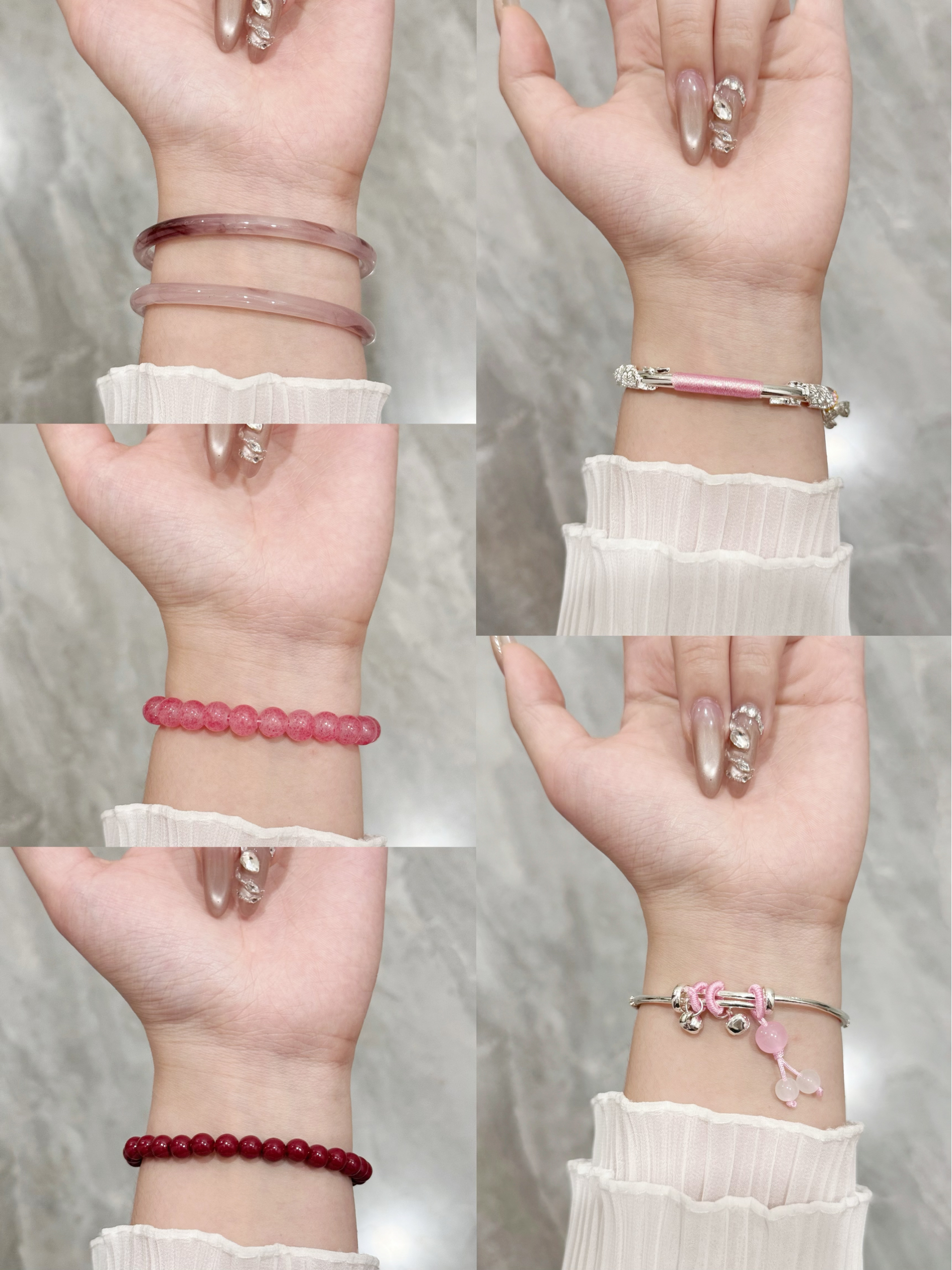 谁能拒绝这抹软乎乎的粉? 粉晶镯叠戴自带清透氛围感,像把揉碎的晚霞缠在手腕;草莓晶手串透着清甜的少女感,衬得肤色都软嫩起来;银镯配粉绳的细节,又甜又灵,抬手间都是温柔的小亮点~ 不管是搭软乎乎的毛衣,还是简约衬衫,这几款都能悄悄提升精致度,日常戴不夸张,送自己送闺蜜都刚好戳中审美~