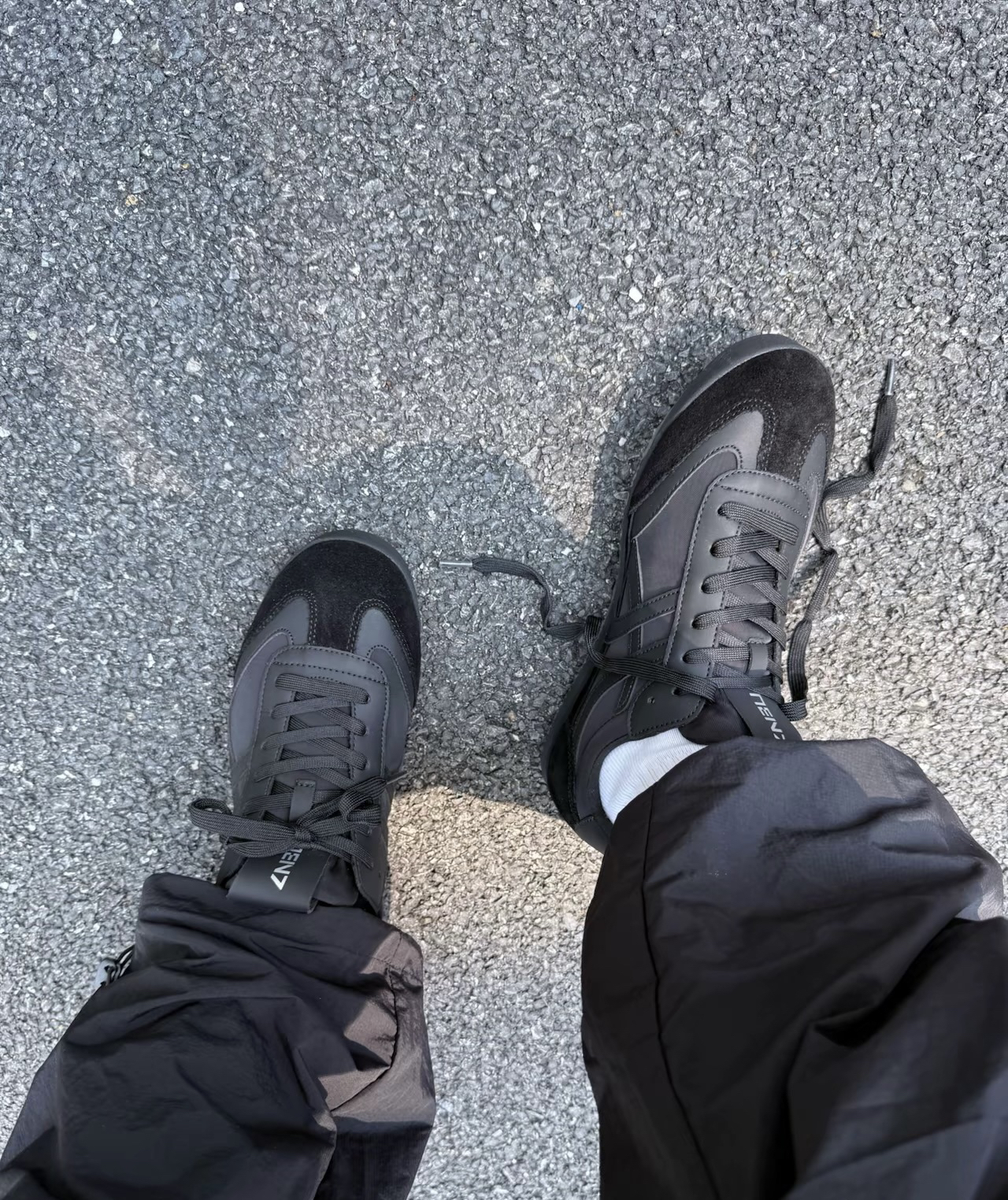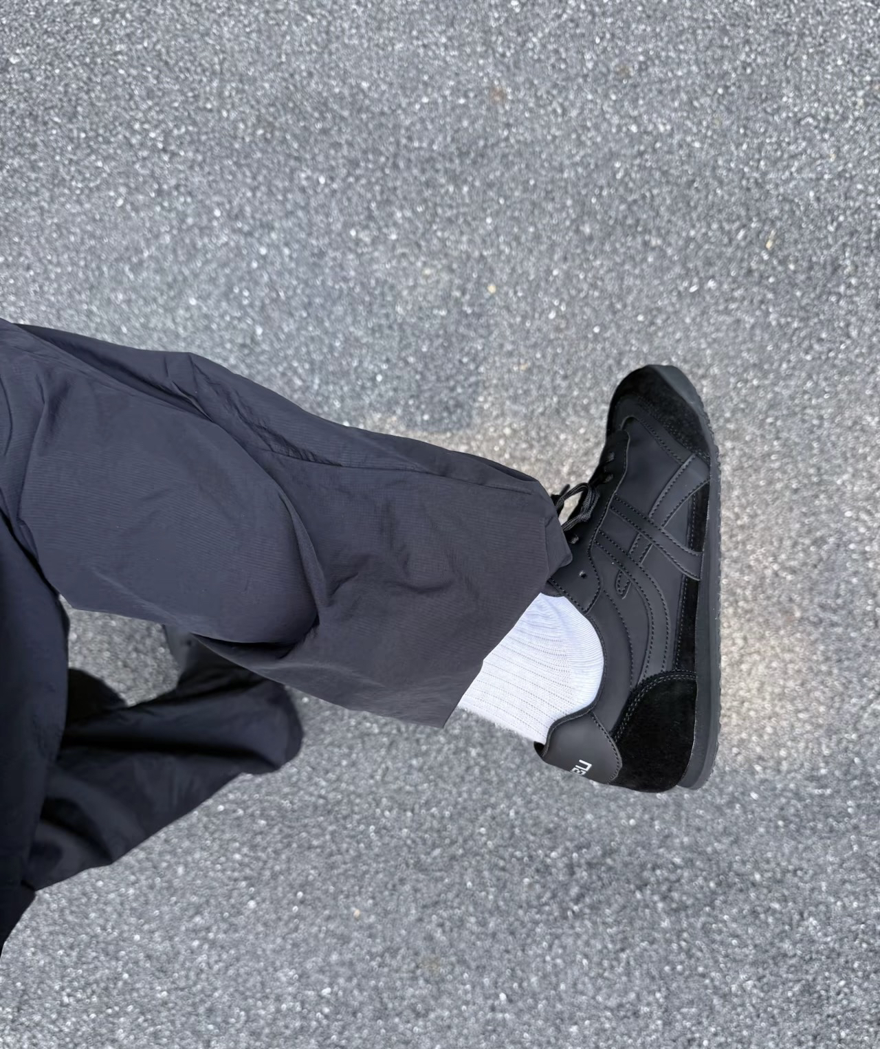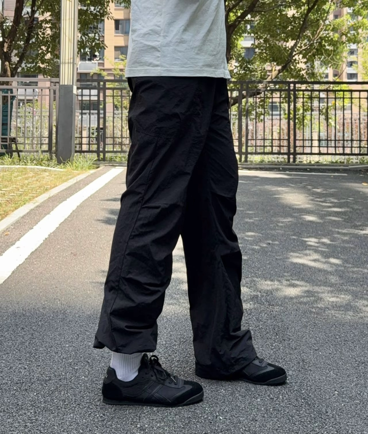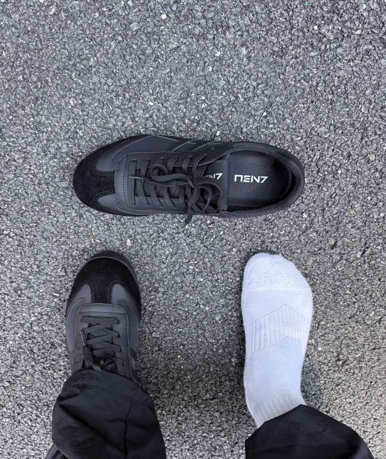 分享一双比较实用的鞋子 ANBU 阑夜黑色德训鞋👟 橡胶鞋底比较防滑耐磨 鞋面采用了一个皮革拼接设计🌟 不仅有质感还透气 日常出勤久穿🦶也不会闷啦 我搭配的是一条同色工装裤 偏松弛风 有种随性的帅气💭